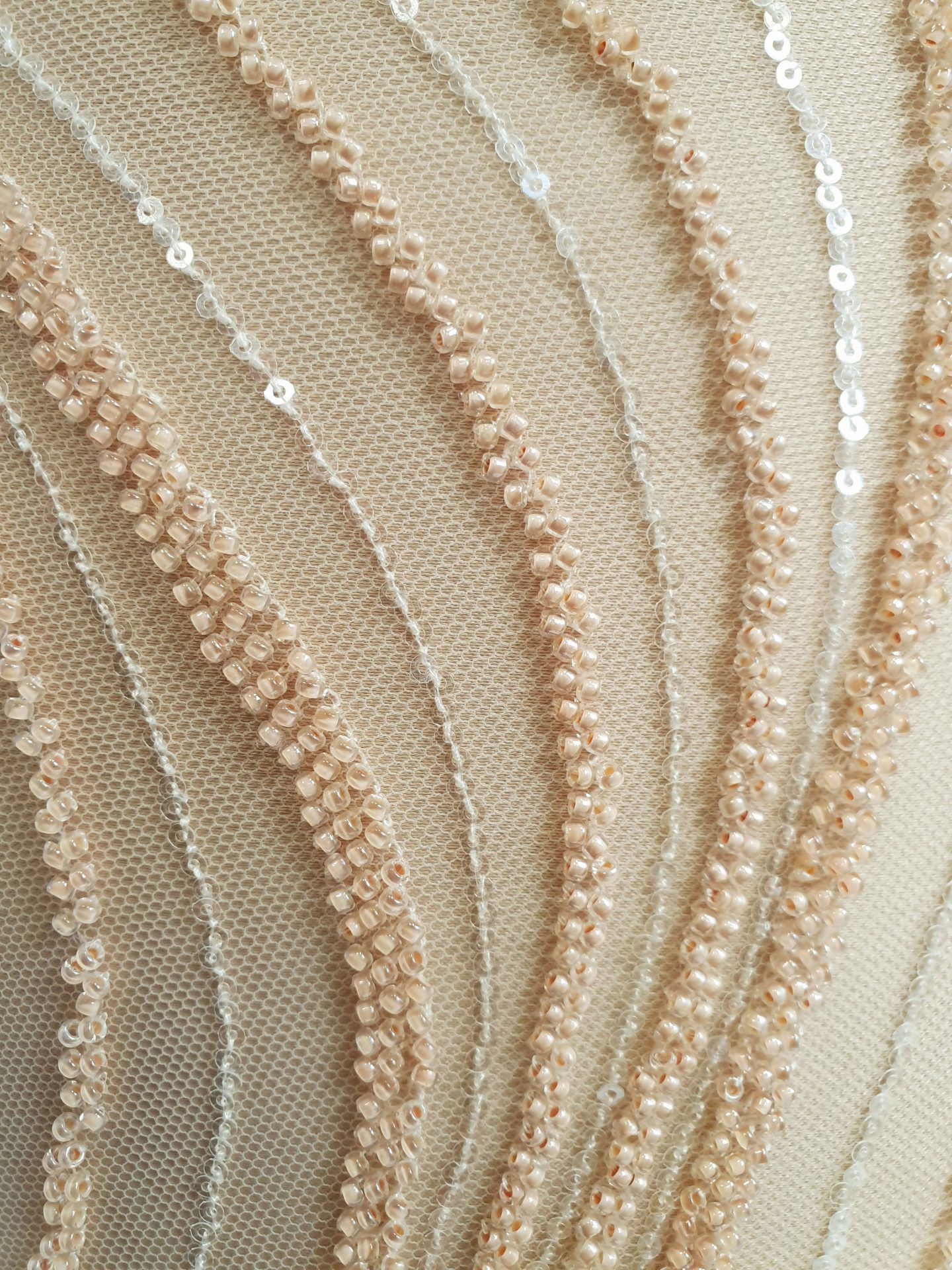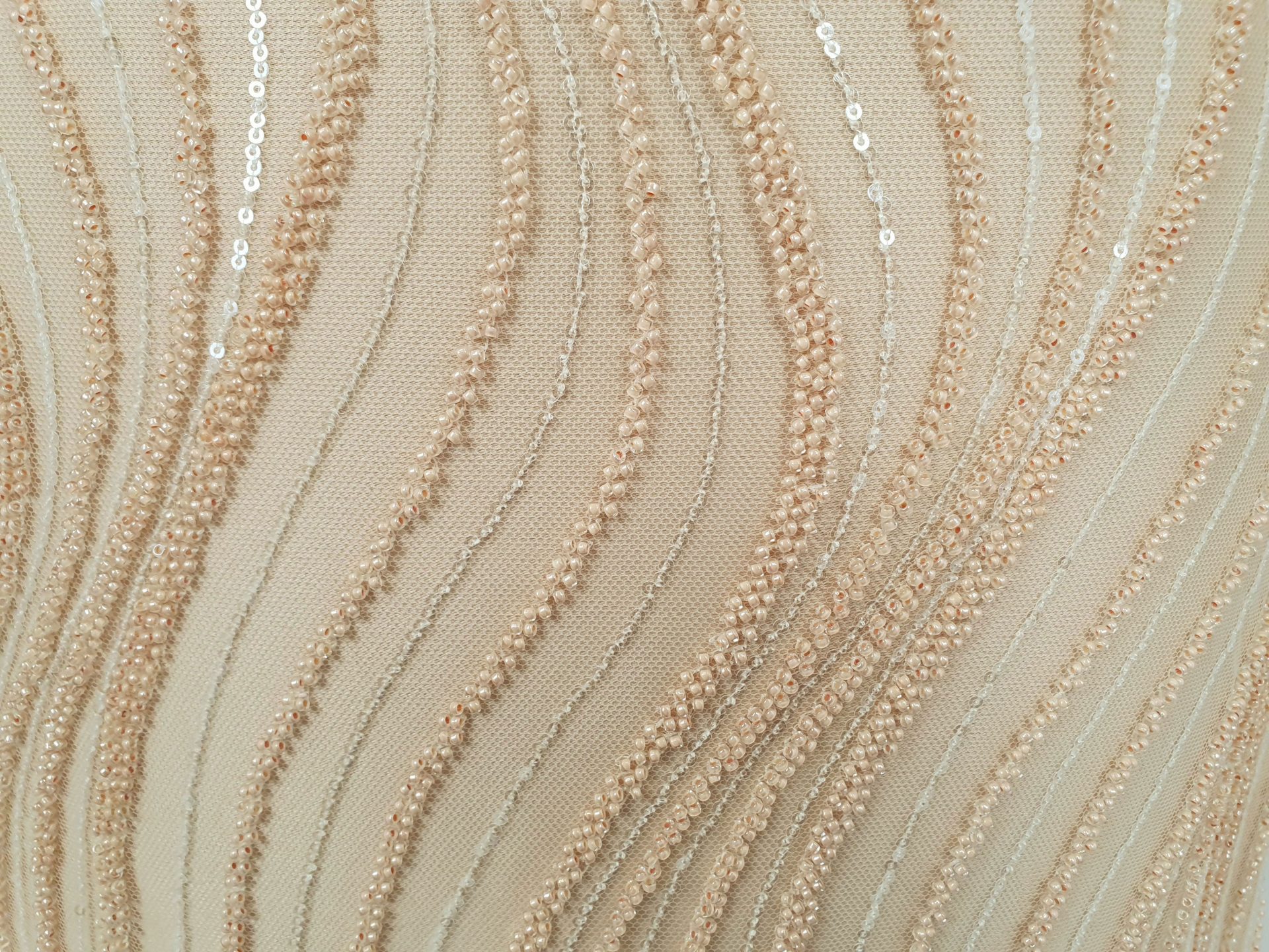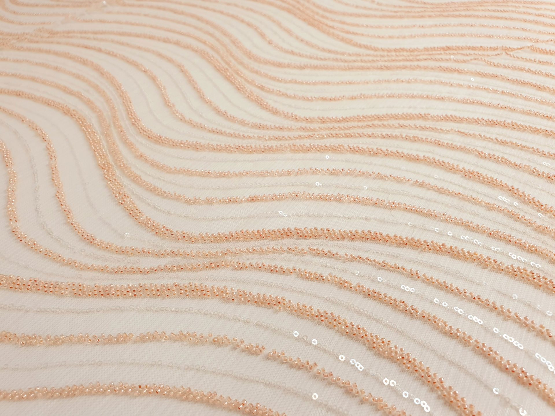 Broderie cu linii curbate din margele peach si paiete, cusute pe tul nude, usor elastic.