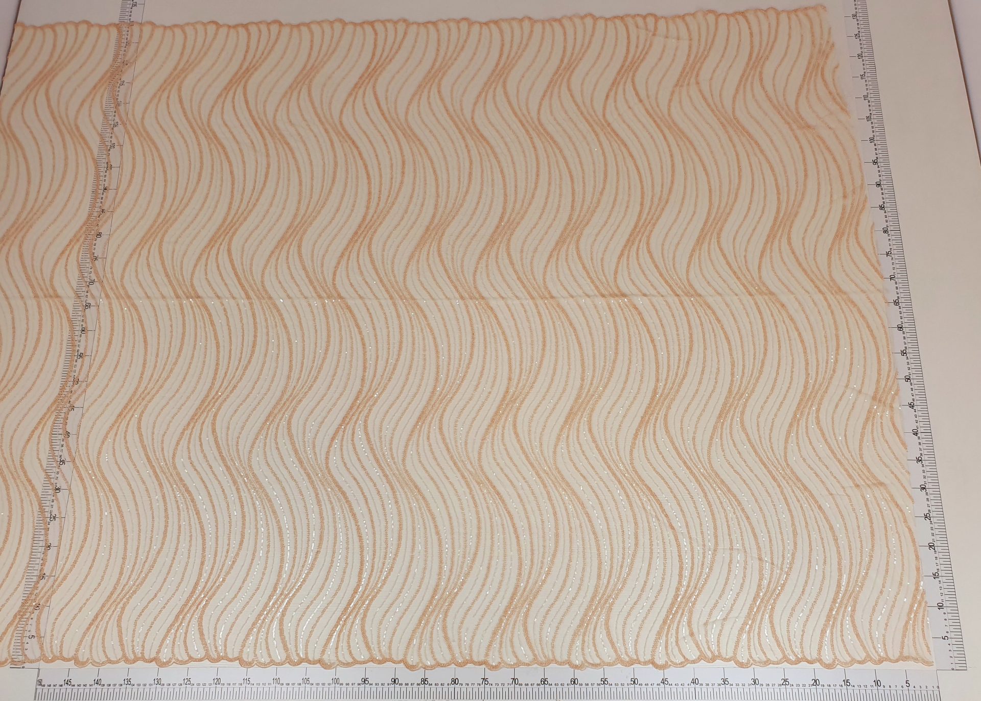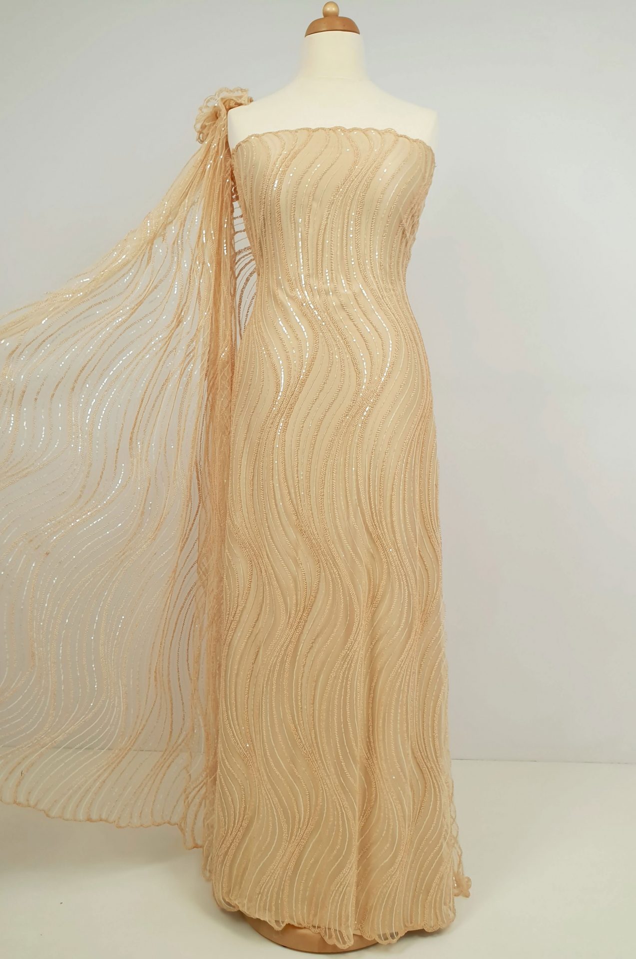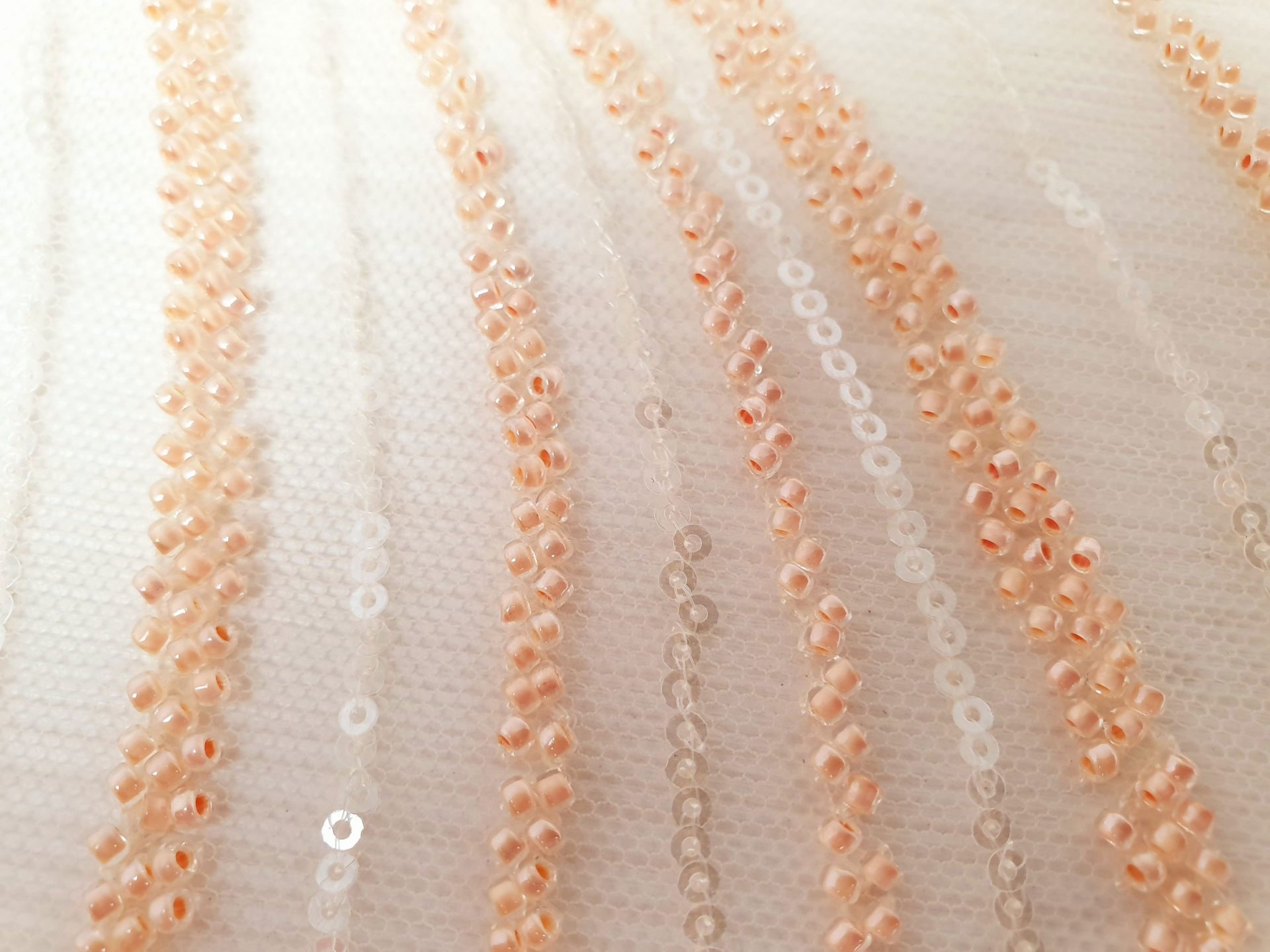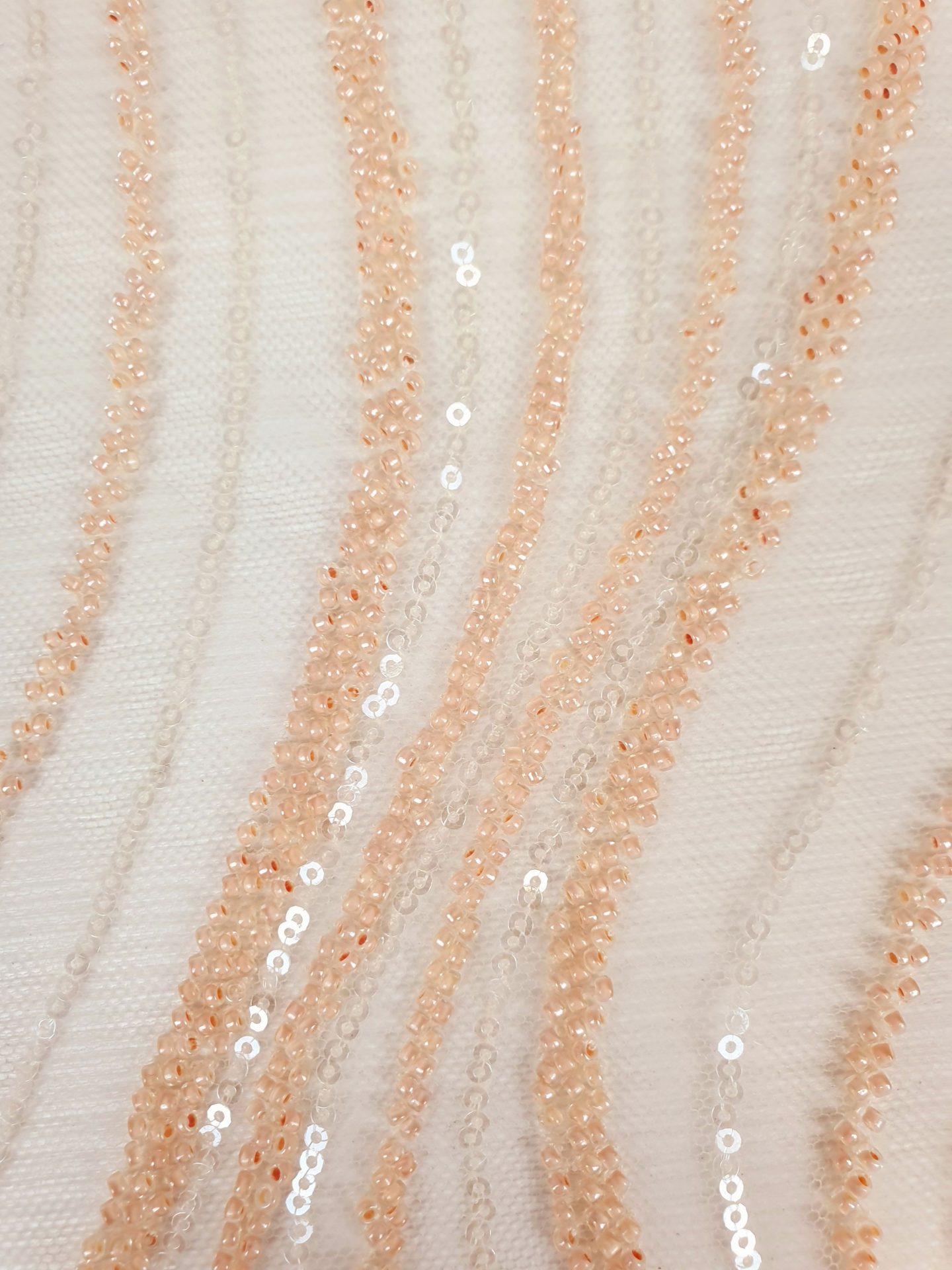 Broderie cu linii curbate din margele peach si paiete, cusute pe tul nude, usor elastic.