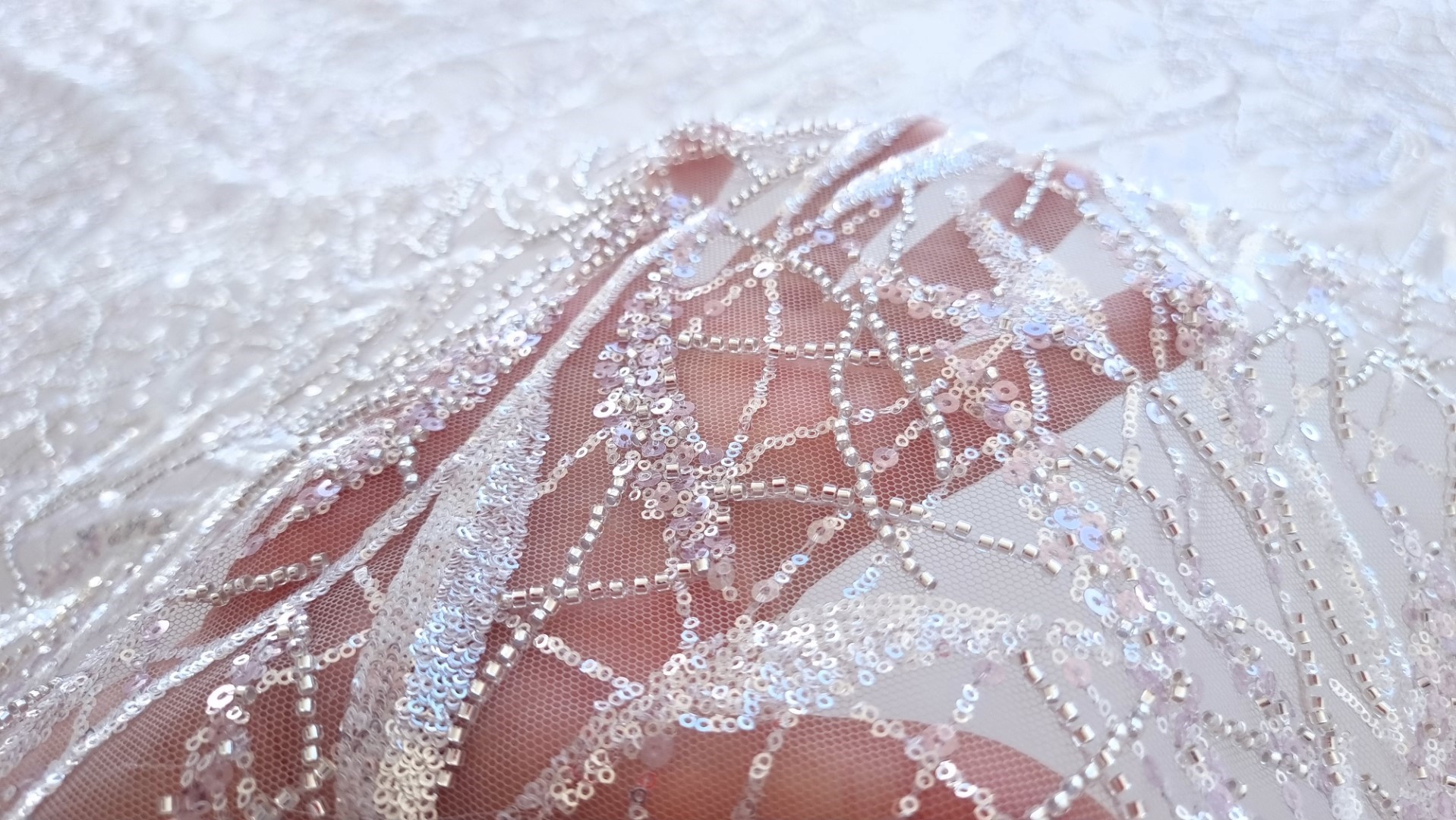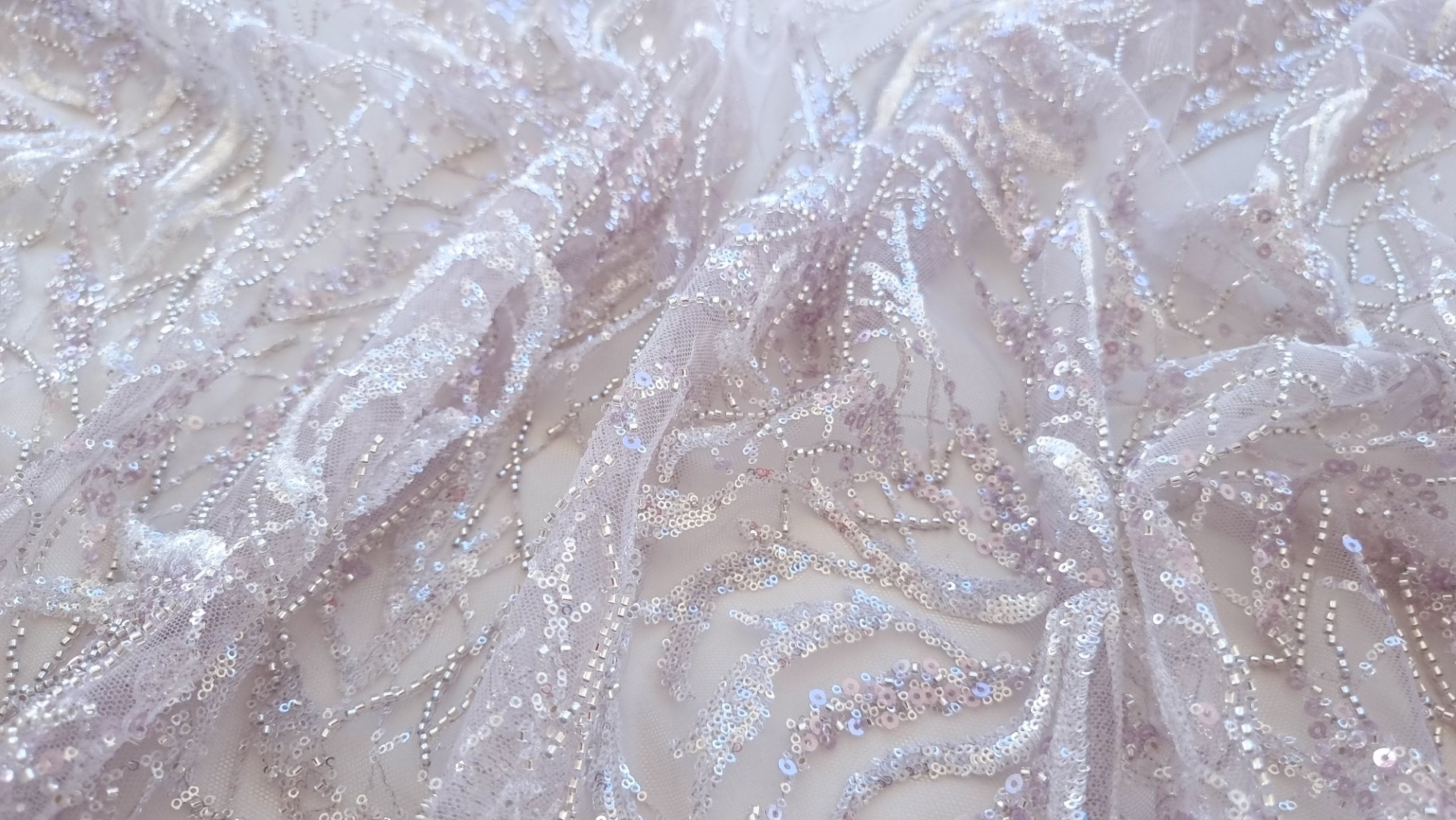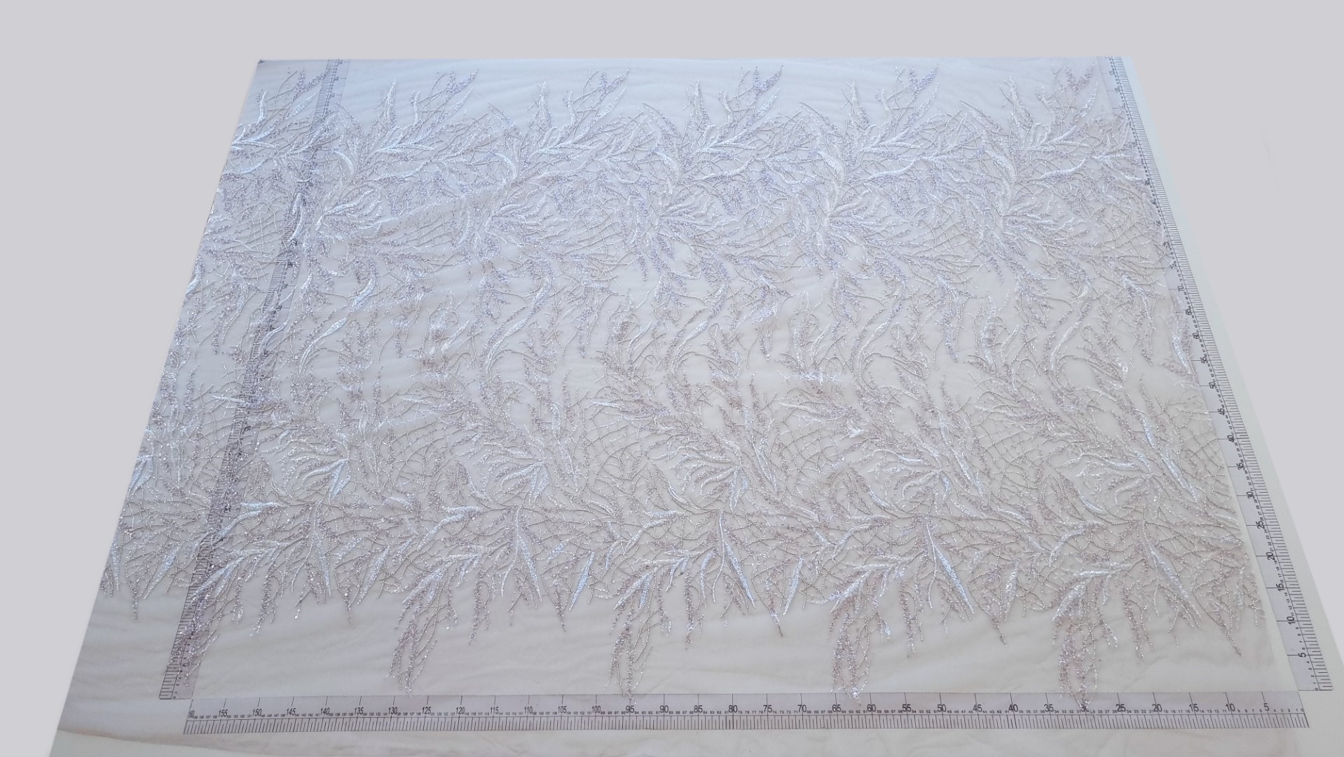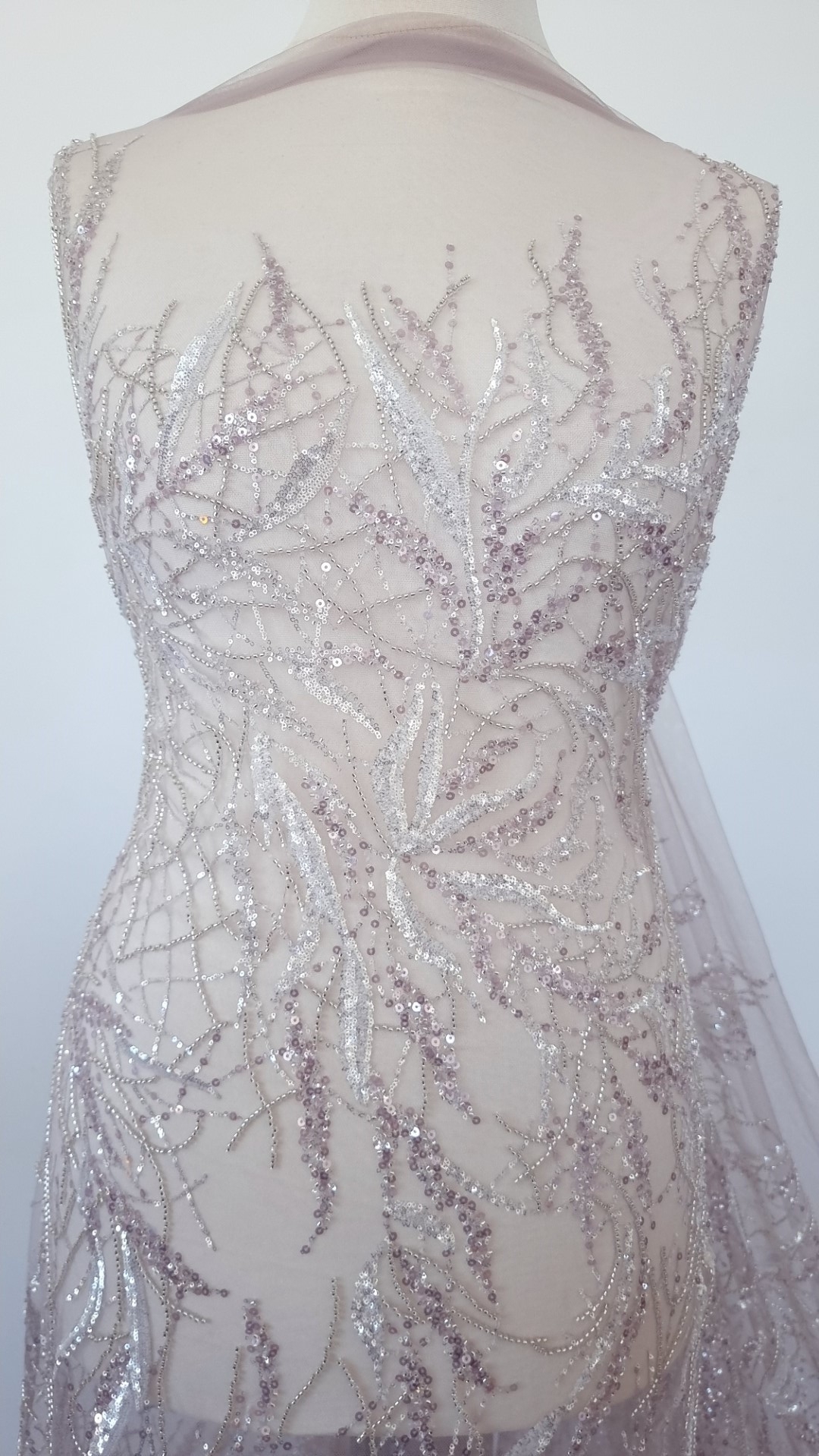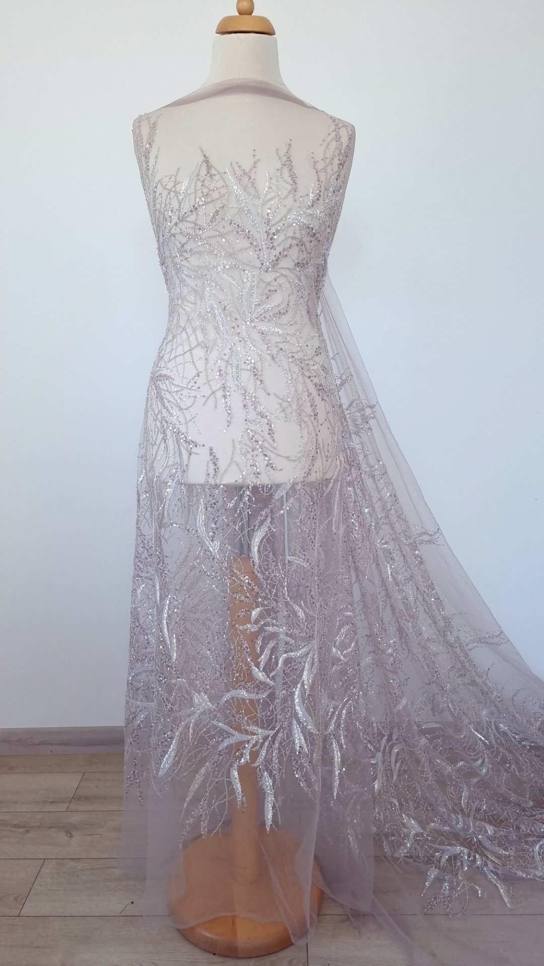 Broderie lila prafuit si argintiu pe tulle gri, usor elastic.