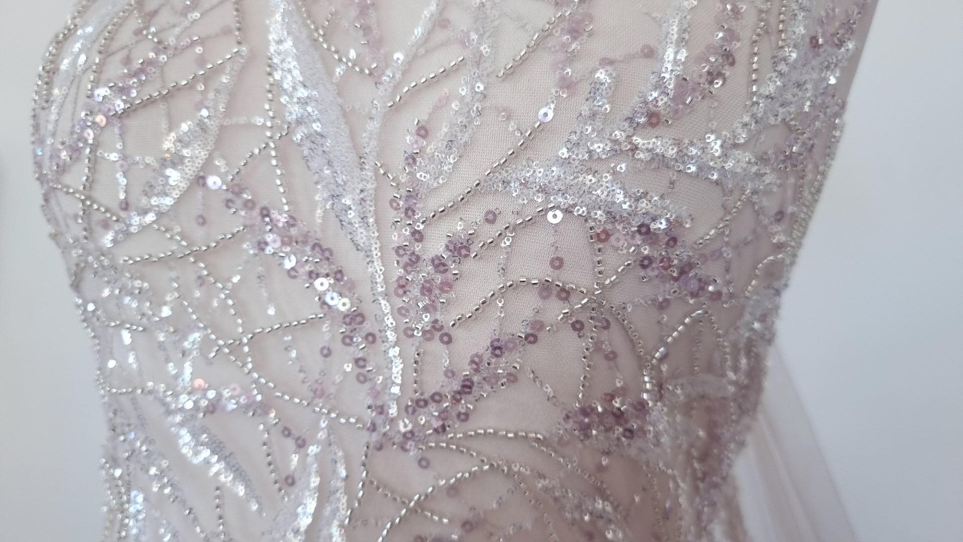 1 recenzie pentru Broderie lila prafuit si argintiu pe tulle gri