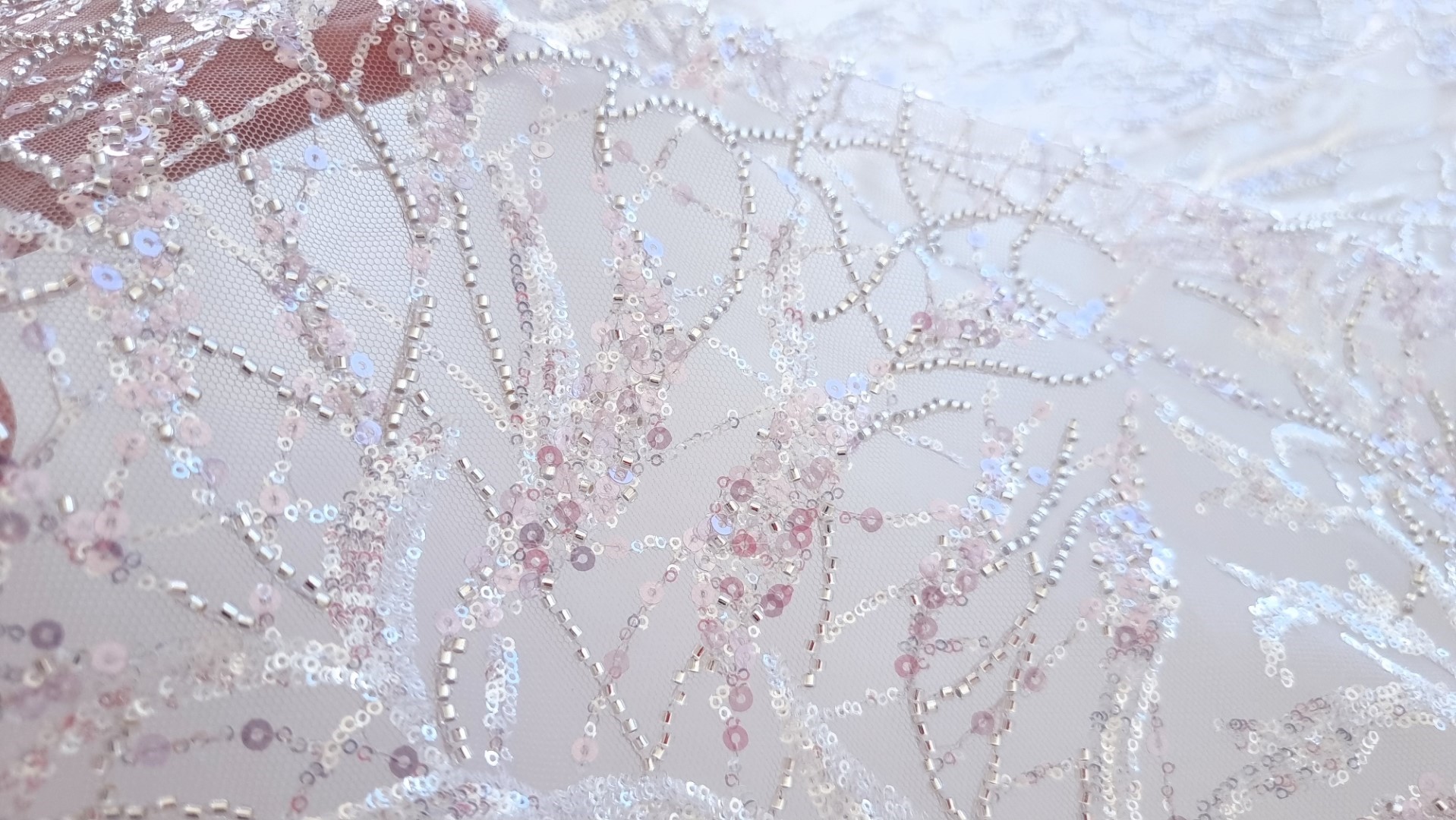 Caracterictici Broderie lila prafuit si argintiu pe tulle gri: