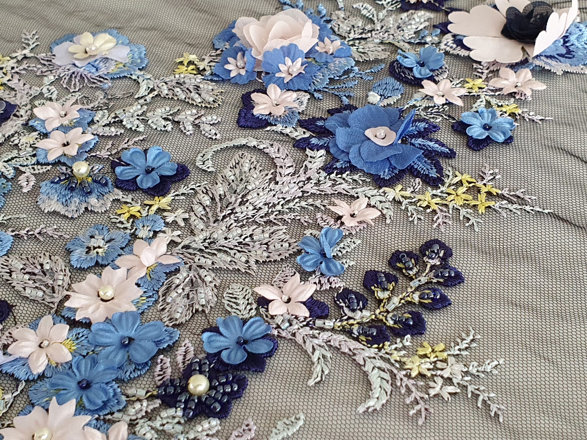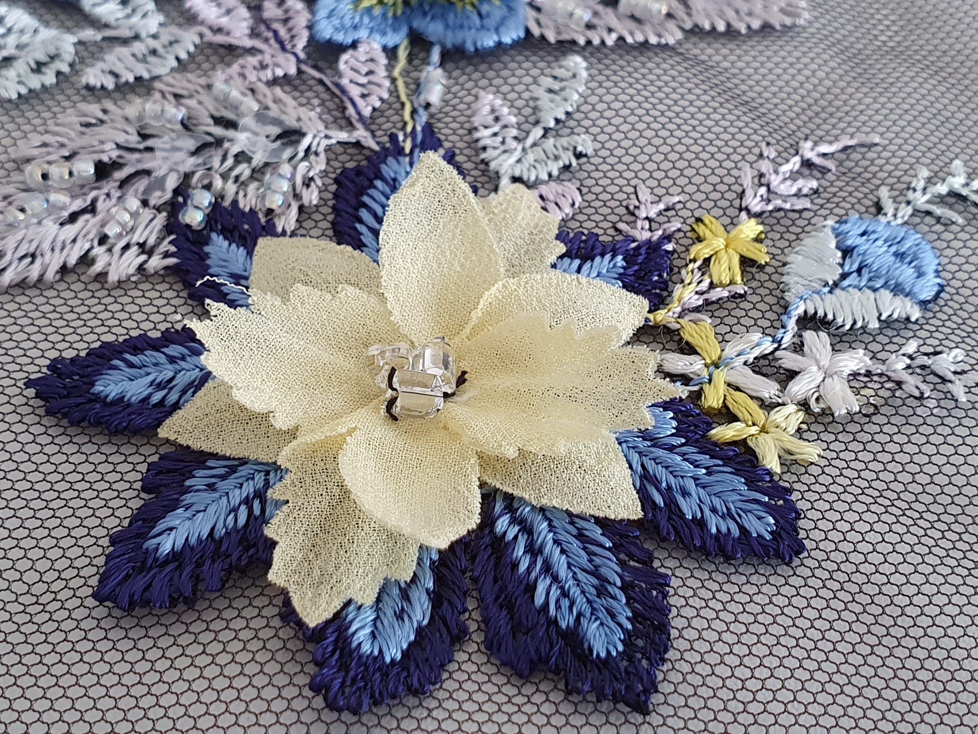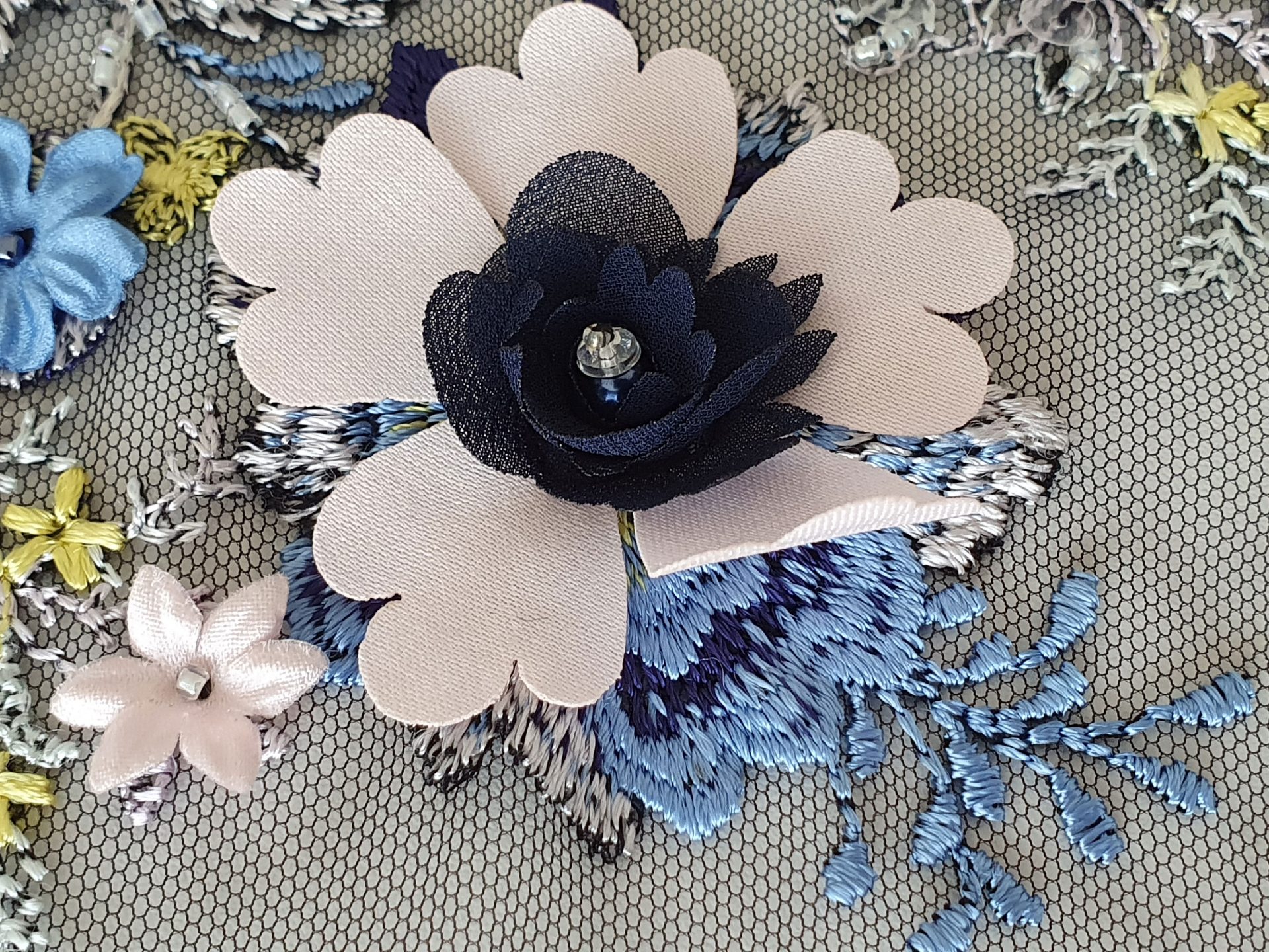 Broderie 3D blue&yellow, cu flori in tonuri de roz, bleu, galben de diferite forme si dimensiuni, accesorizate cu margele.