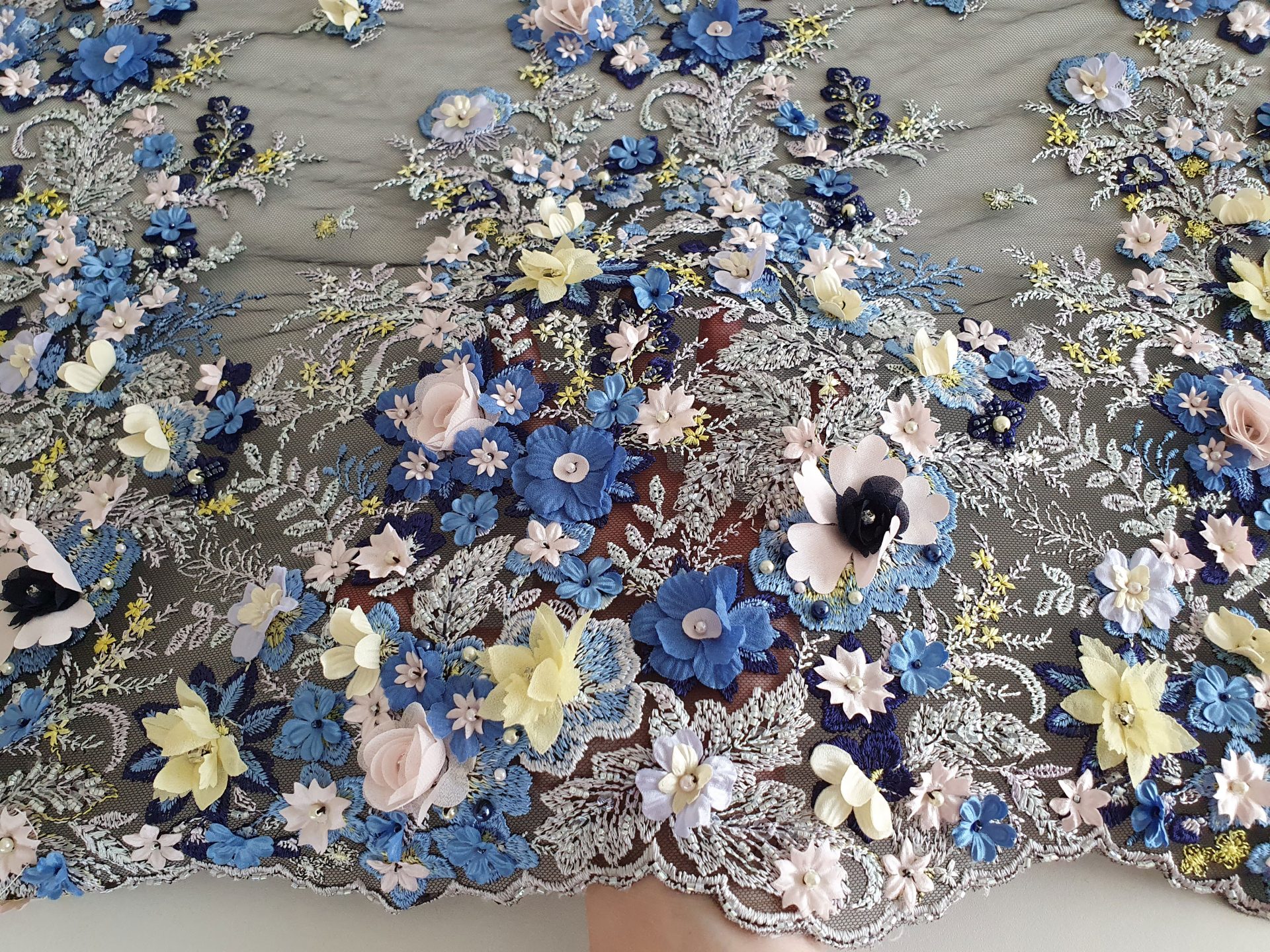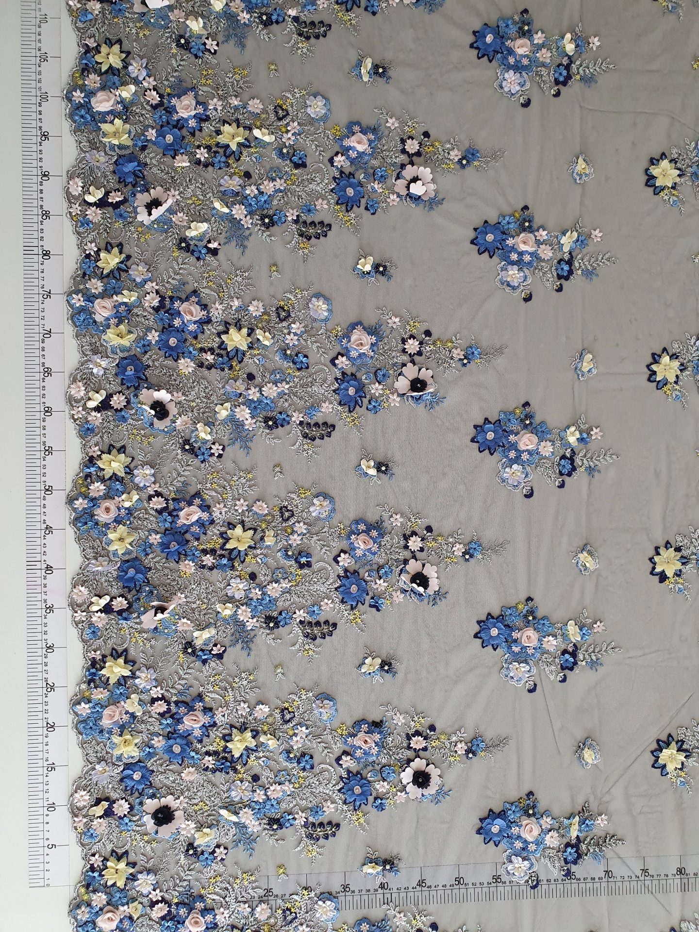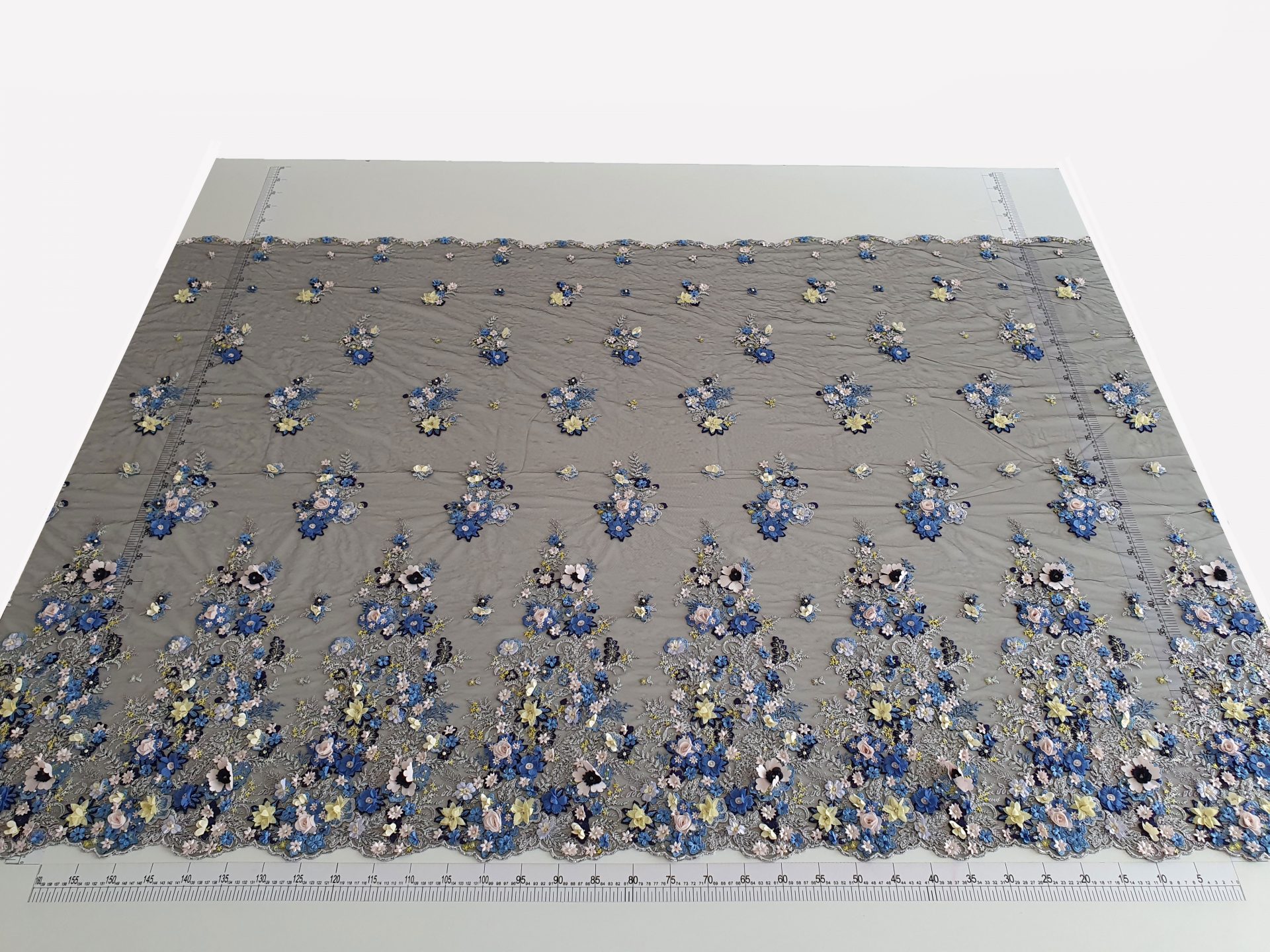Broderie 3D blue&yellow, cu flori in tonuri de roz, bleu, galben de diferite forme si dimensiuni, accesorizate cu margele.