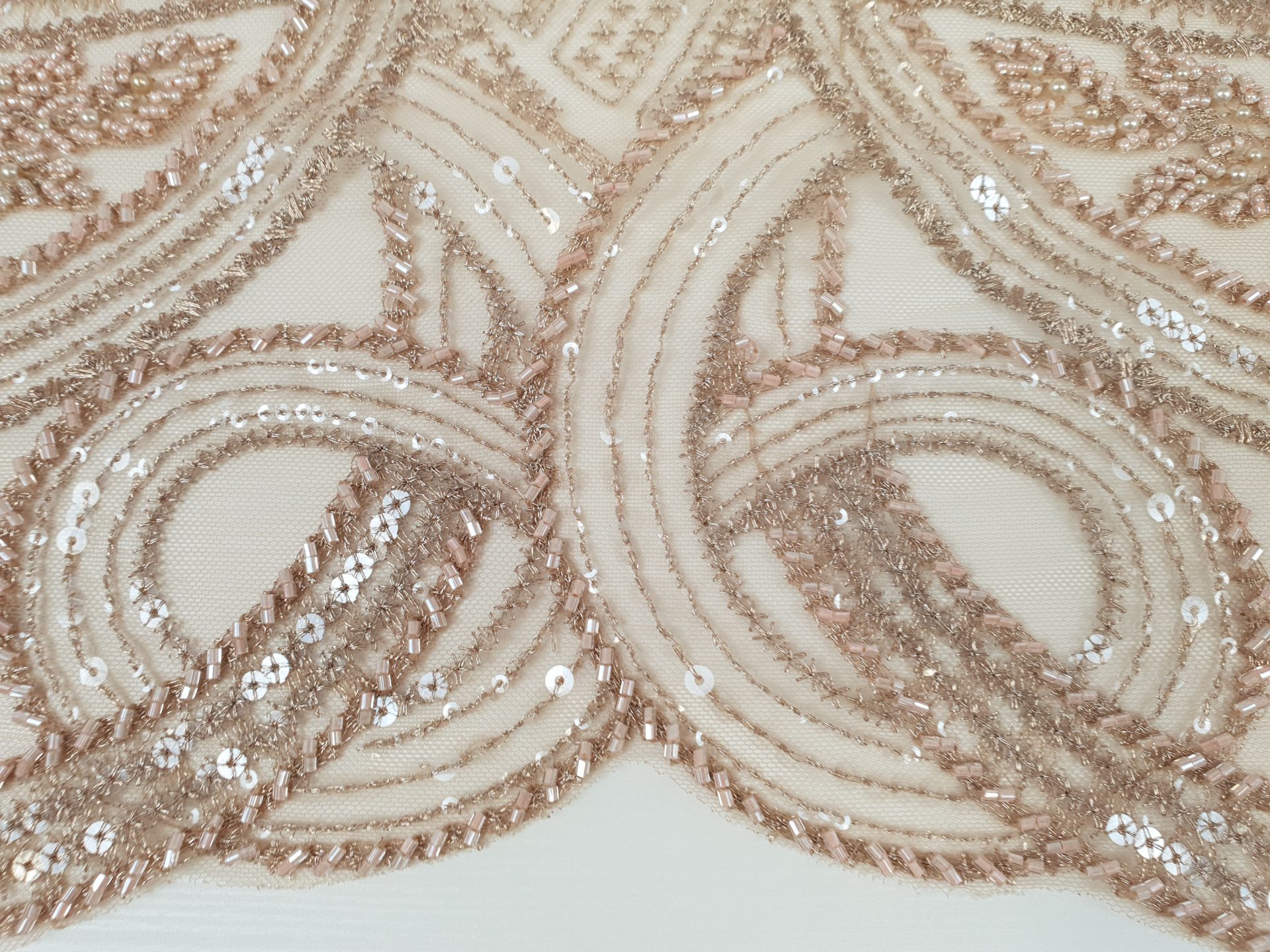 Broderie accesorizata cu margele rotunde, tubulare in ton cu broderie si paiete discrete, transparente.