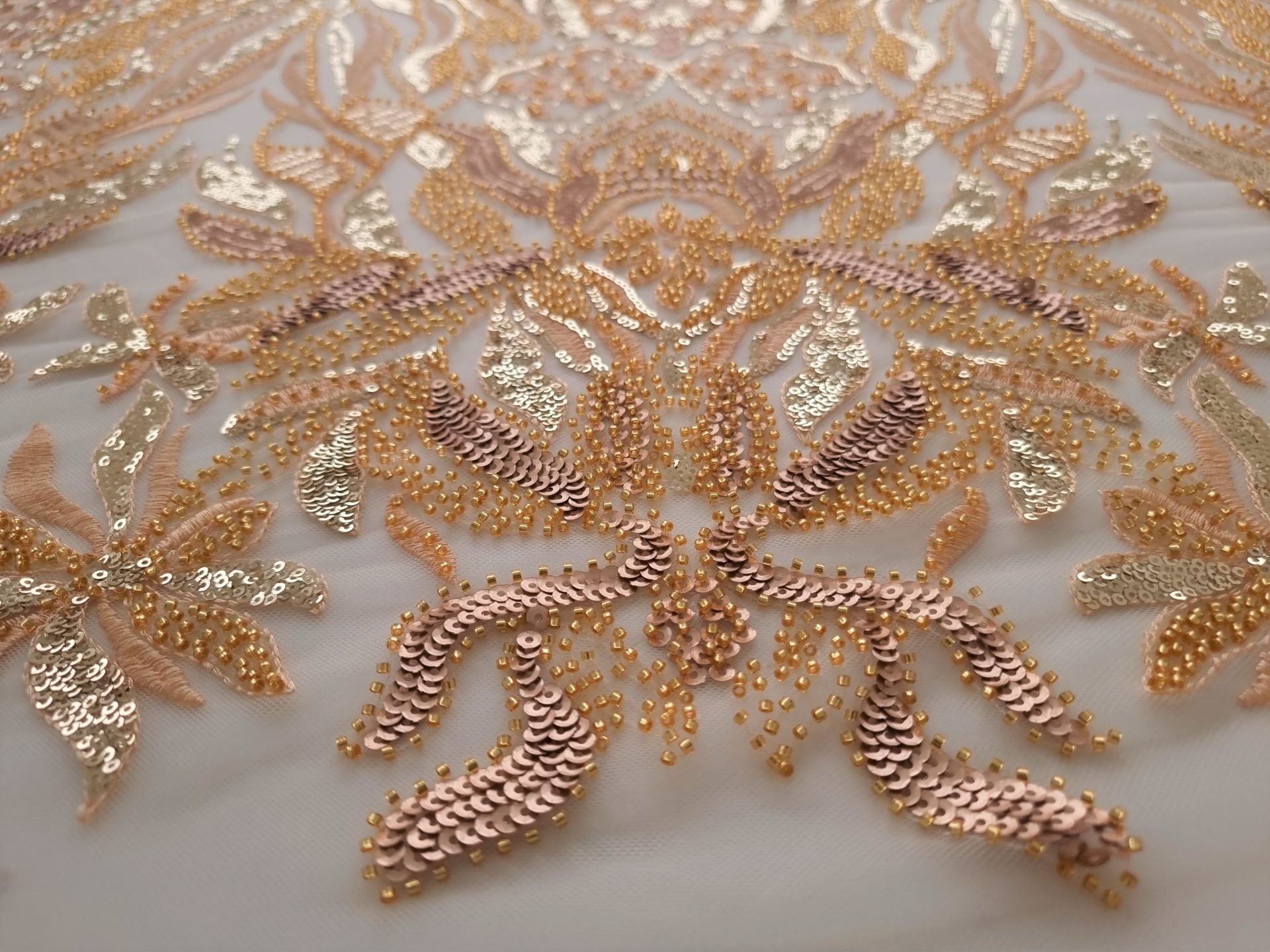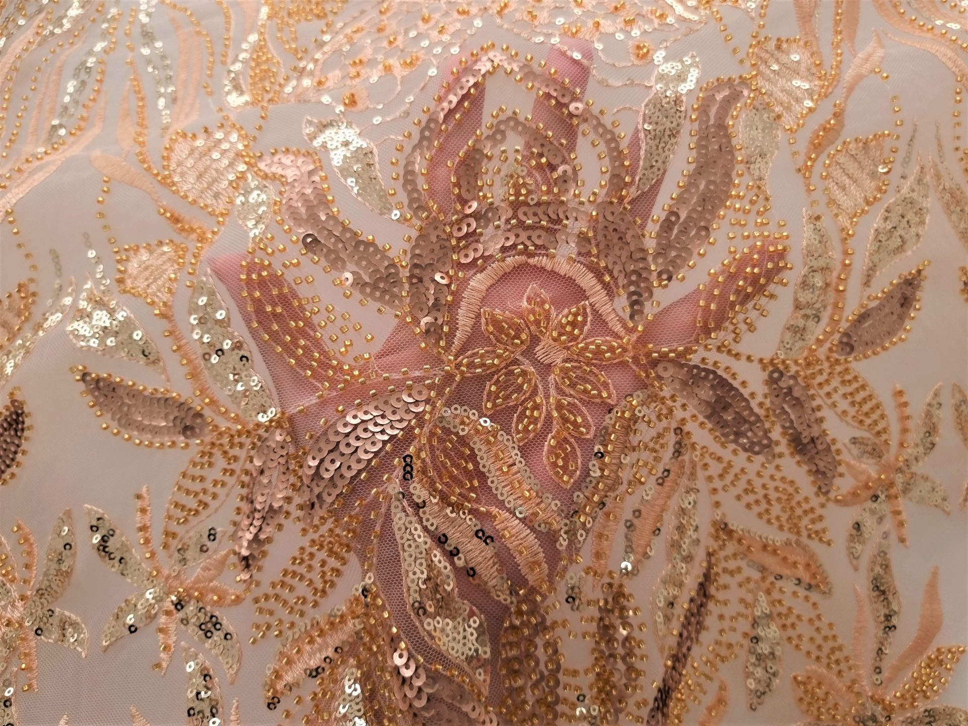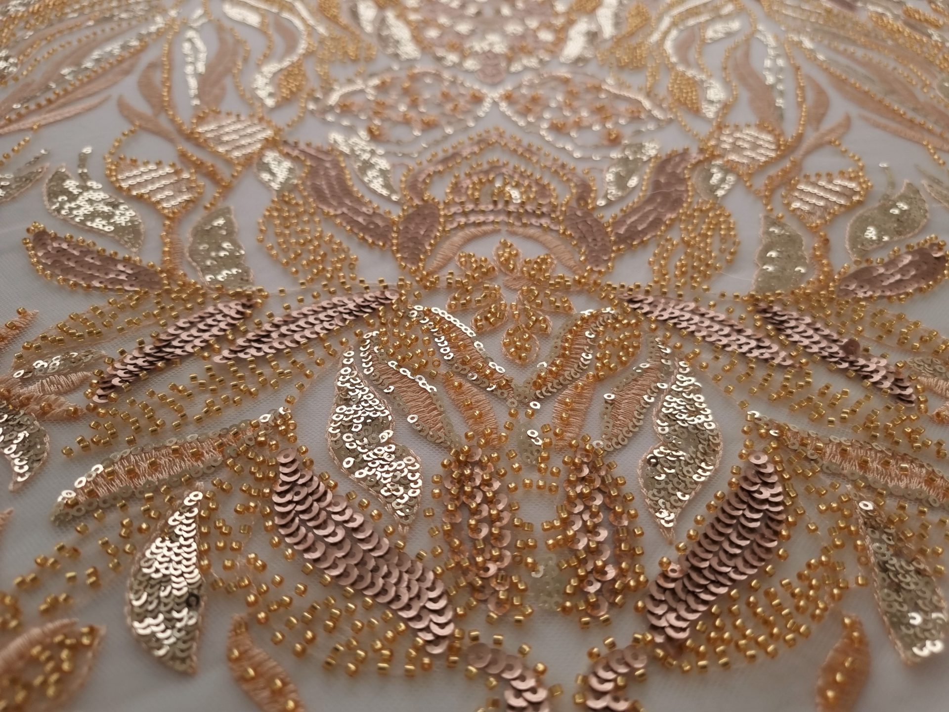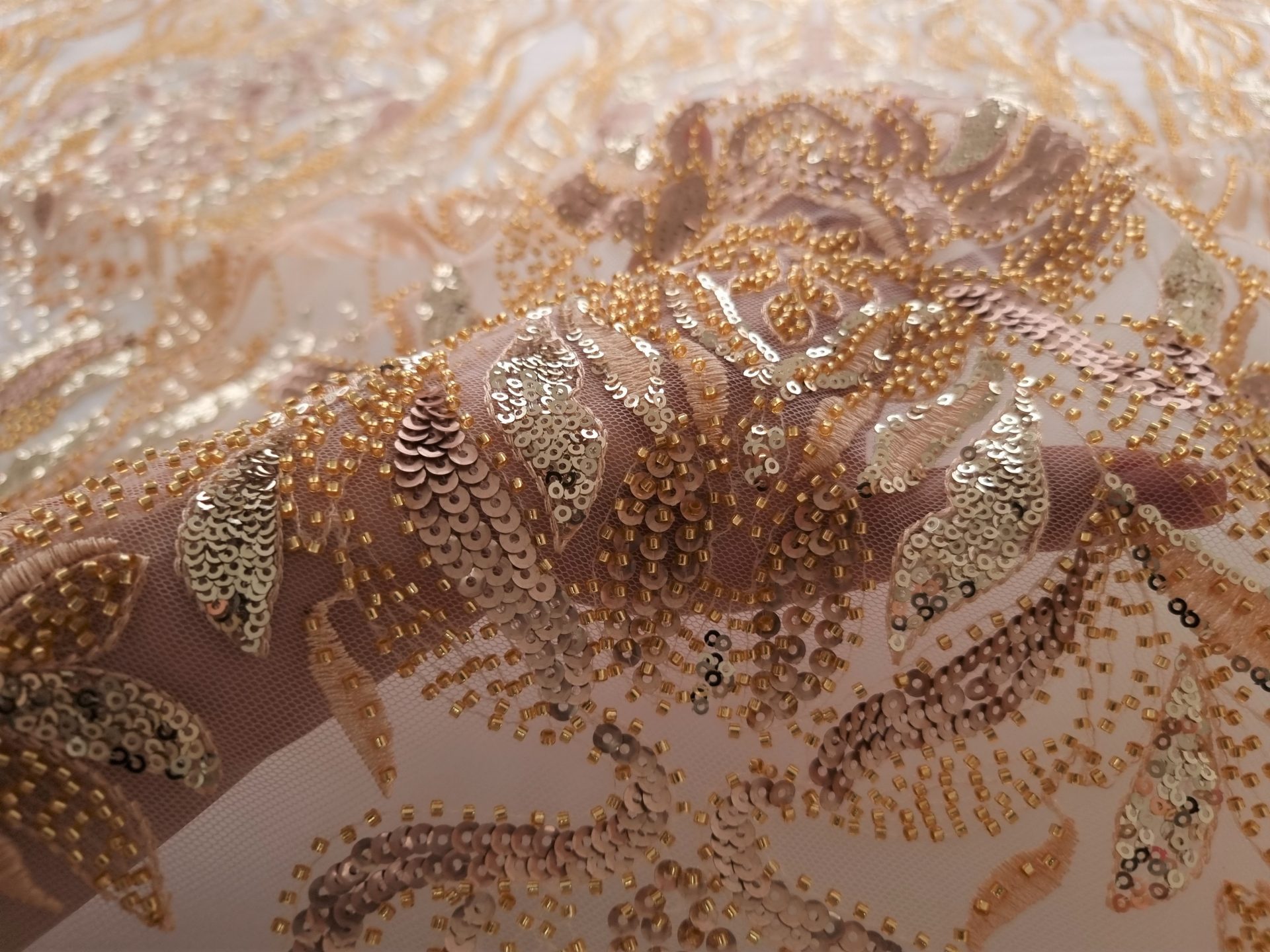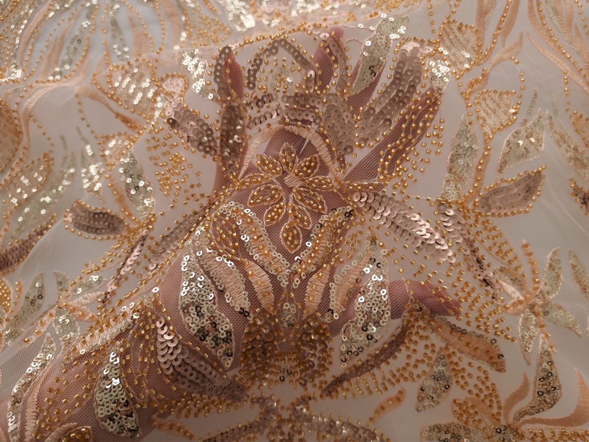 Broderie aurie accesorizata cu micropaiete si margele tubulare, pe baza de tulle nude, usor elastic.