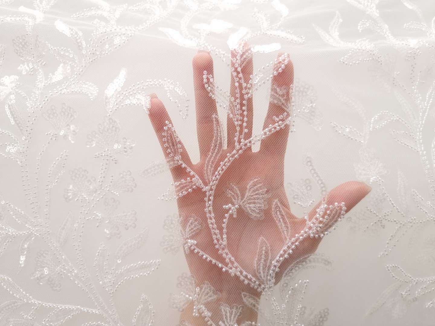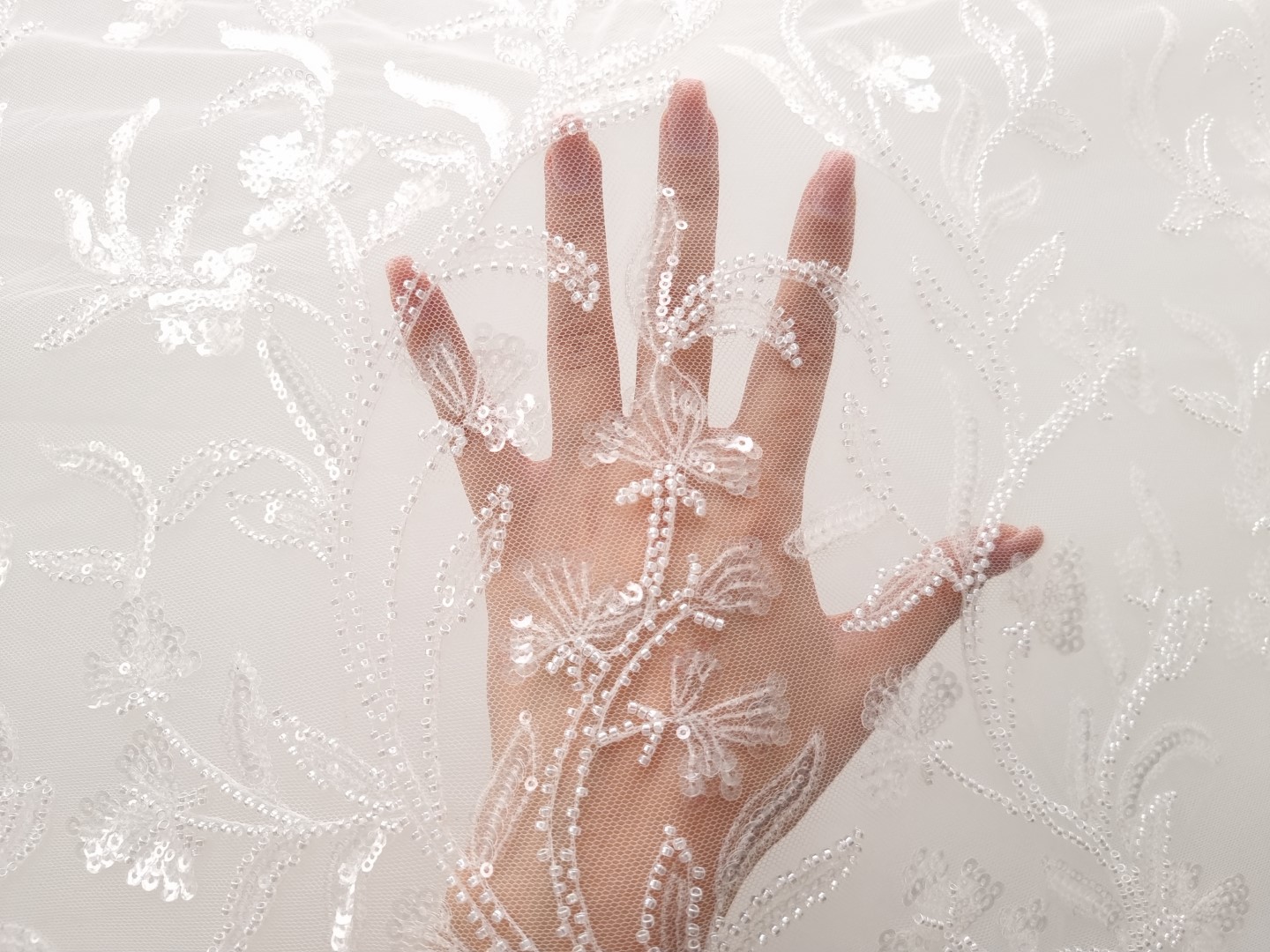 Broderie ivoire cu micropaiete si margele transparente, cusute pe tul in acelasi ton cu accesorizarea.