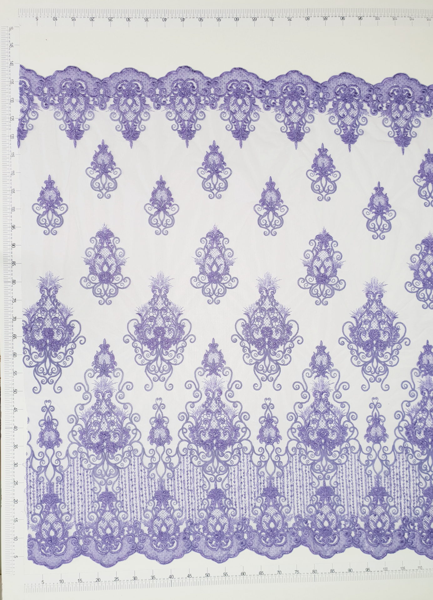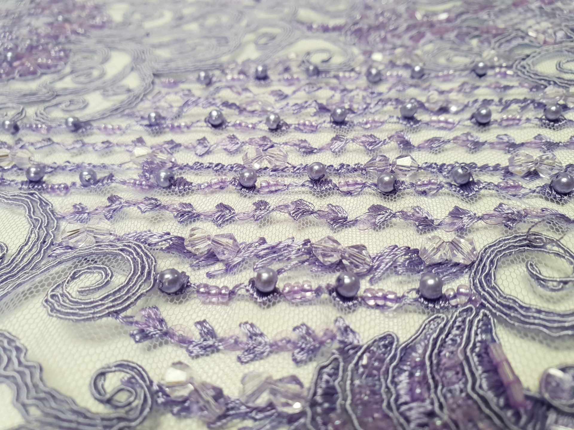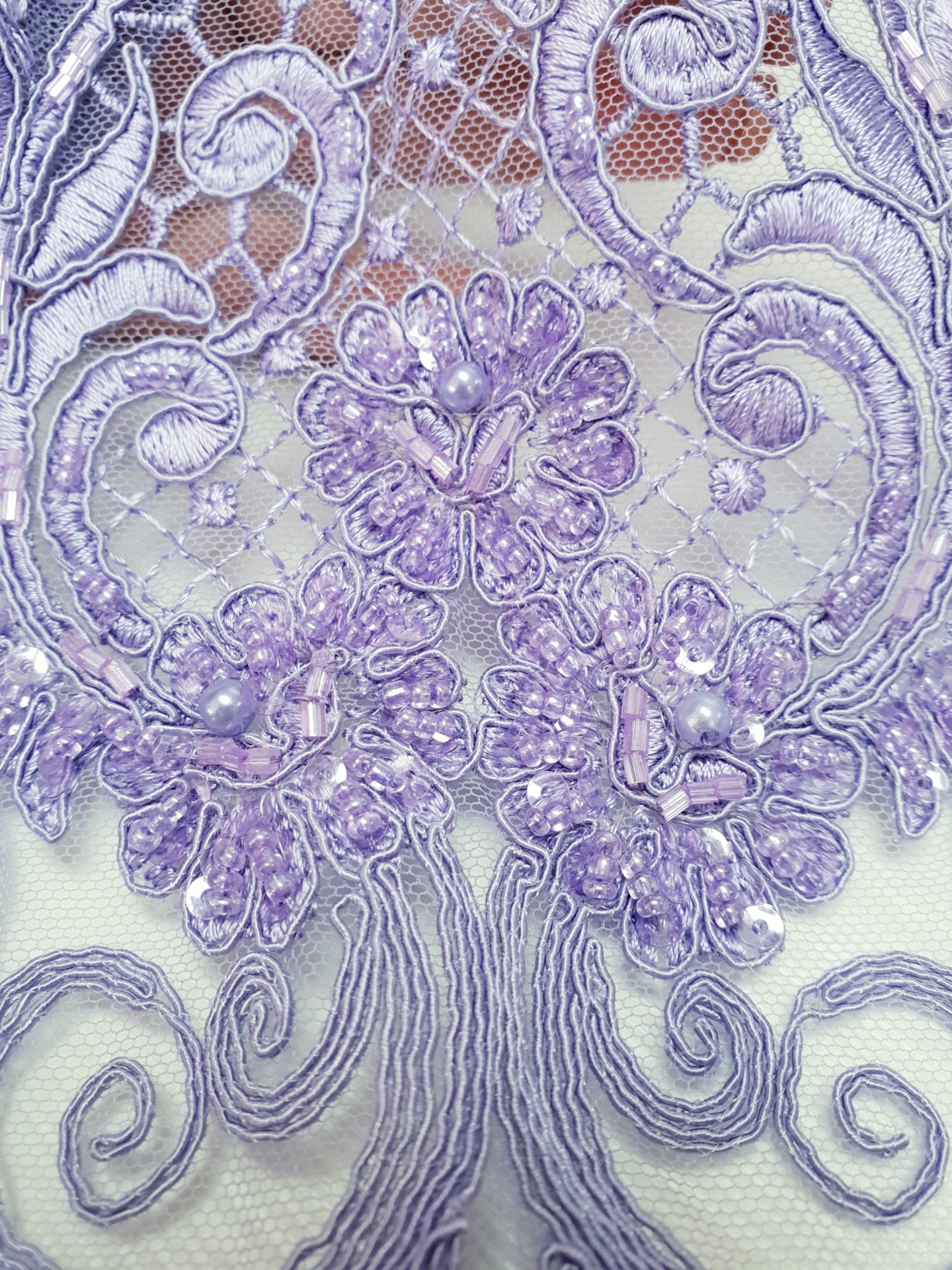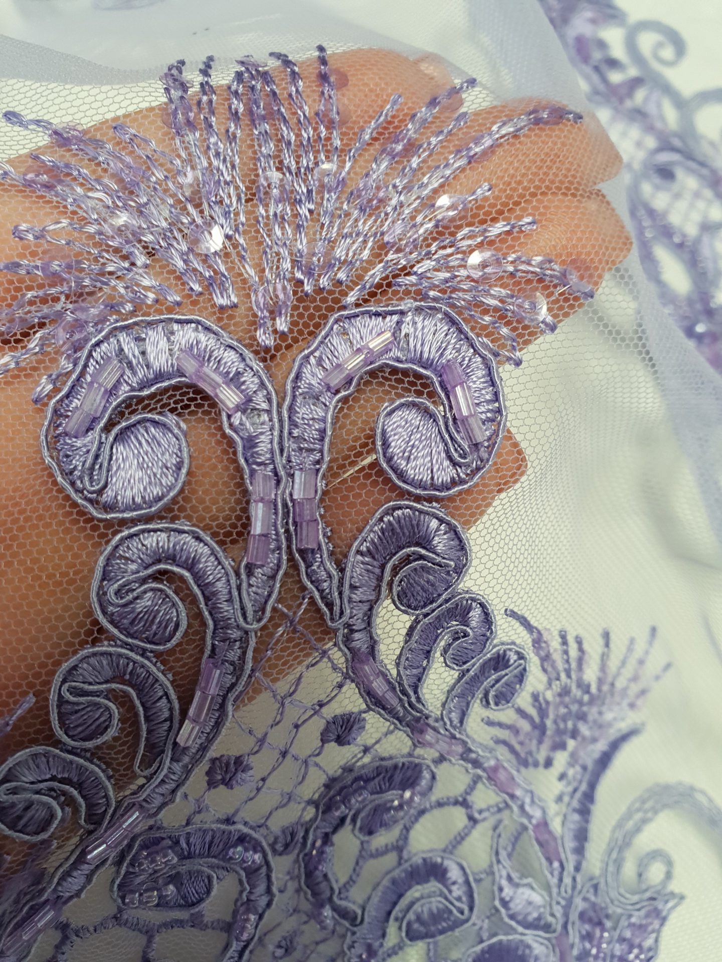 Broderie mov lila din bumbac, cusuta pe tul in acelasi ton coloristic. Accesorizarea este discret realizata cu cristale si prin paiete micute, semitransparente, ceea ce confera un luciu foarte discret, in miscare si mai ales in contact cu lumina reflectoarelor.