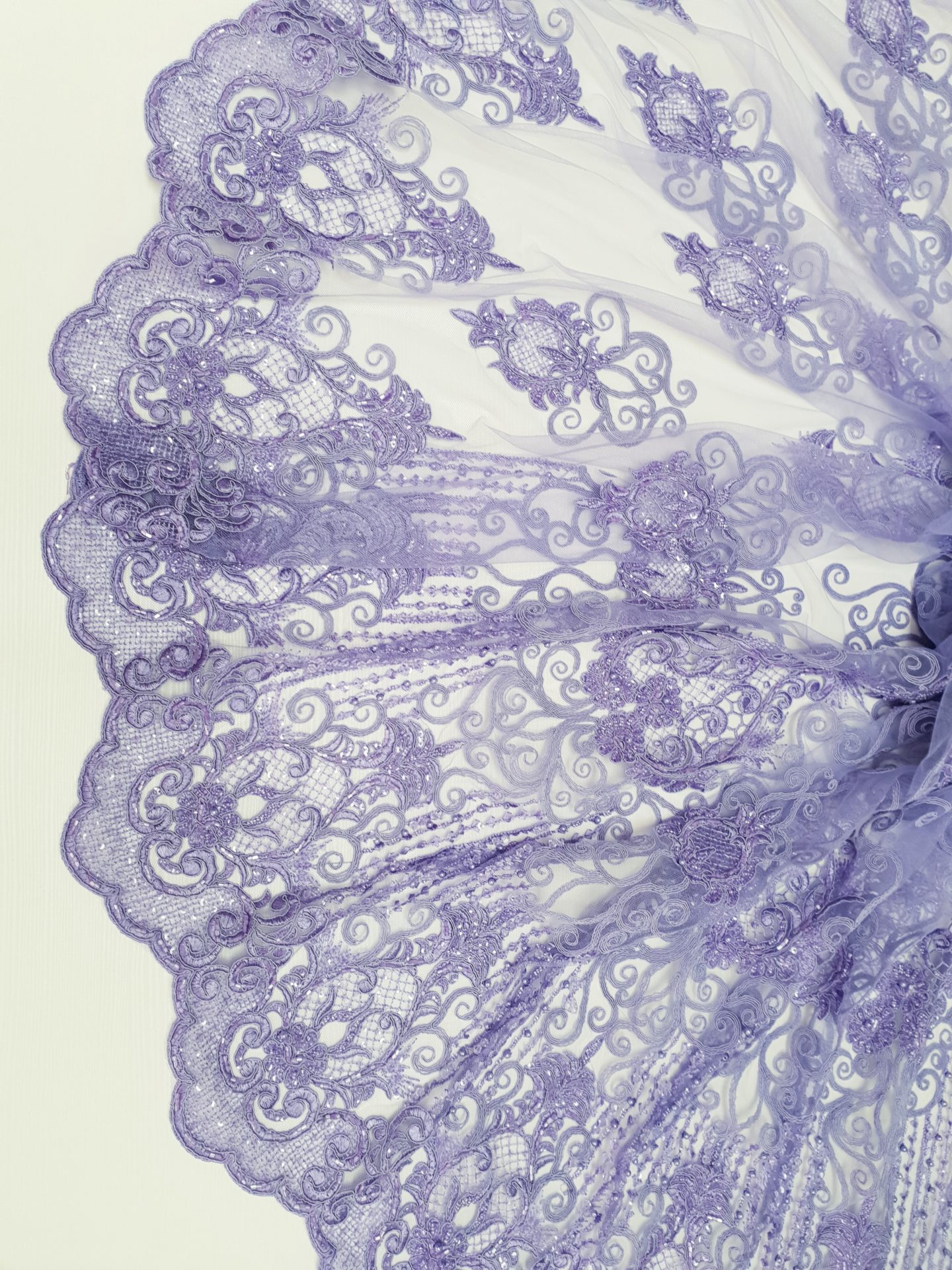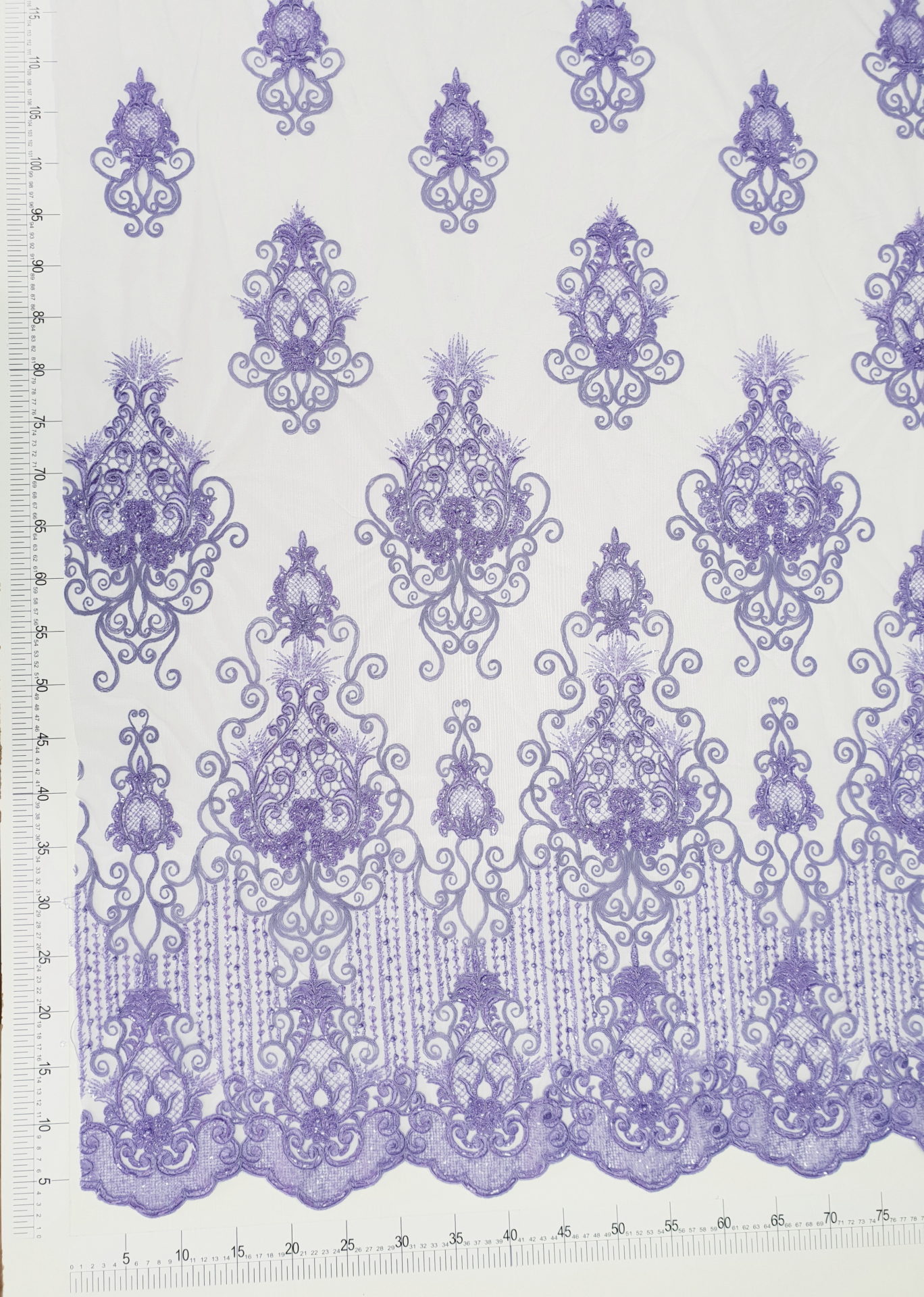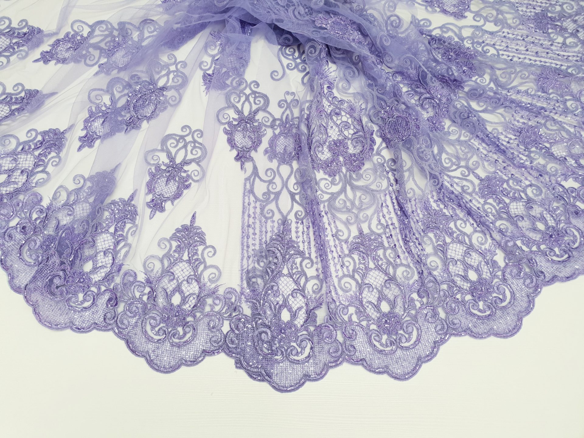 Broderie mov lila din bumbac, cusuta pe tul in acelasi ton coloristic. Accesorizarea este discret realizata cu cristale si prin paiete micute, semitransparente, ceea ce confera un luciu foarte discret, in miscare si mai ales in contact cu lumina reflectoarelor.