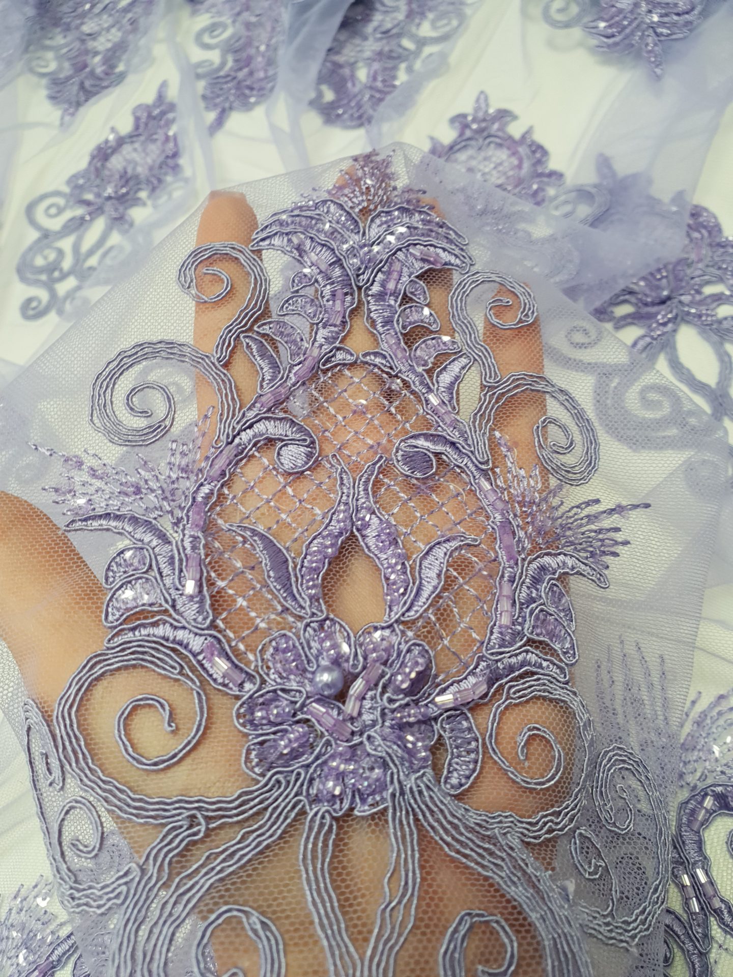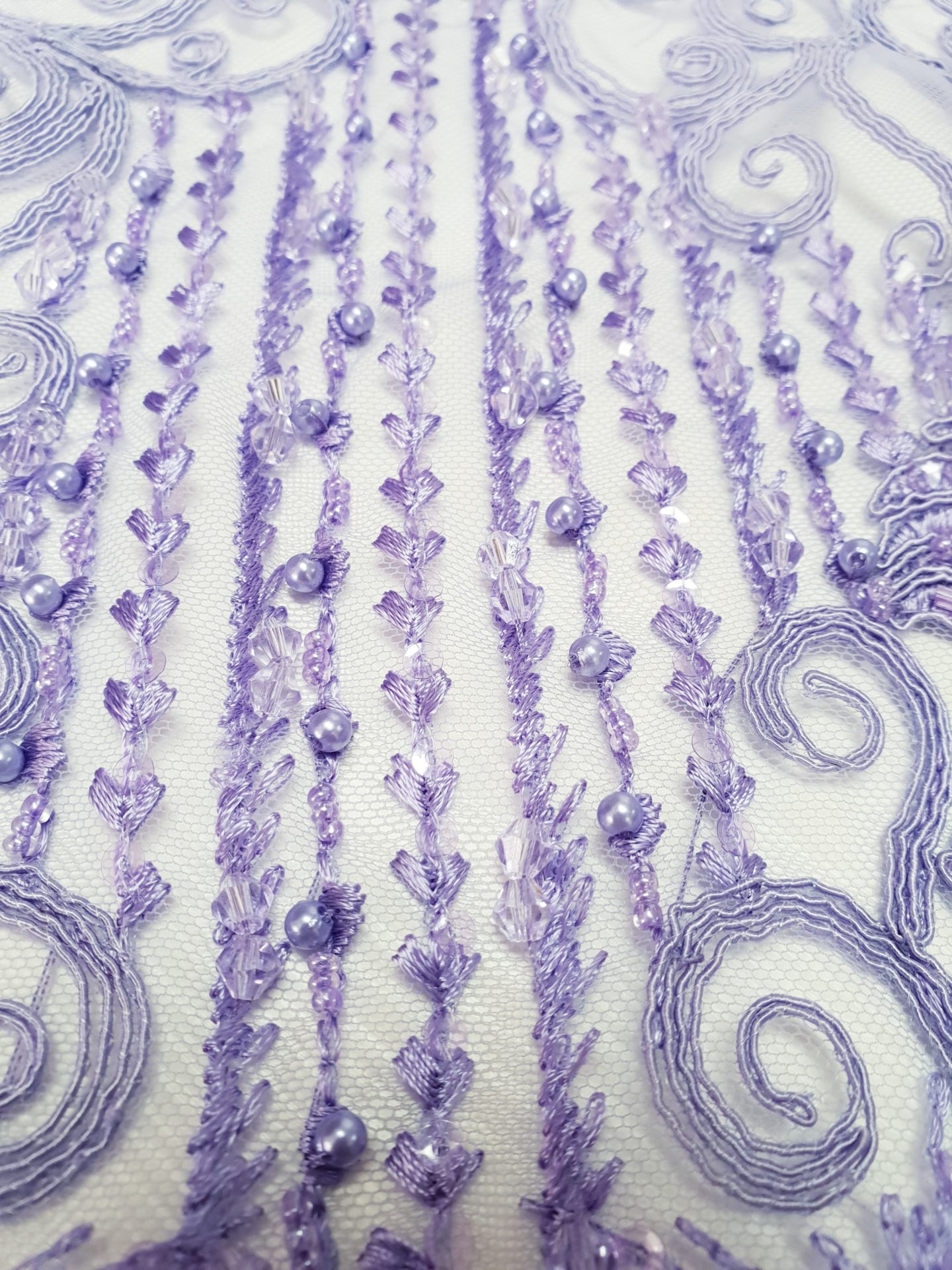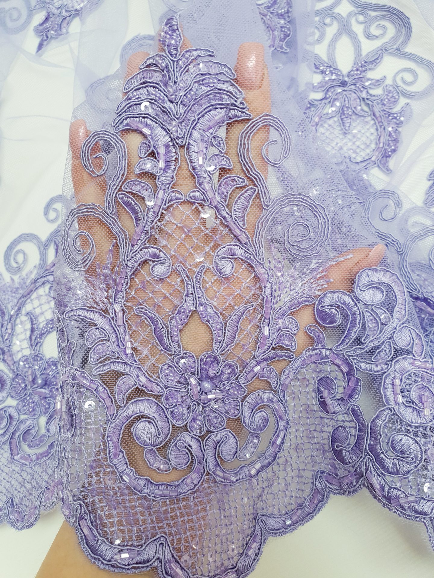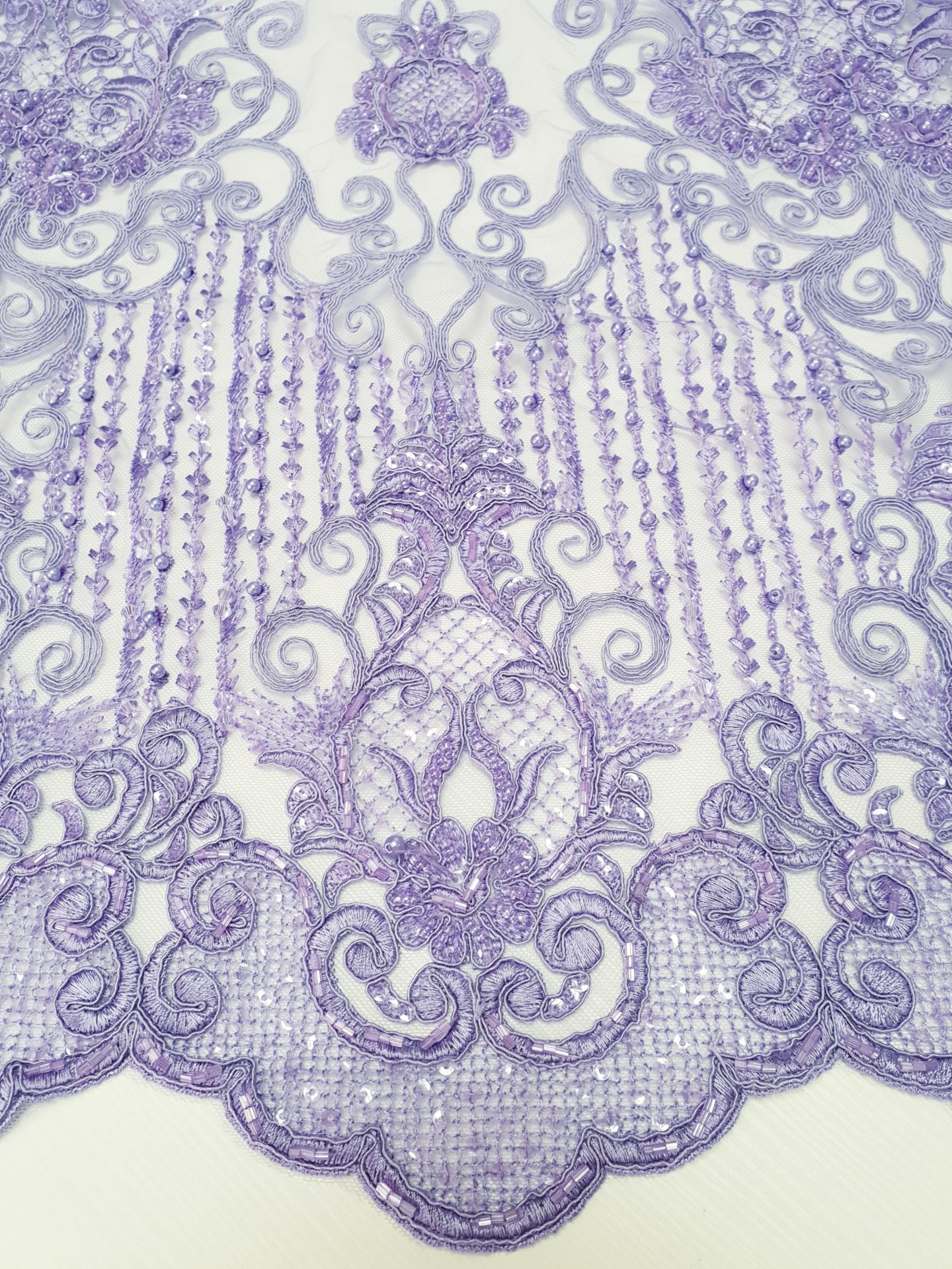 Broderie mov lila din bumbac, cusuta pe tul in acelasi ton coloristic. Accesorizarea este discret realizata cu cristale si prin paiete micute, semitransparente, ceea ce confera un luciu foarte discret, in miscare si mai ales in contact cu lumina reflectoarelor.