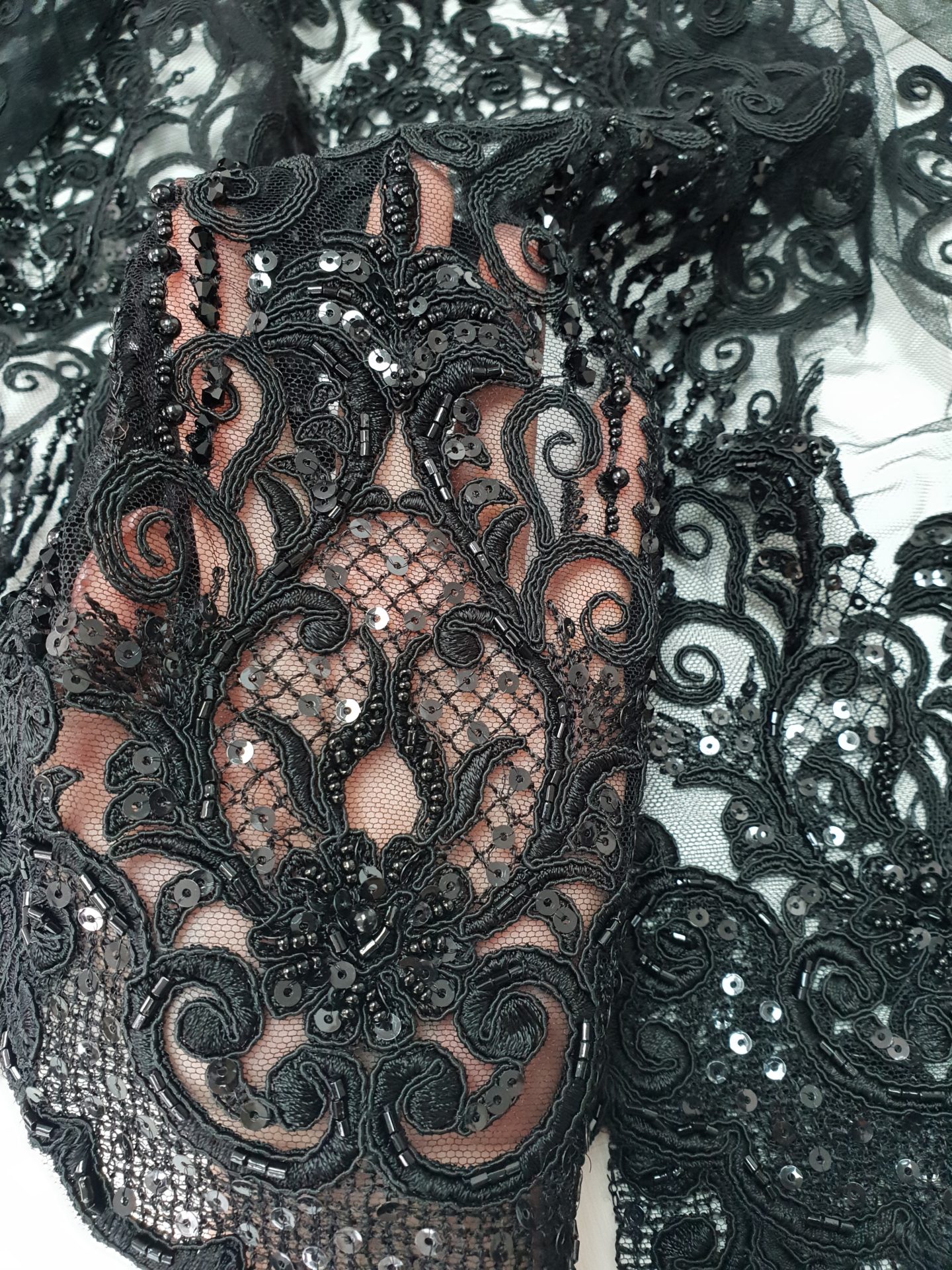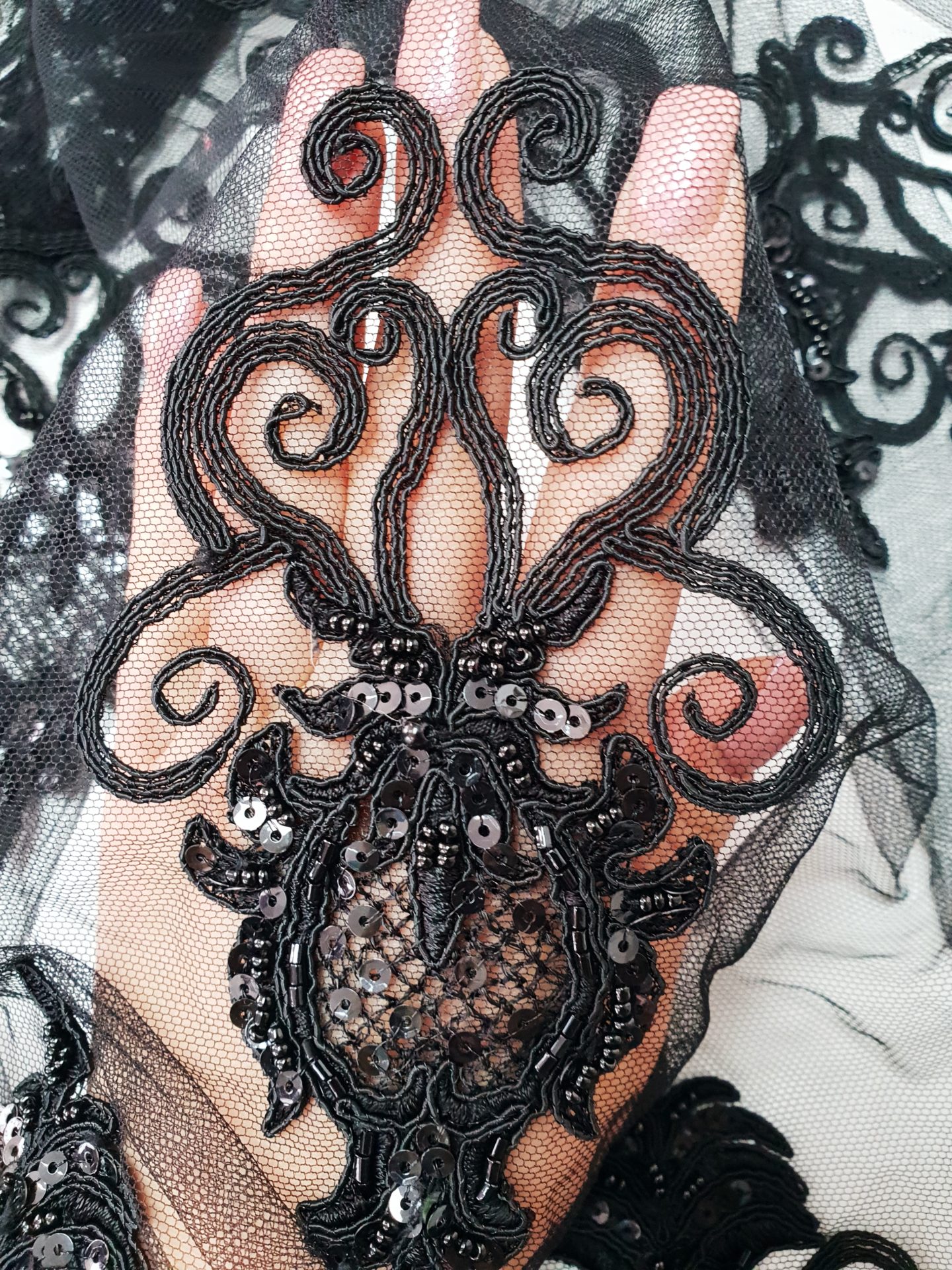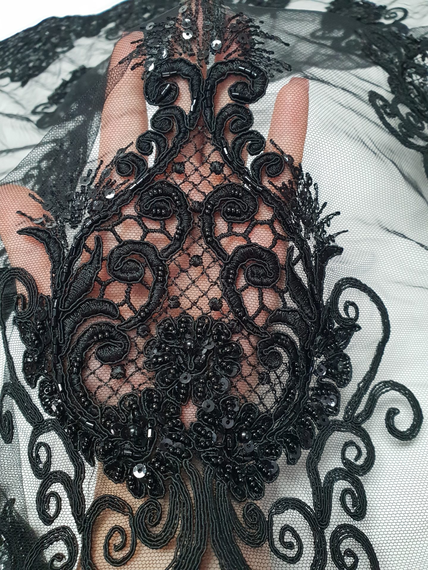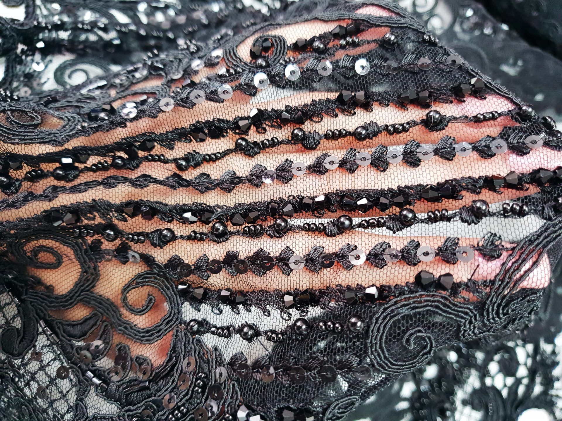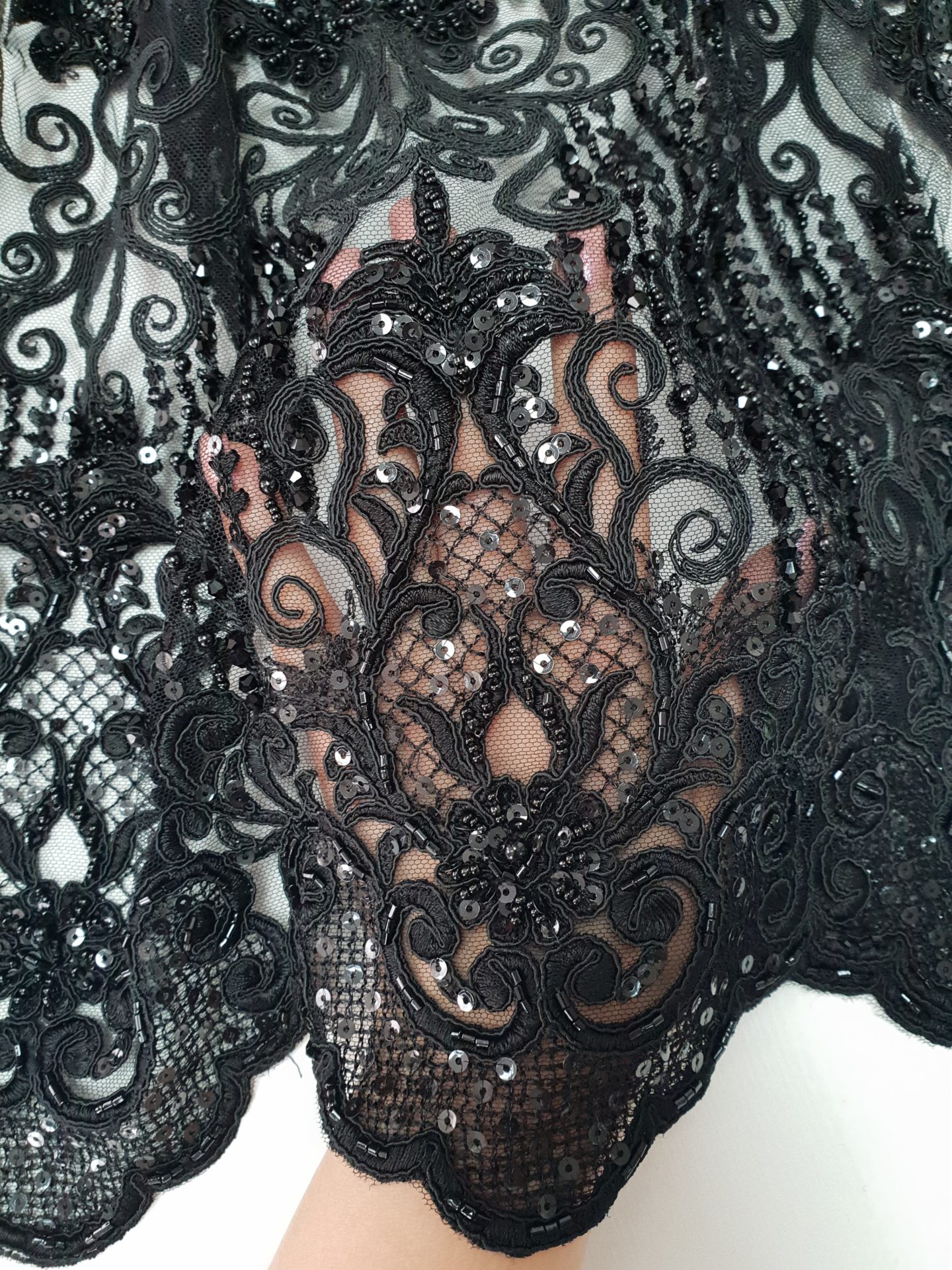 Broderie neagra din bumbac, cusuta pe tul in acelasi ton coloristic. Accesorizarea este discret realizata cu cristale si prin paiete micute, semitransparente, ceea ce confera un luciu foarte discret, in miscare si mai ales in contact cu lumina reflectoarelor.