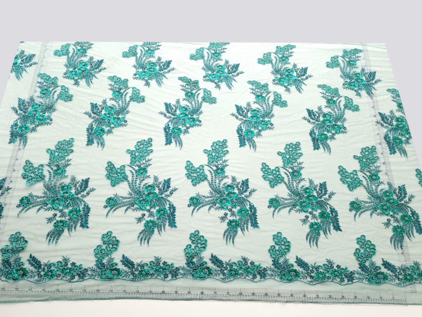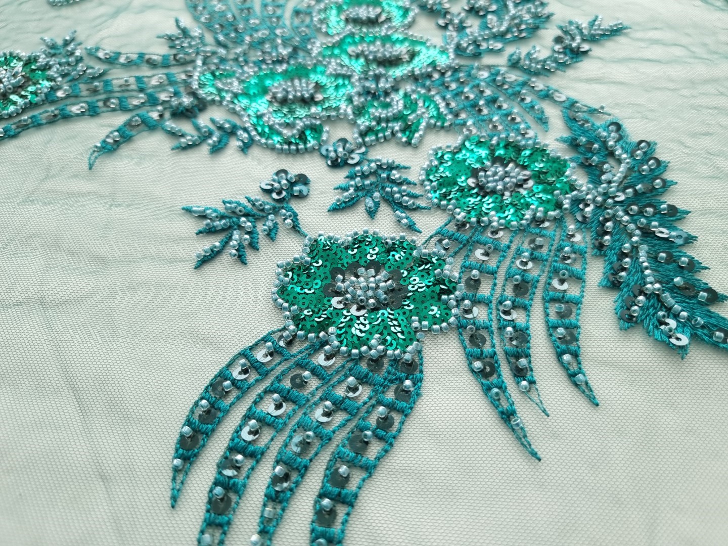 Caracterictici Dantela verde cu margele si micropaiete: