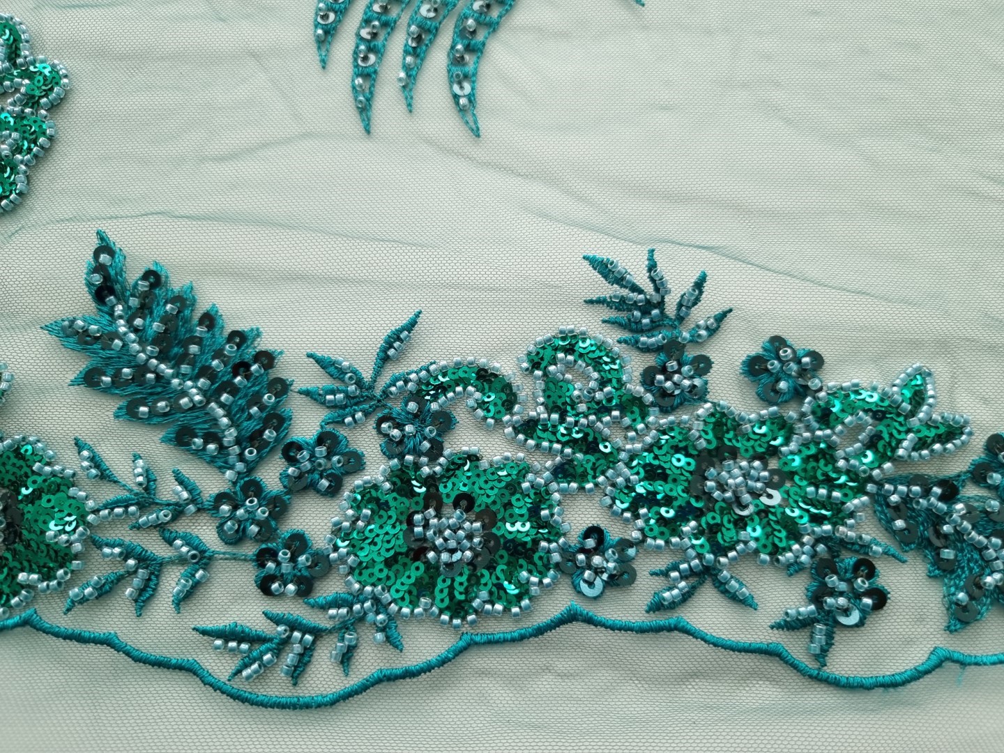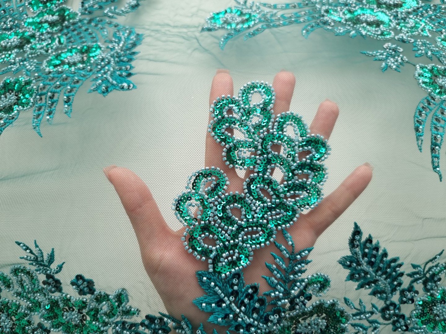 Dantela verde cu margele si micropaiete, pentru o tinuta cu un aspect spectaculos.