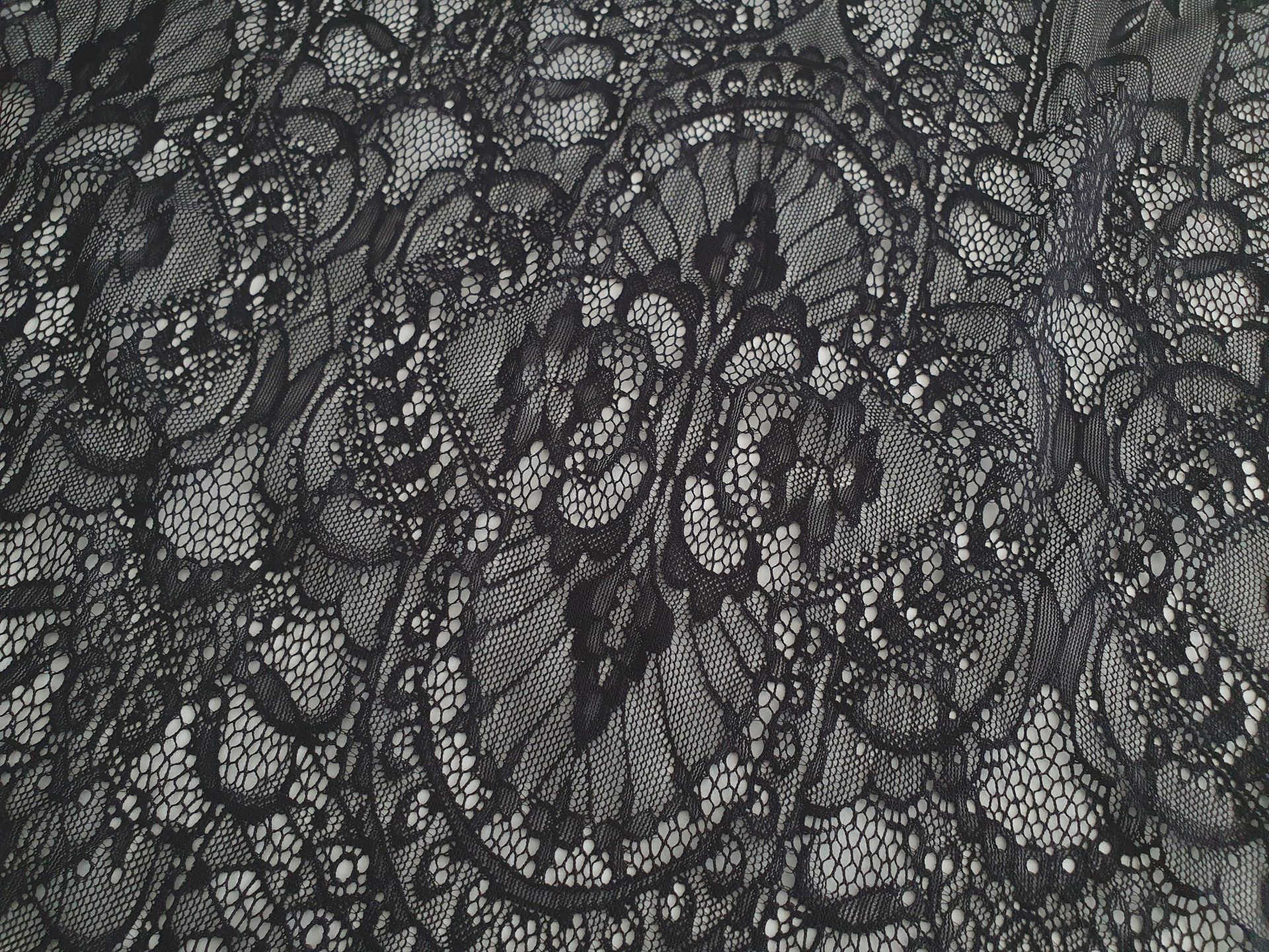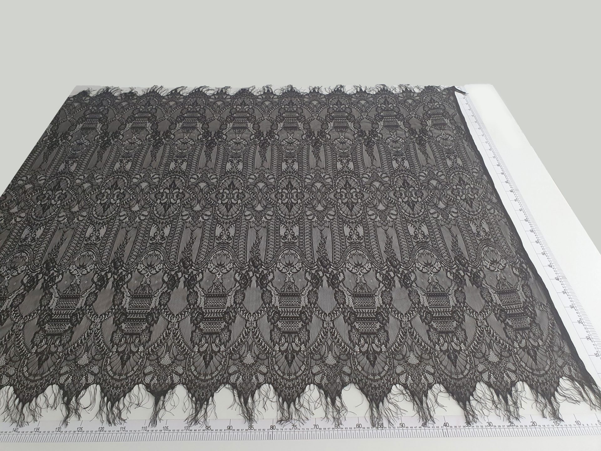 Dantela neagra cu franjuri si model repetitiv.