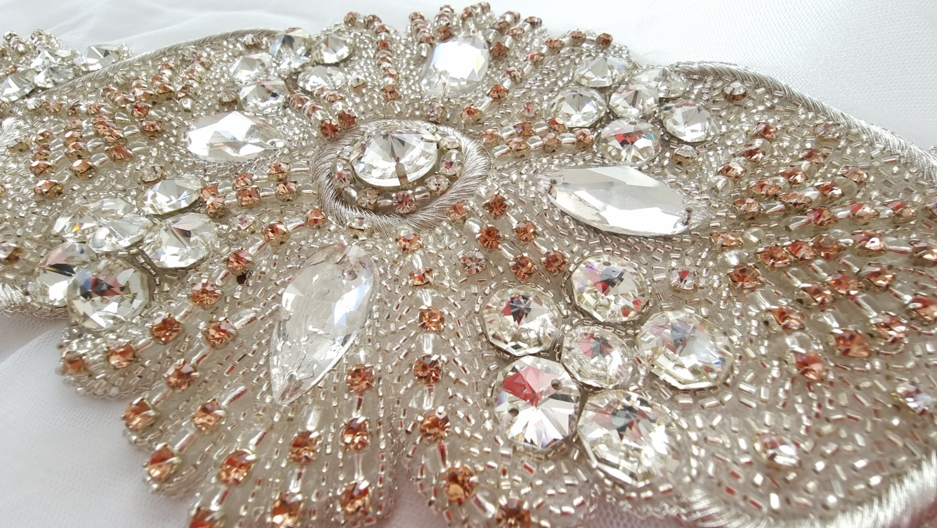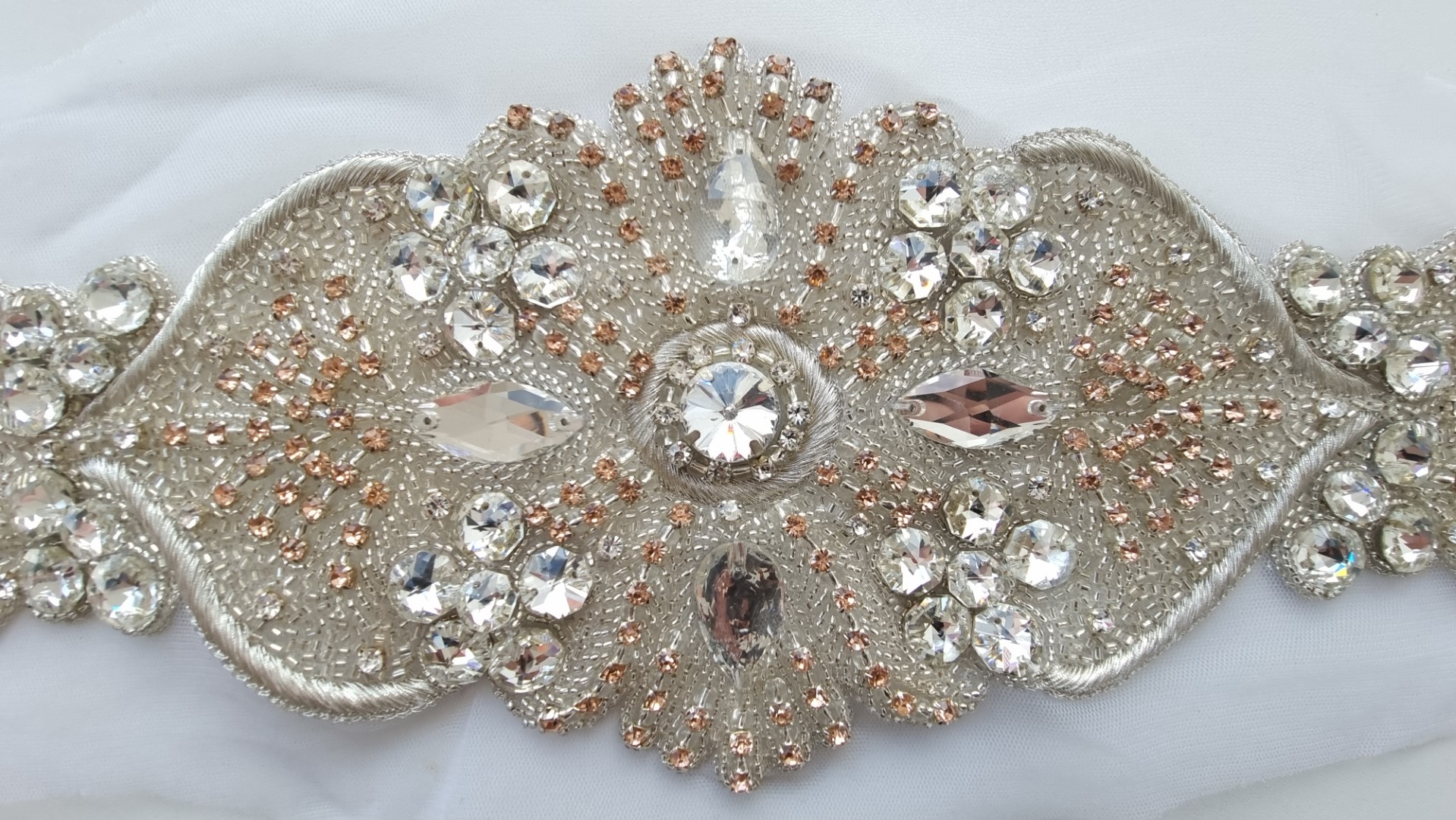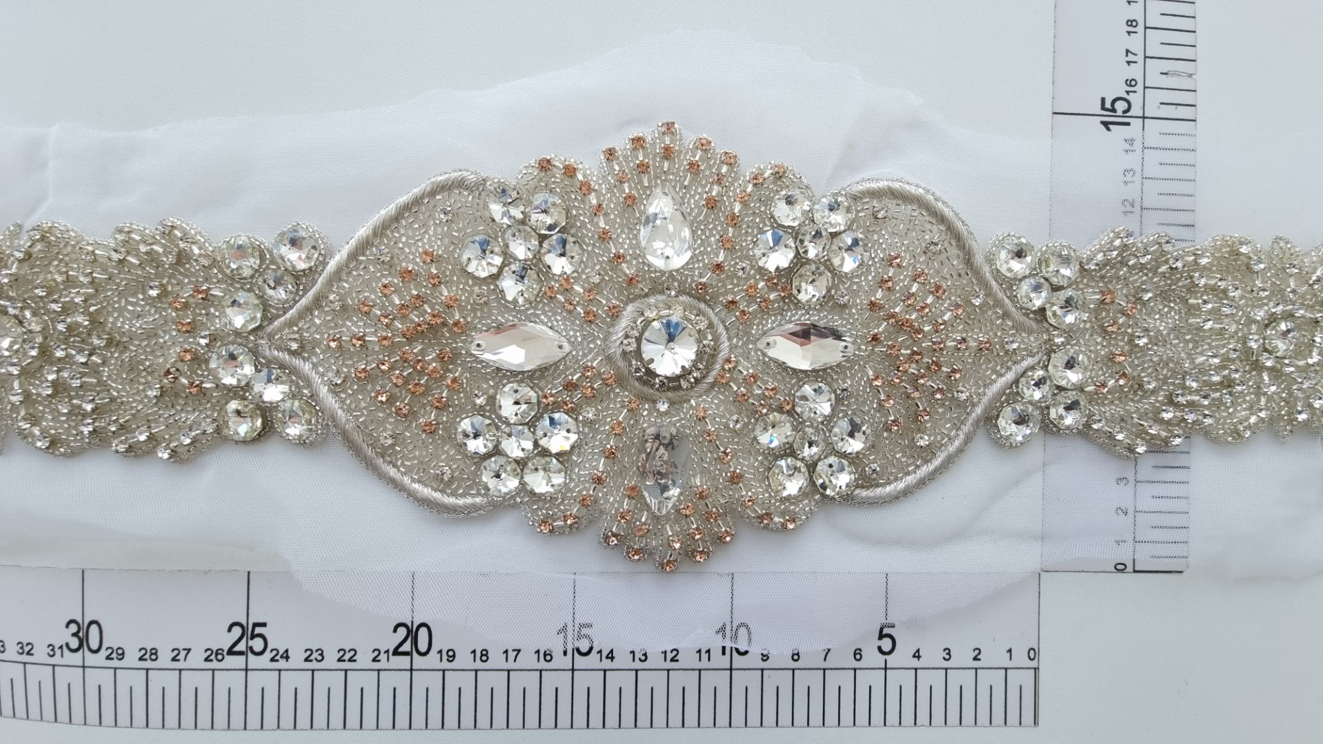 Banda decorativa lucrata manual, accesorizata cu cristale si pietre transparente si bej, de diferite dimensiuni.