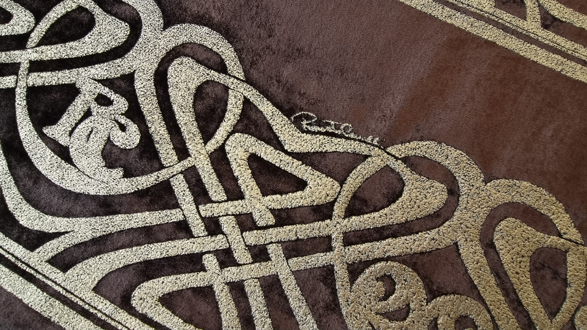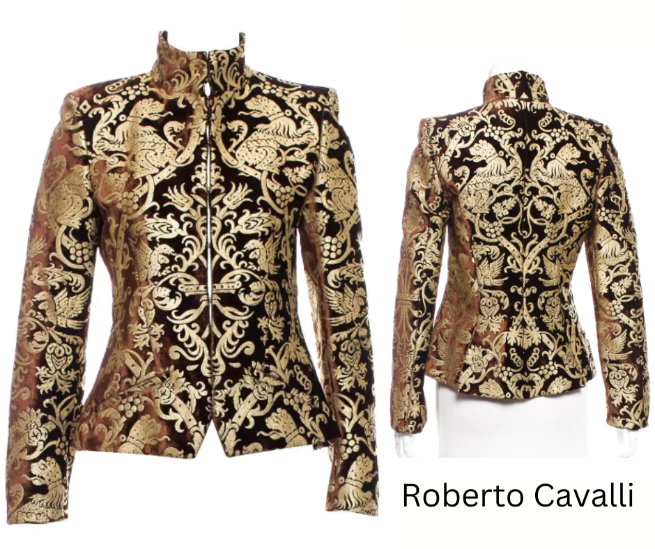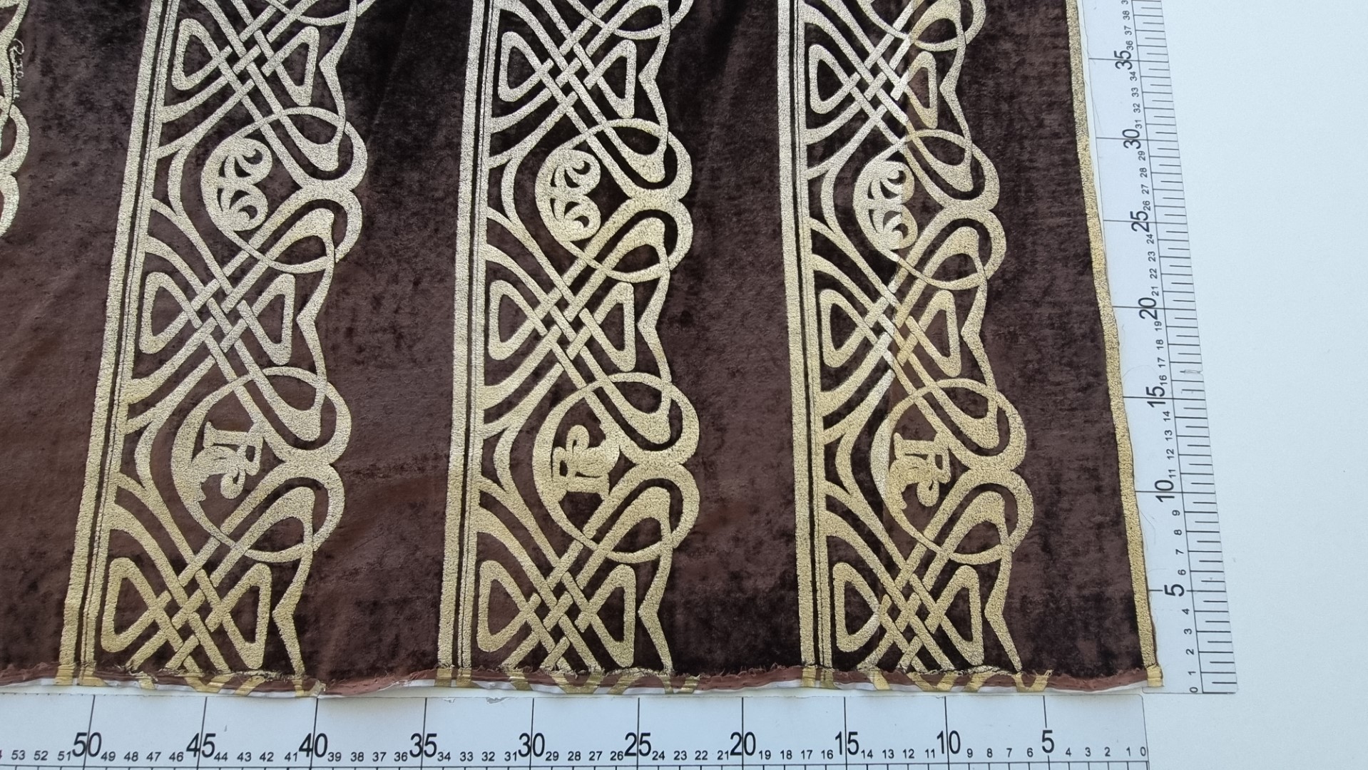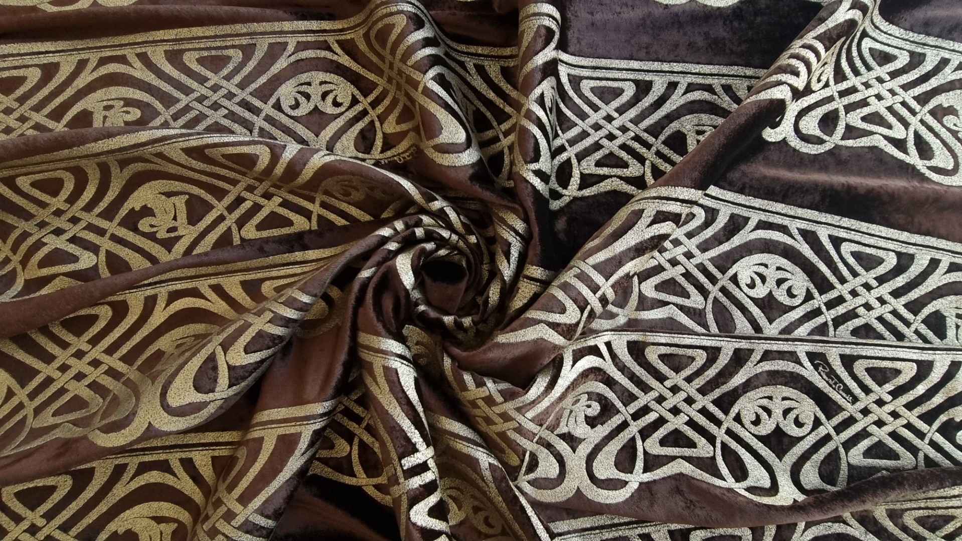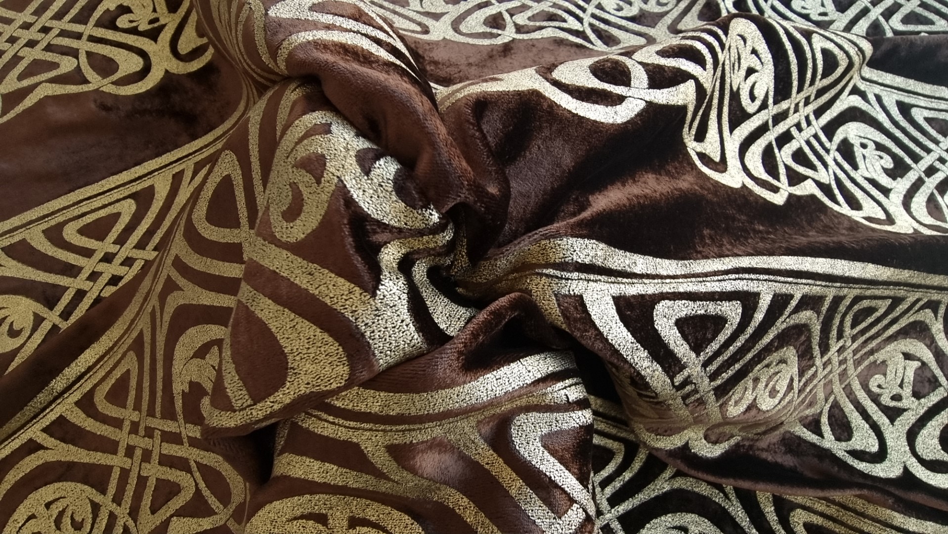 Catifea din matase naturala si vascoza model imprimat RCAV1087 auriu, tesatura moale, model de inspiratie Roberto Cavalli.