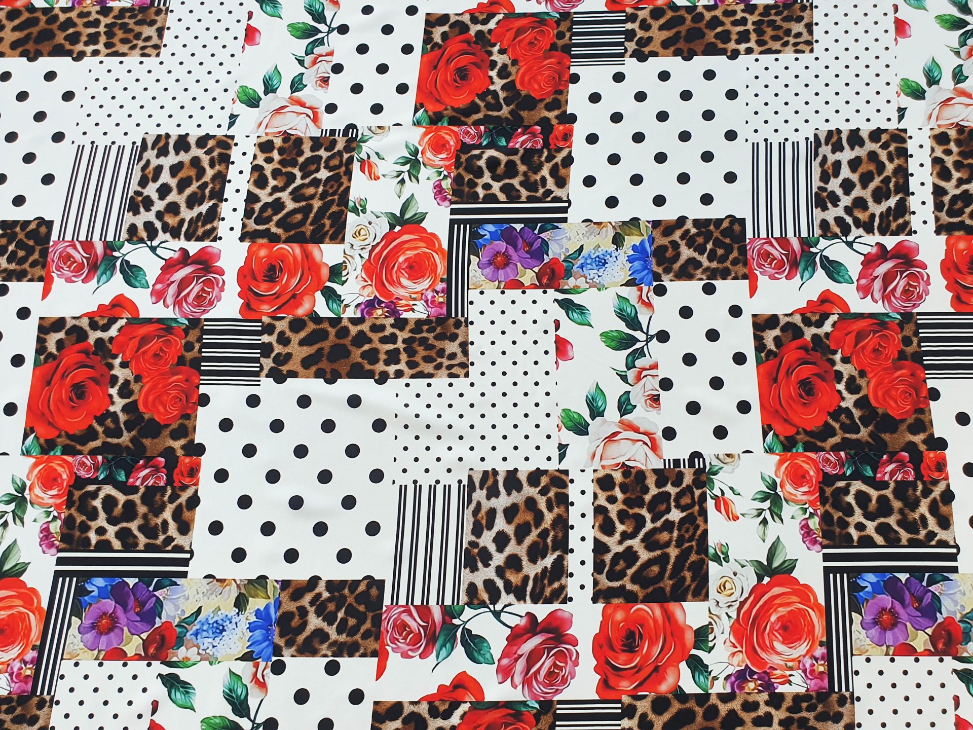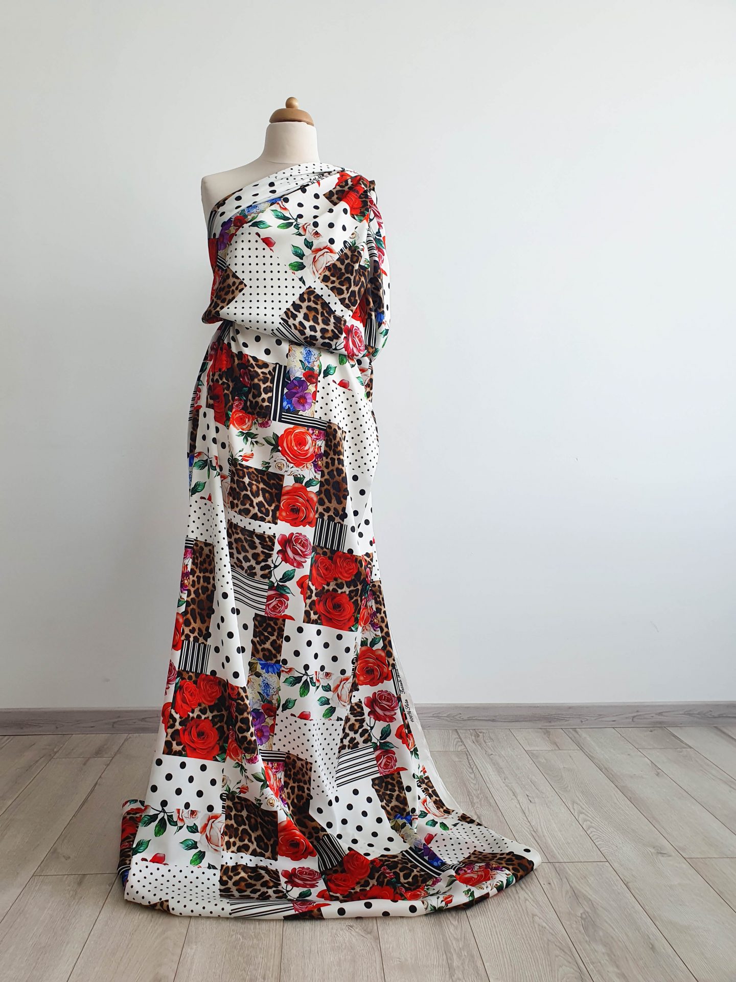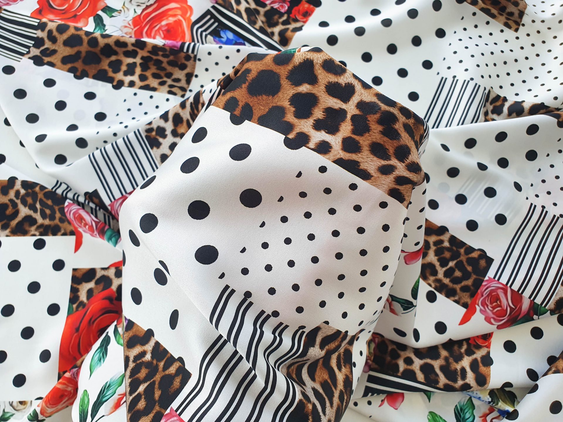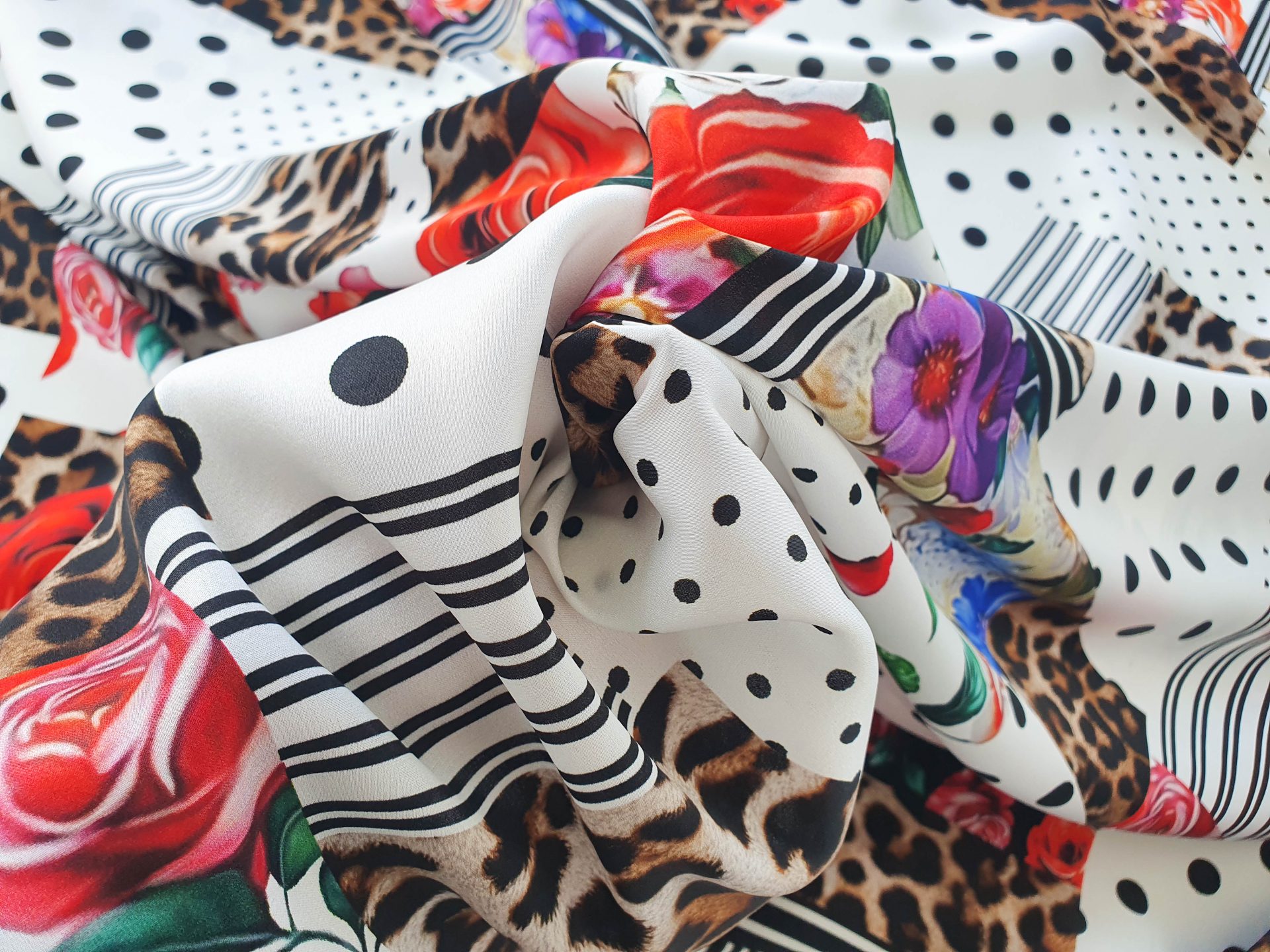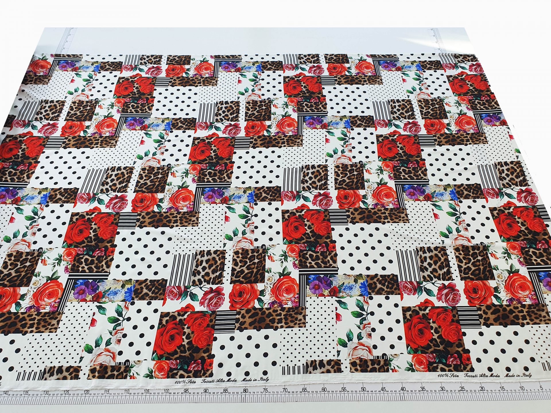 Satin din matase naturala multicolora cu patchwork DG497, cu textura vaporoasa, subtire, fina, foarte placuta la atingere.