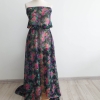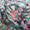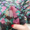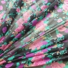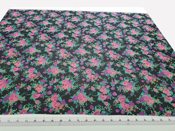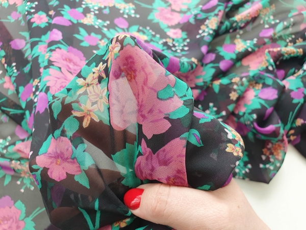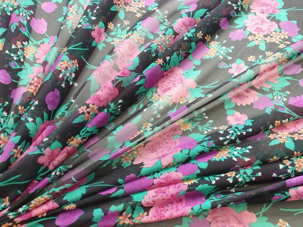 Voal imprimat din matase naturala GUC568 , cu motive florale roz si mov pe fond negru, distribuit pe intreaga suprafata.