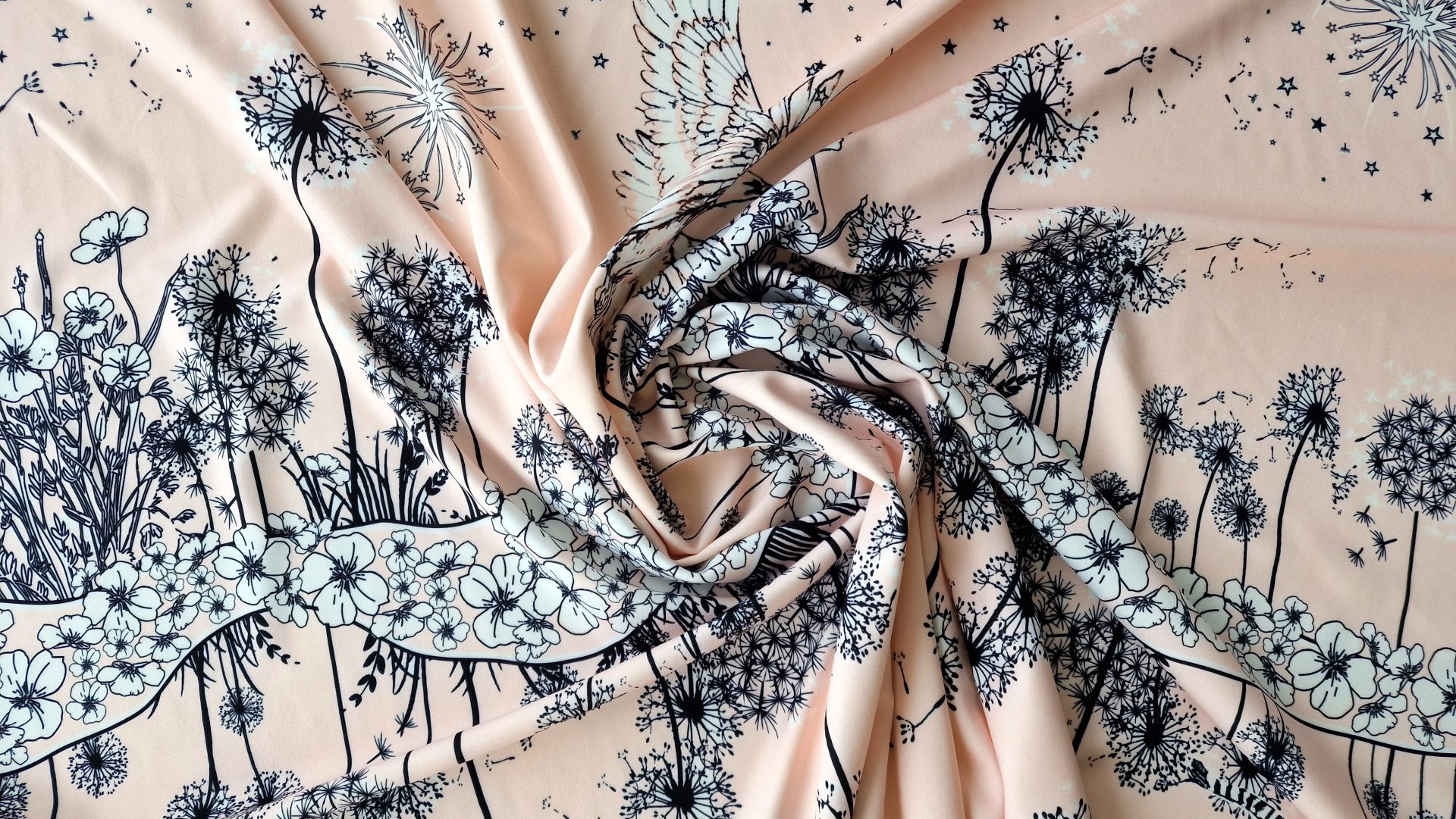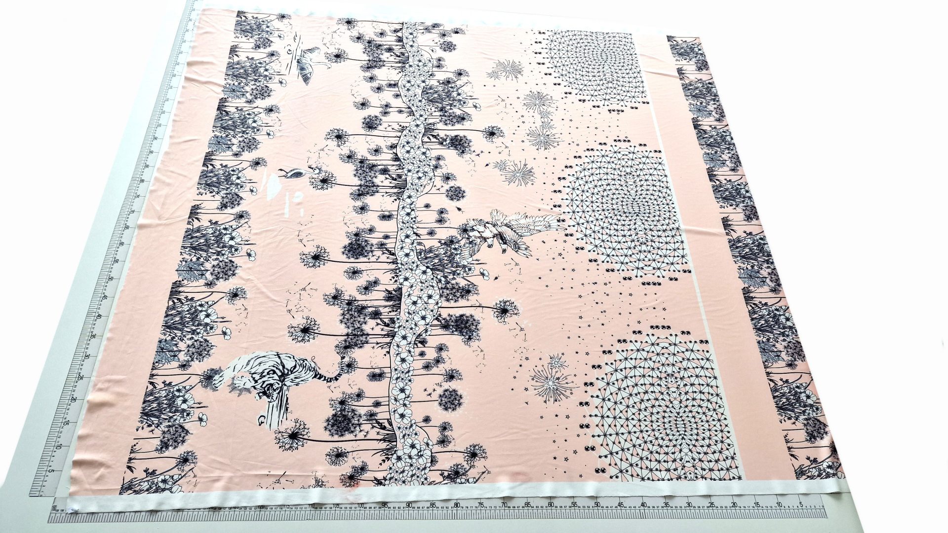 Tesatura fina, foarte placuta la atingere, model pe toata suprafata, este ideal pentru a realiza diverse piese vestimentare pentru femei si copii in sezonul cald. Modelul este alcatuit din panouri de 1.4 m fiecare.