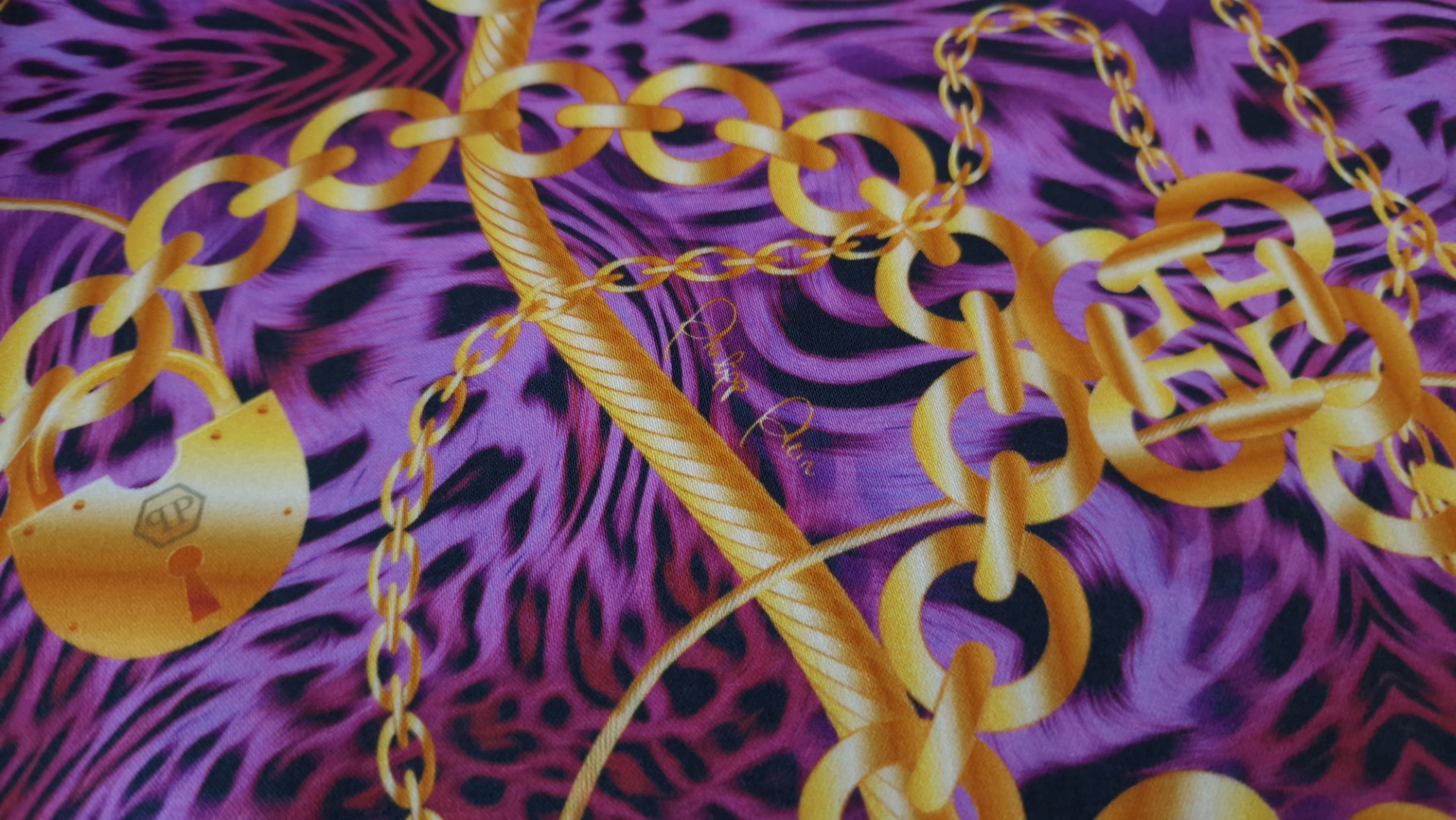 Purple cotton poplin with Chain Print PP1059 – tesatura tip poplin din bumbac, usor elastica, cu o textura placuta la atingere, calitate superioara, cu model, monograma si denumire brand imprimat, distribuit pe intreaga suprafata, de inspiratie Philipp Plein.