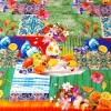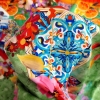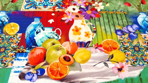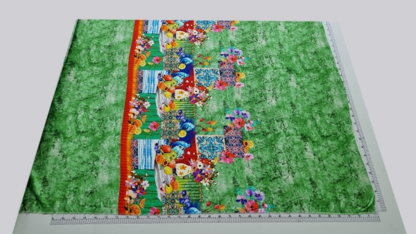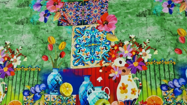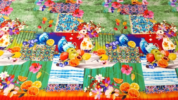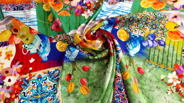 Satin din matase naturala imprimata model multicolor DG853, usor elastic, realizat din panouri repetitive de 1,35 m fiecare.