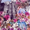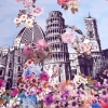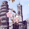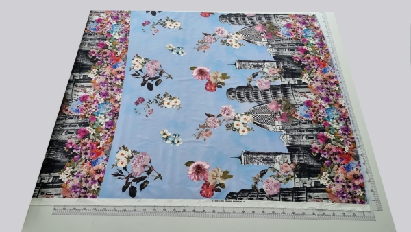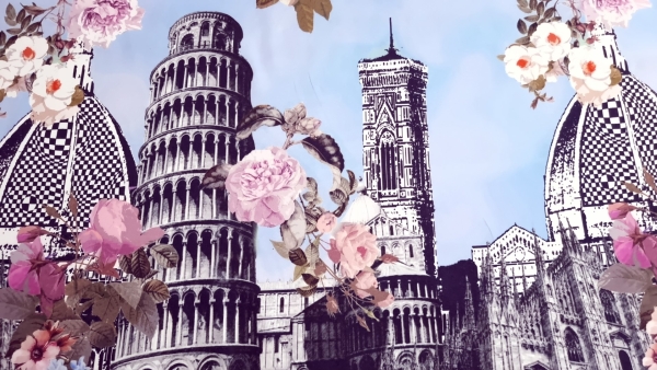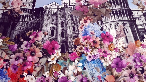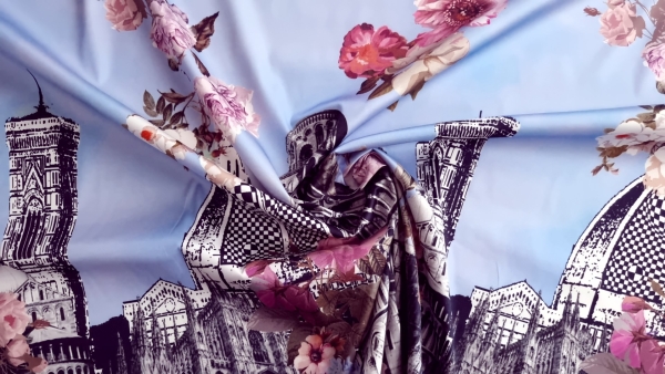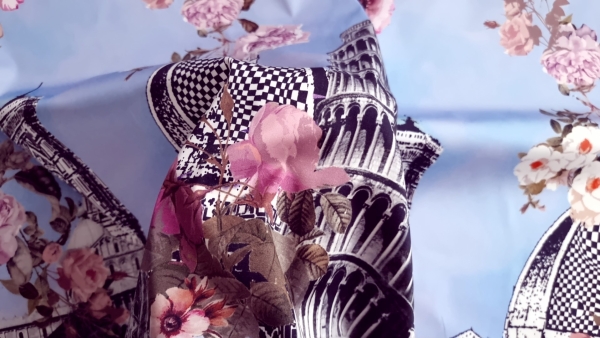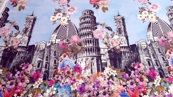 Tafta satinata din vascoza imprimata model multicolor DG852, alcatuit din panouri repetitive de 1,35 m fiecare, model Turnul din Pisa.