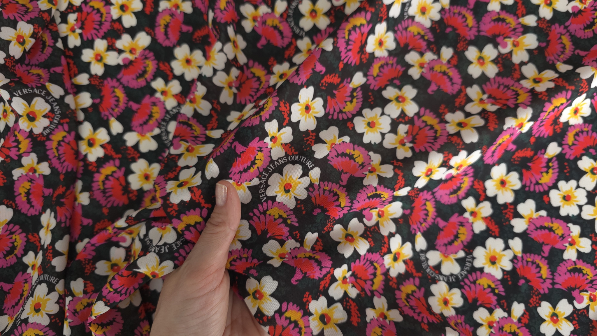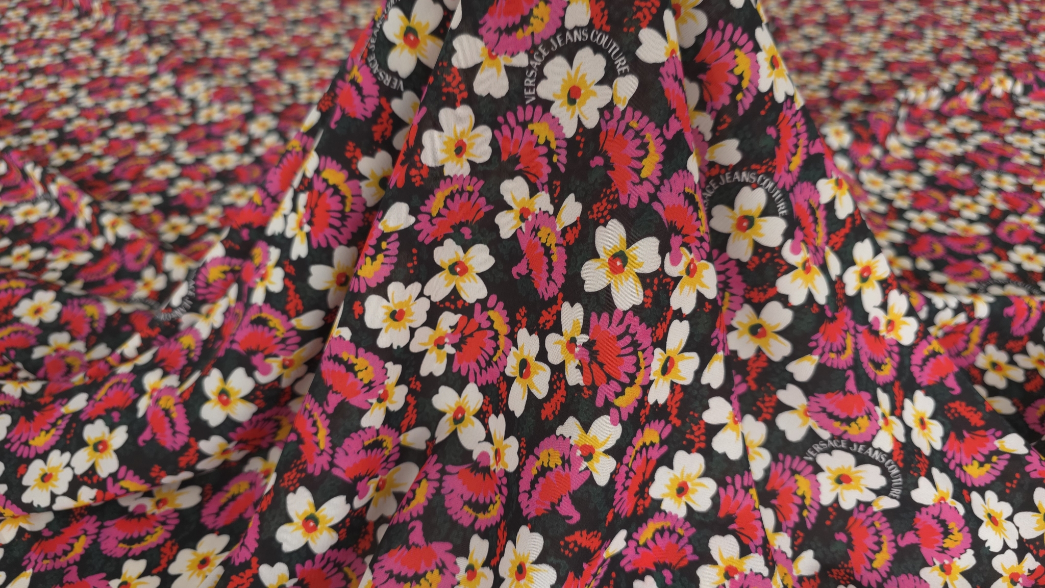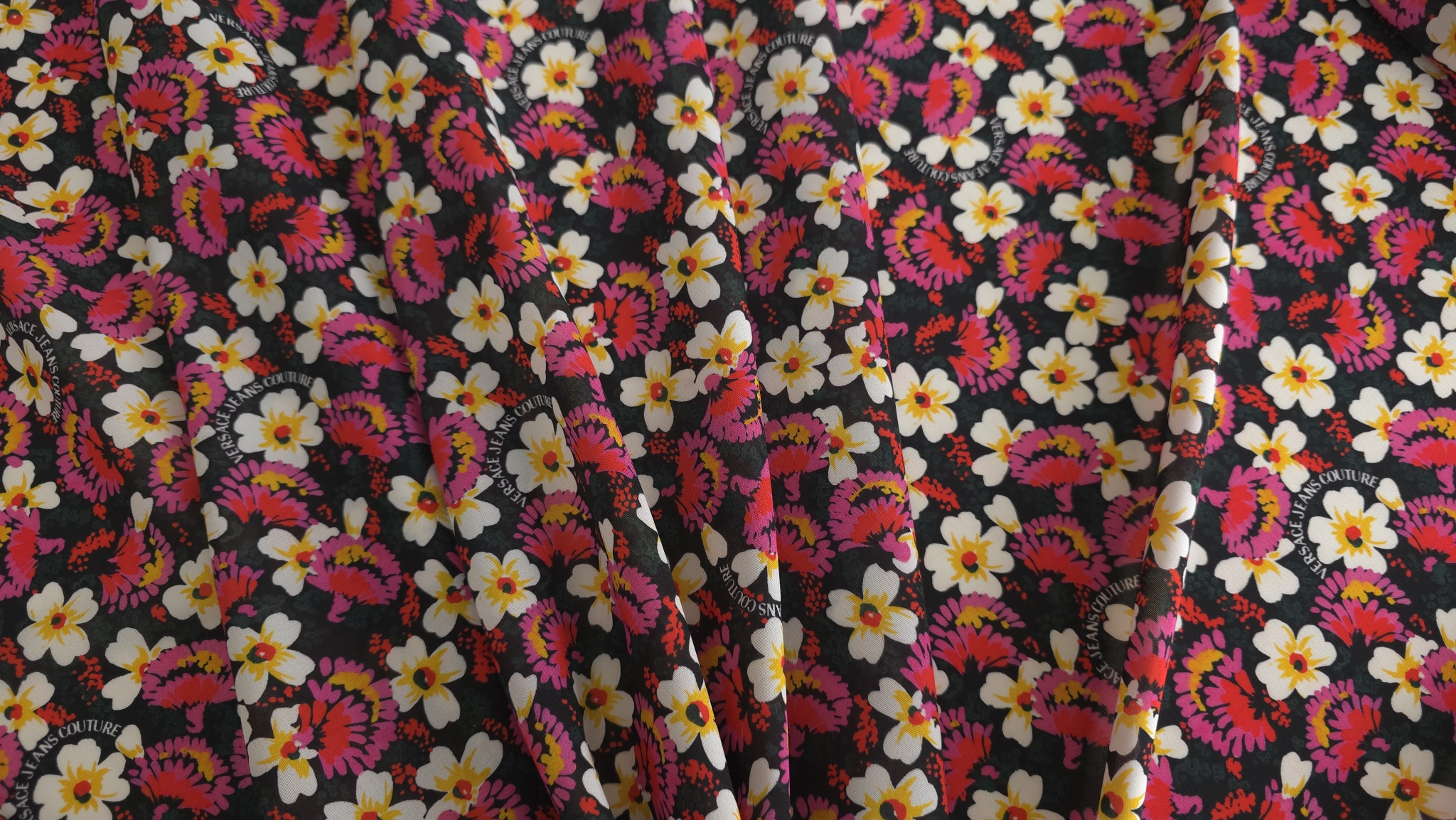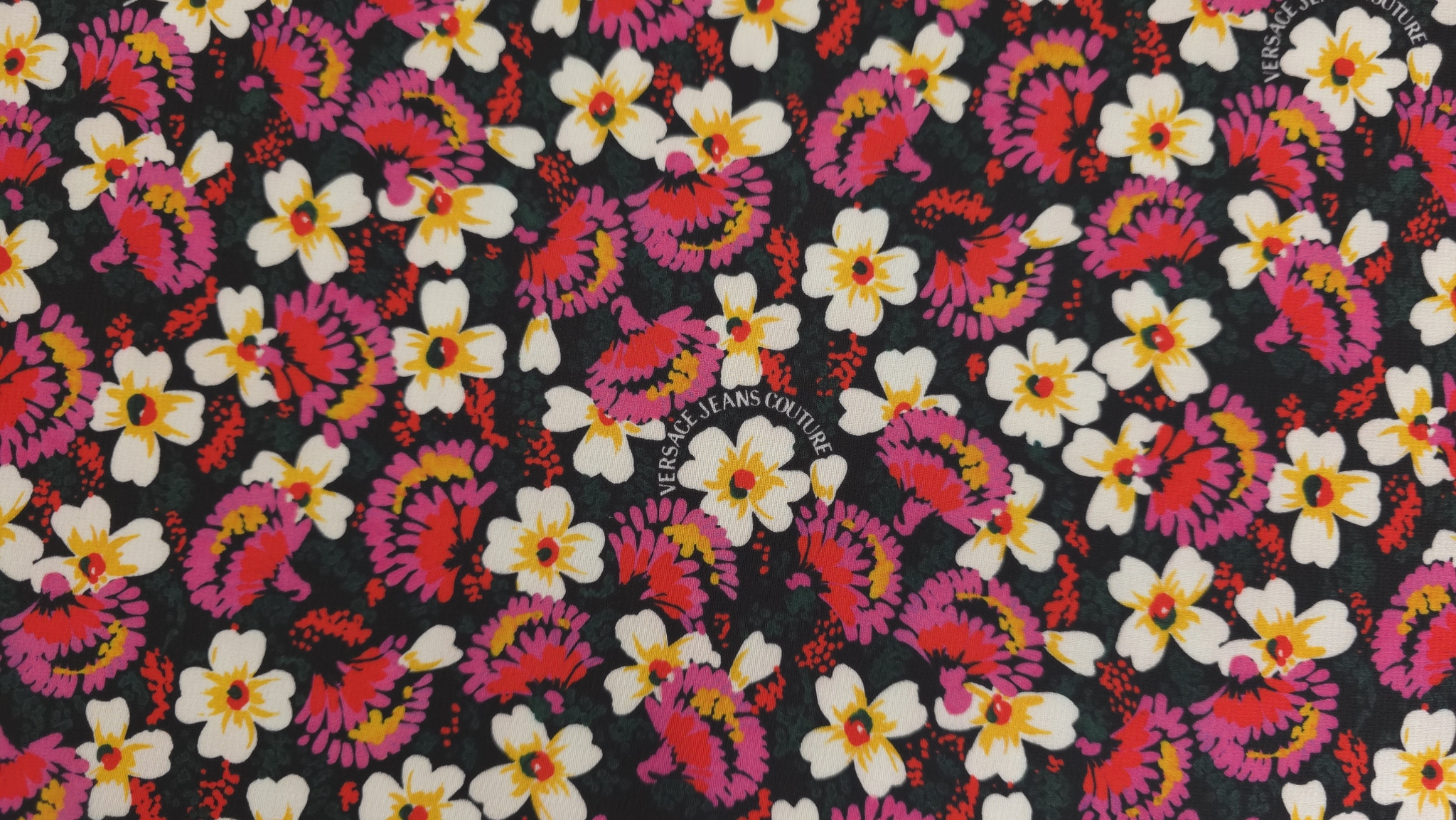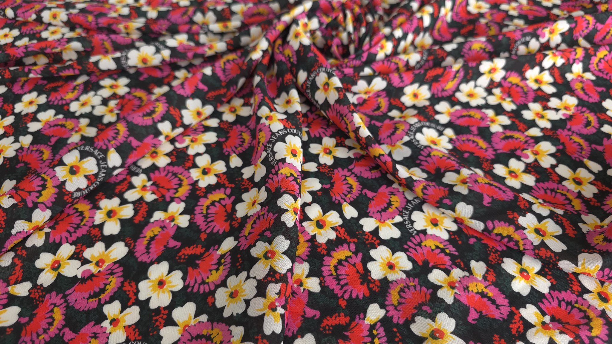 Margaretele albe cu centrul galben se îmbină armonios cu flori stilizate în tonuri de roz și fucsia pe un fundal închis, oferind un echilibru vizual plăcut. O țesătură fină cu imprimeu floral aduce o notă de prospețime oricărei piese vestimentare, remarcându-se prin distribuția uniformă a motivelor care evită aglomerarea vizuală și subliniază eleganța detaliilor sub semnătura V.J.C.