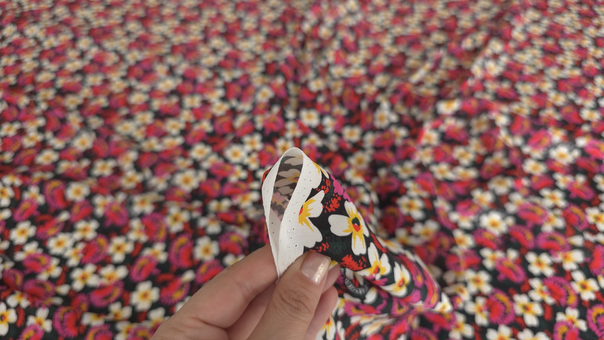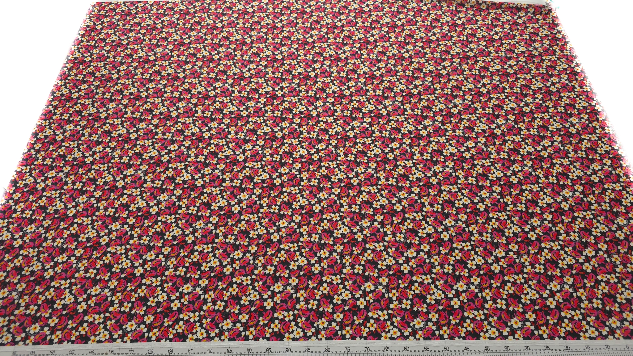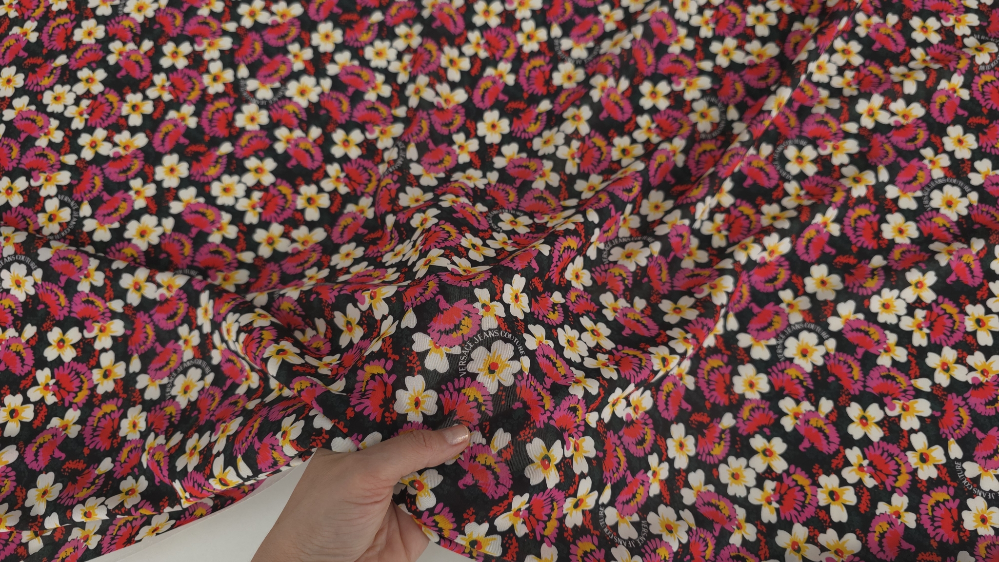 Țesătură fină imprimată floral multicolor este un material de designer V.J.C, cu margarete albe cu inimă galbenă și flori stilizate în nuanțe de roz, fucsia și roșu, distribuite uniform pe întreaga suprafață.