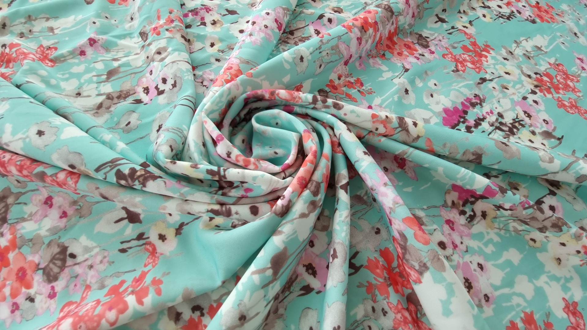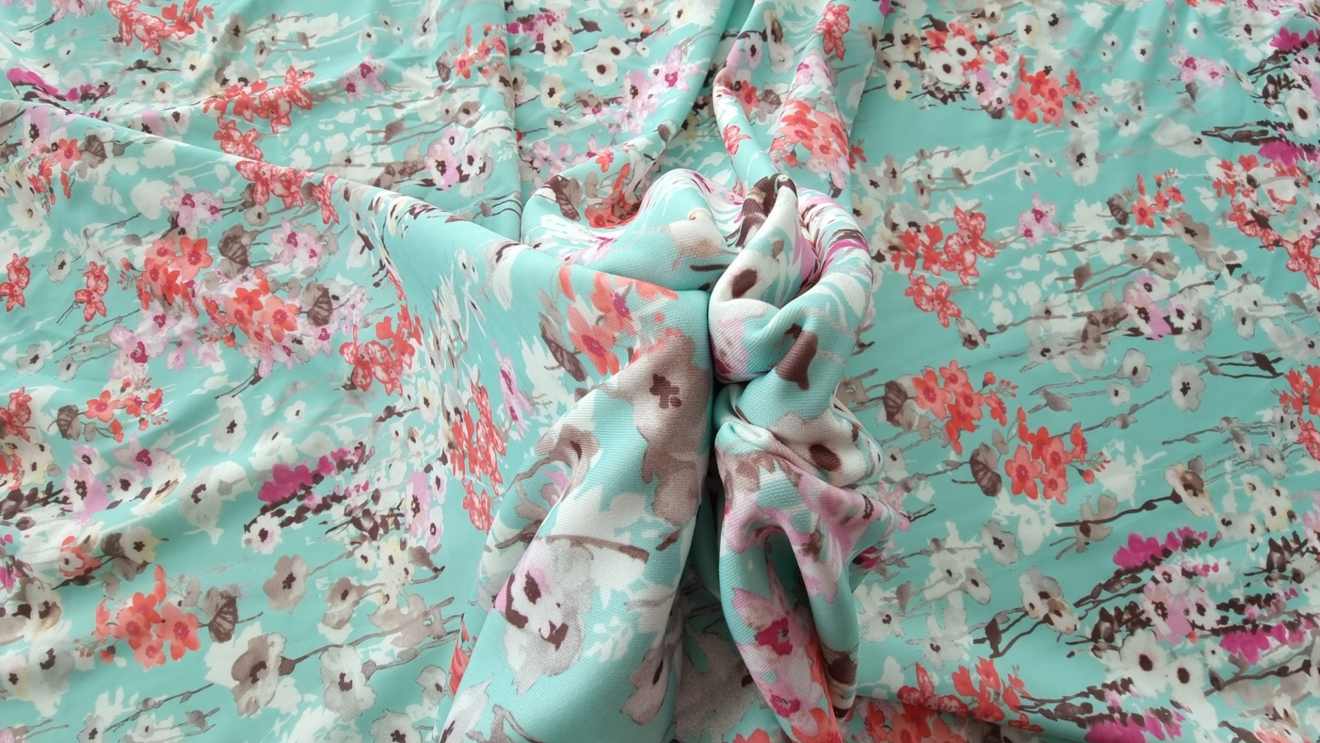 Jerse elastic imprimat floral mint, cu mare rezistenta la intindere si purtare.