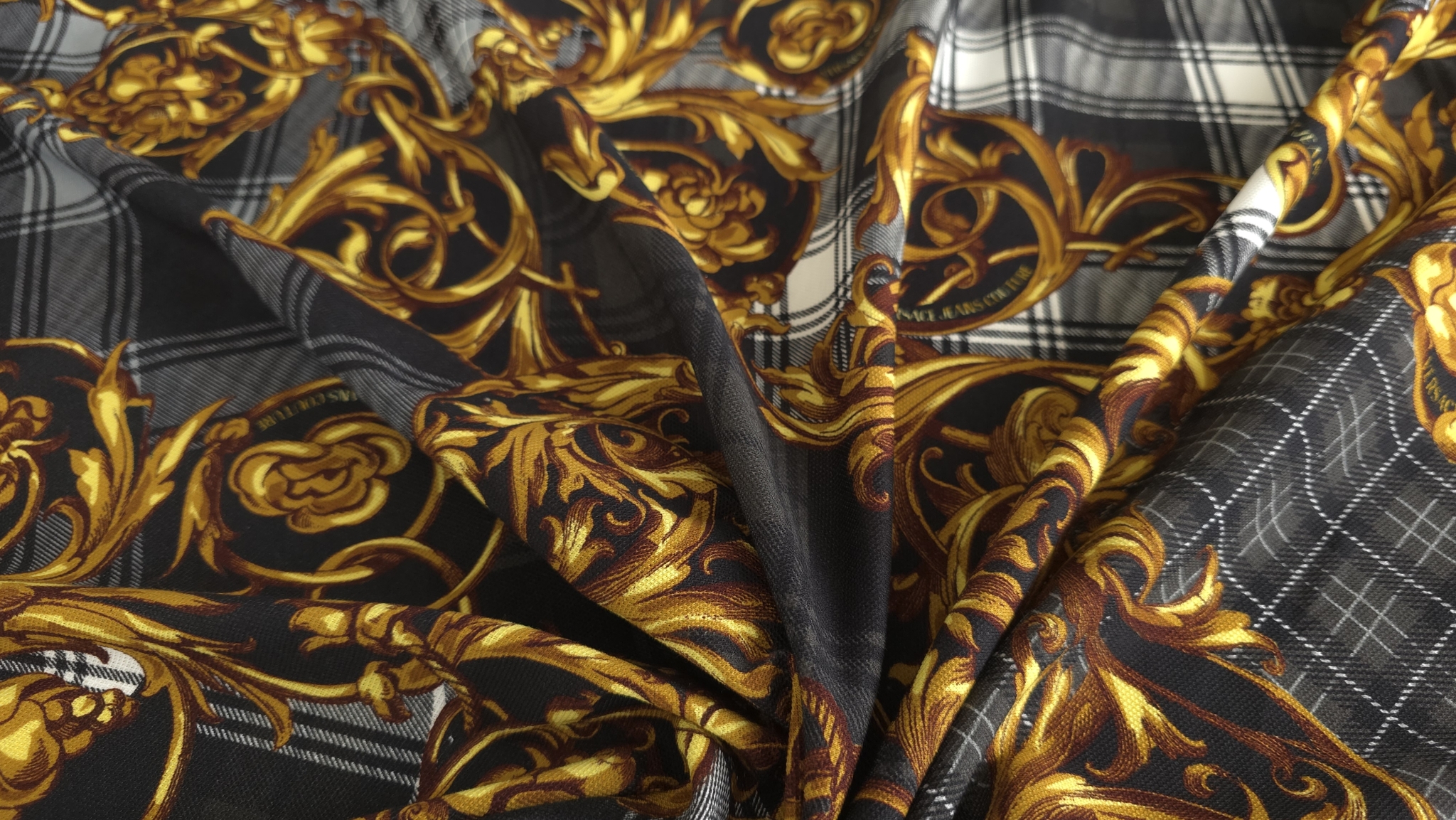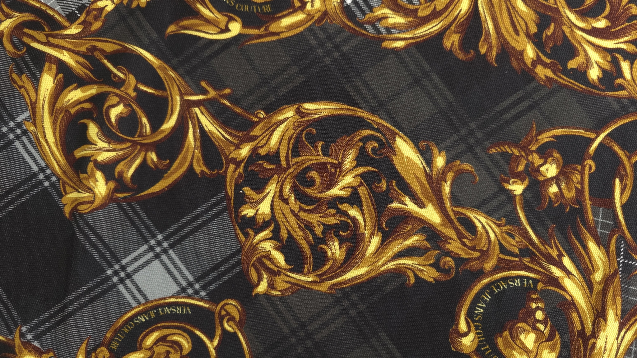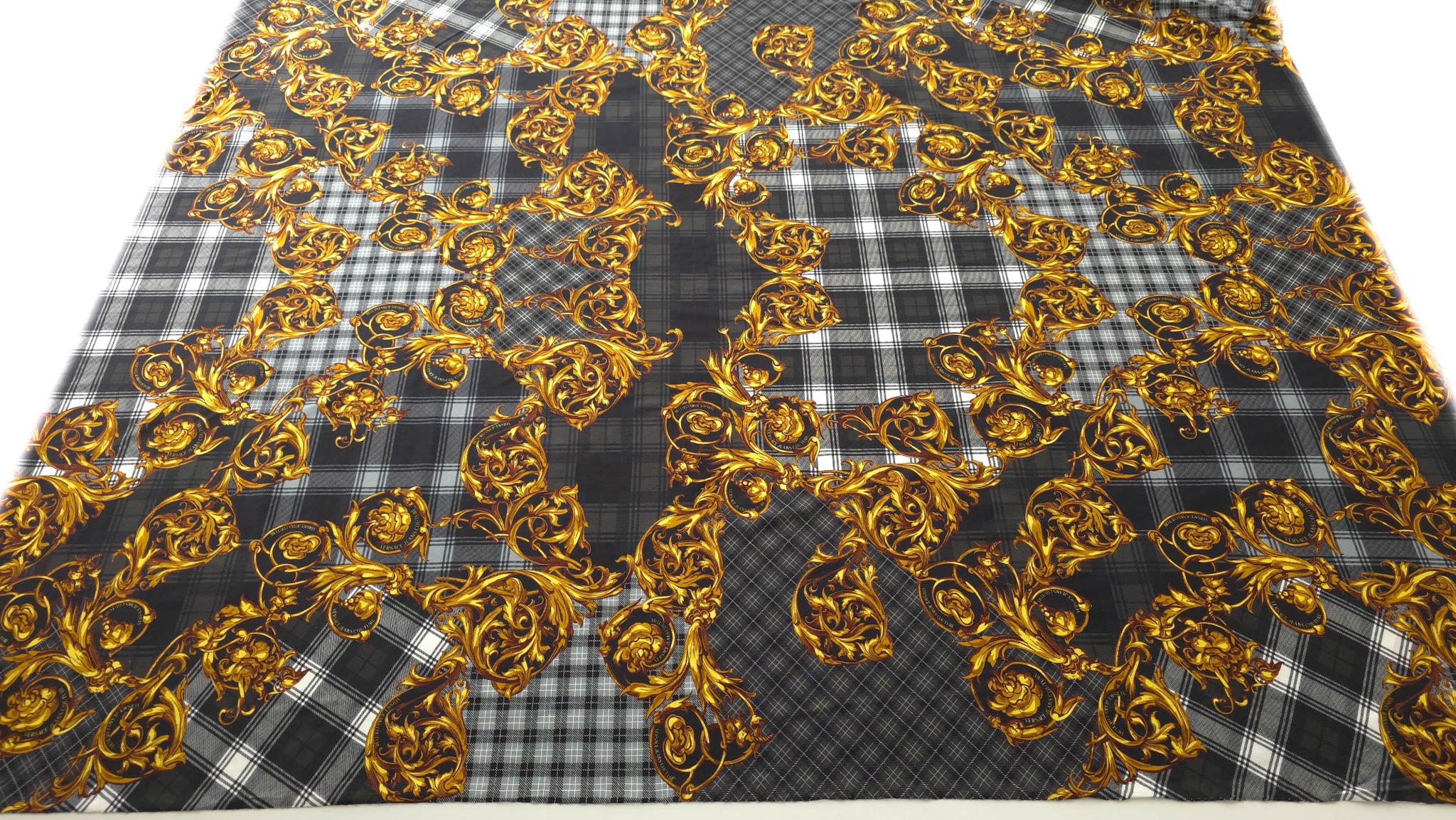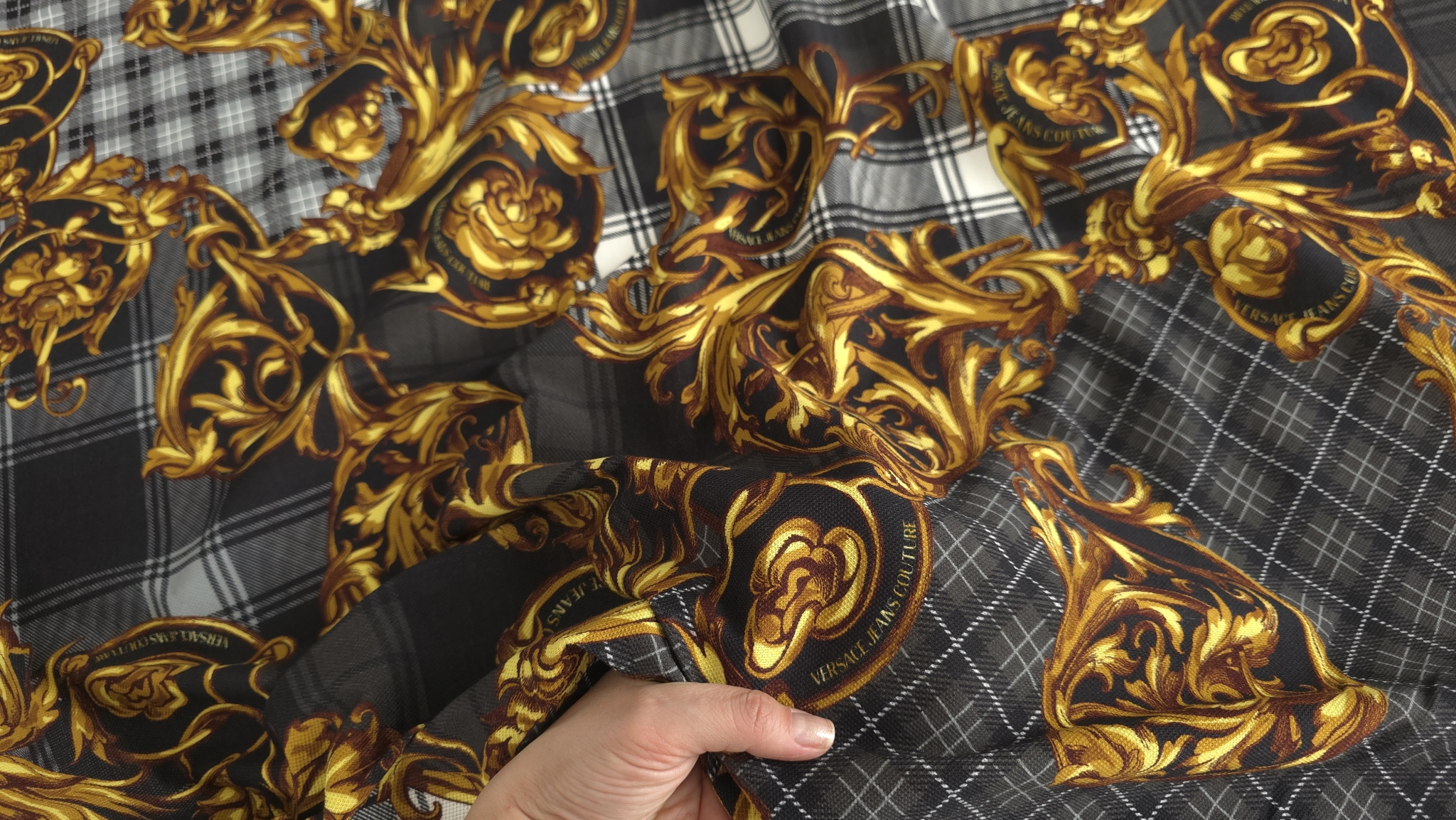 Acest jerseu bumbac cu imprimeu grafic combină un fundal în carouri alb-negru cu elemente decorative aurii și accente de roșu, albastru și verde. Modelul de tip logomania are un ritm continuu pe întreaga suprafață, oferind dinamism fără a încărca vizual compoziția. Este un material jerseu bumbac cu imprimeu multicolor care transformă orice croi simplu într-o piesă statement, modernă și plină de caracter.