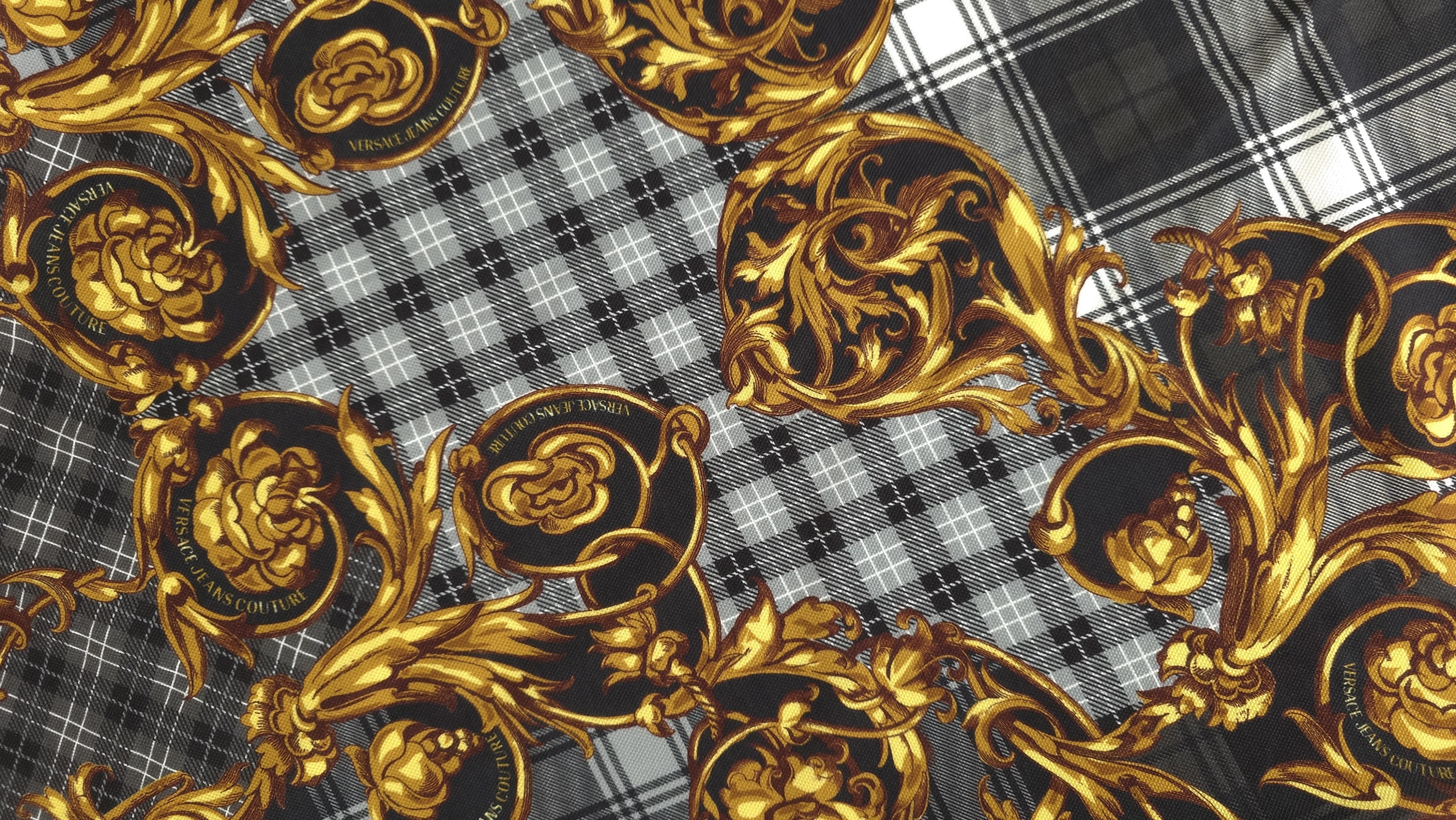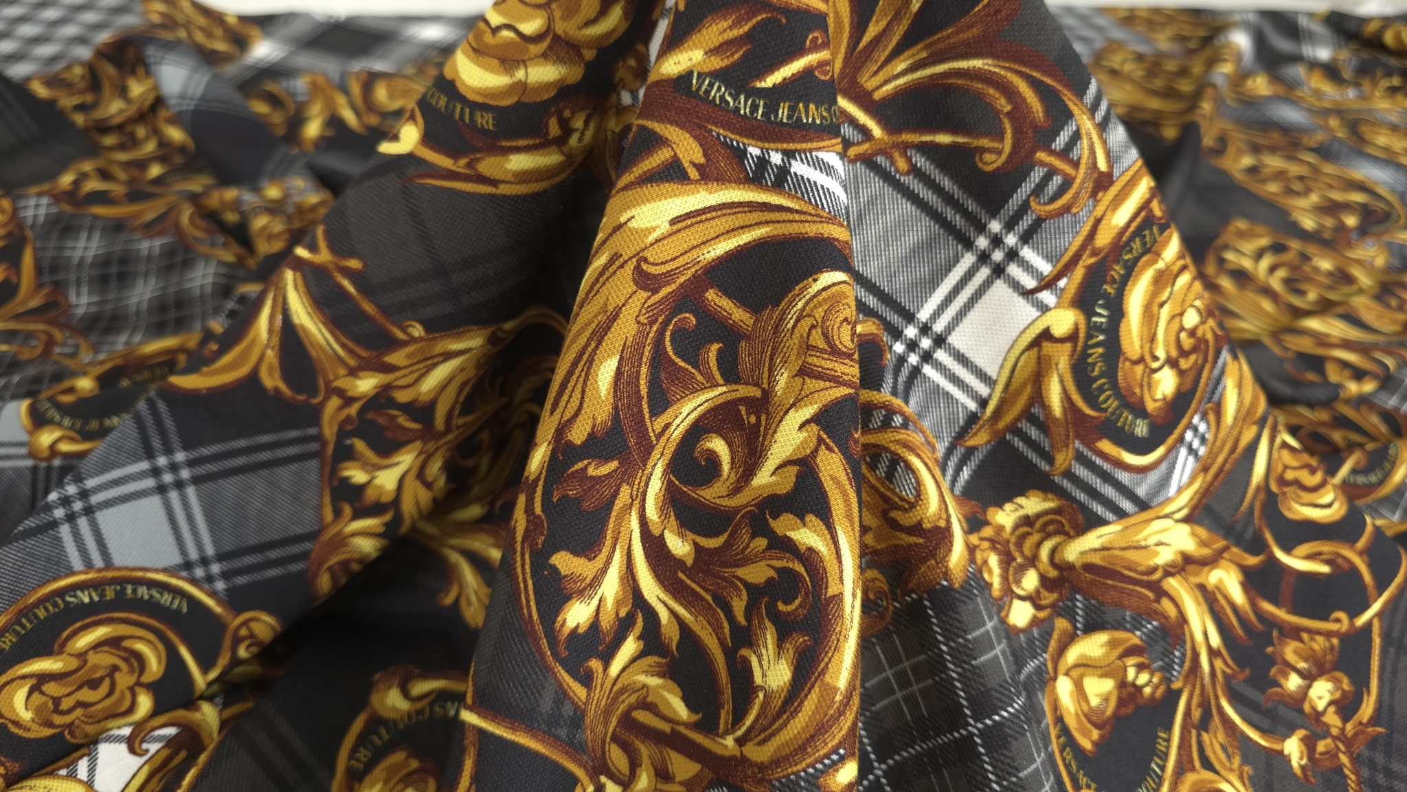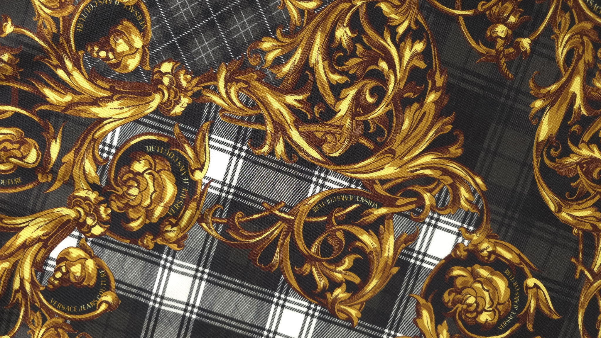 Acest jerseu bumbac cu imprimeu grafic combină un fundal în carouri alb-negru cu elemente decorative aurii și accente de roșu, albastru și verde. Modelul de tip logomania are un ritm continuu pe întreaga suprafață, oferind dinamism fără a încărca vizual compoziția. Este un material jerseu bumbac cu imprimeu multicolor care transformă orice croi simplu într-o piesă statement, modernă și plină de caracter.