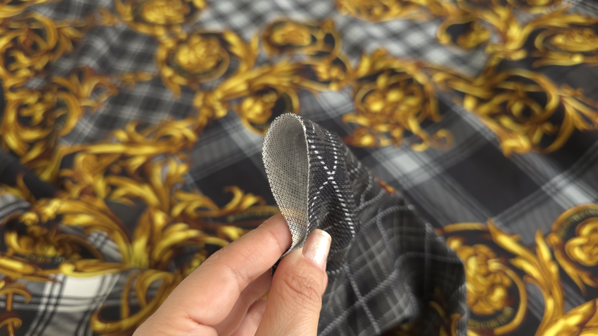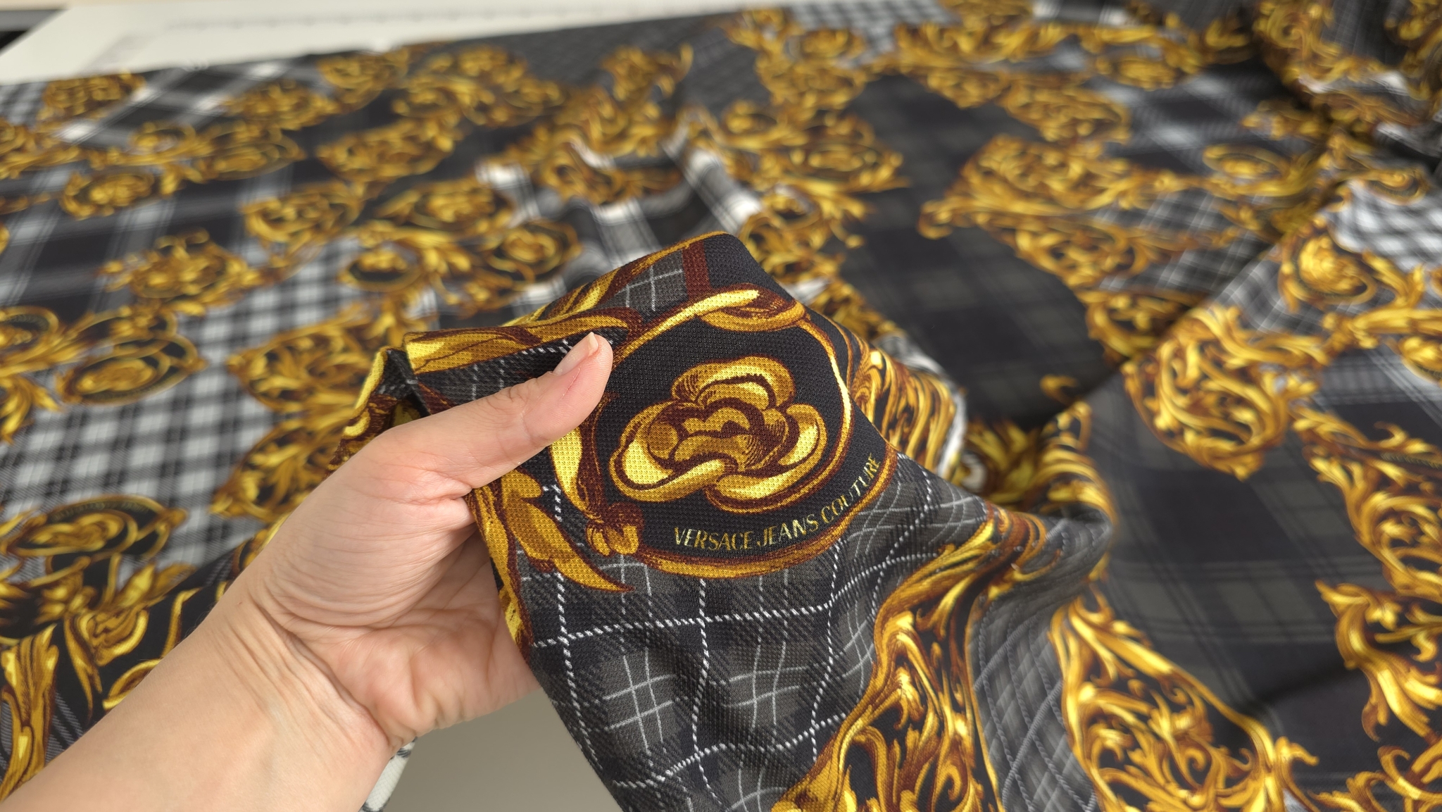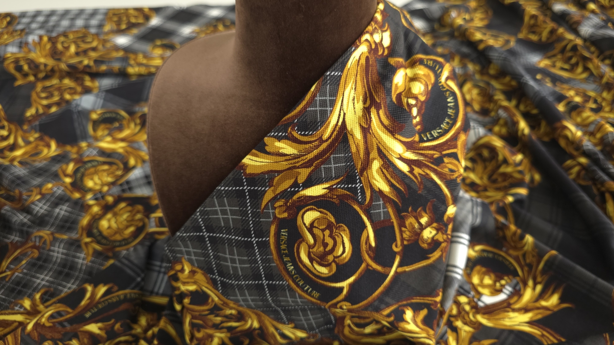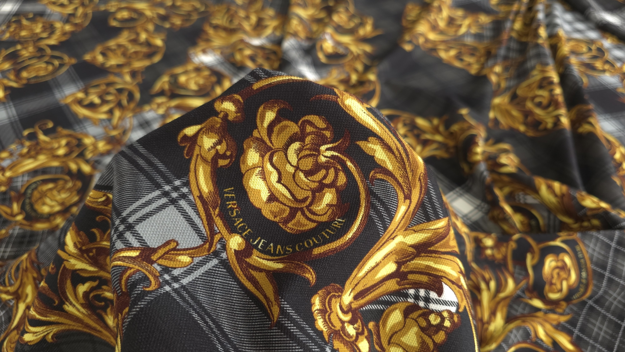 Acest jerseu bumbac cu imprimeu grafic combină un fundal în carouri alb-negru cu elemente decorative aurii și accente de roșu, albastru și verde. Modelul de tip logomania are un ritm continuu pe întreaga suprafață, oferind dinamism fără a încărca vizual compoziția. Este un material jerseu bumbac cu imprimeu multicolor care transformă orice croi simplu într-o piesă statement, modernă și plină de caracter.