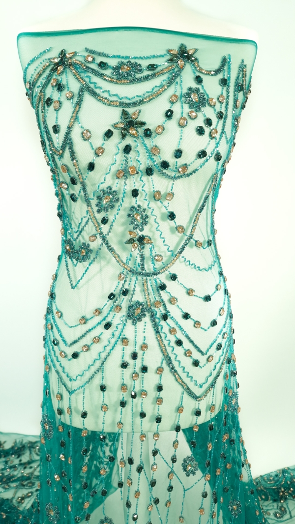Broderia este accesorizata manual cu: pietre, cristale, margelute rotunde si tubulare, in nuante de verde inchis si nude-rose, cusute manual pe tulle verde inchis, usor elastic.