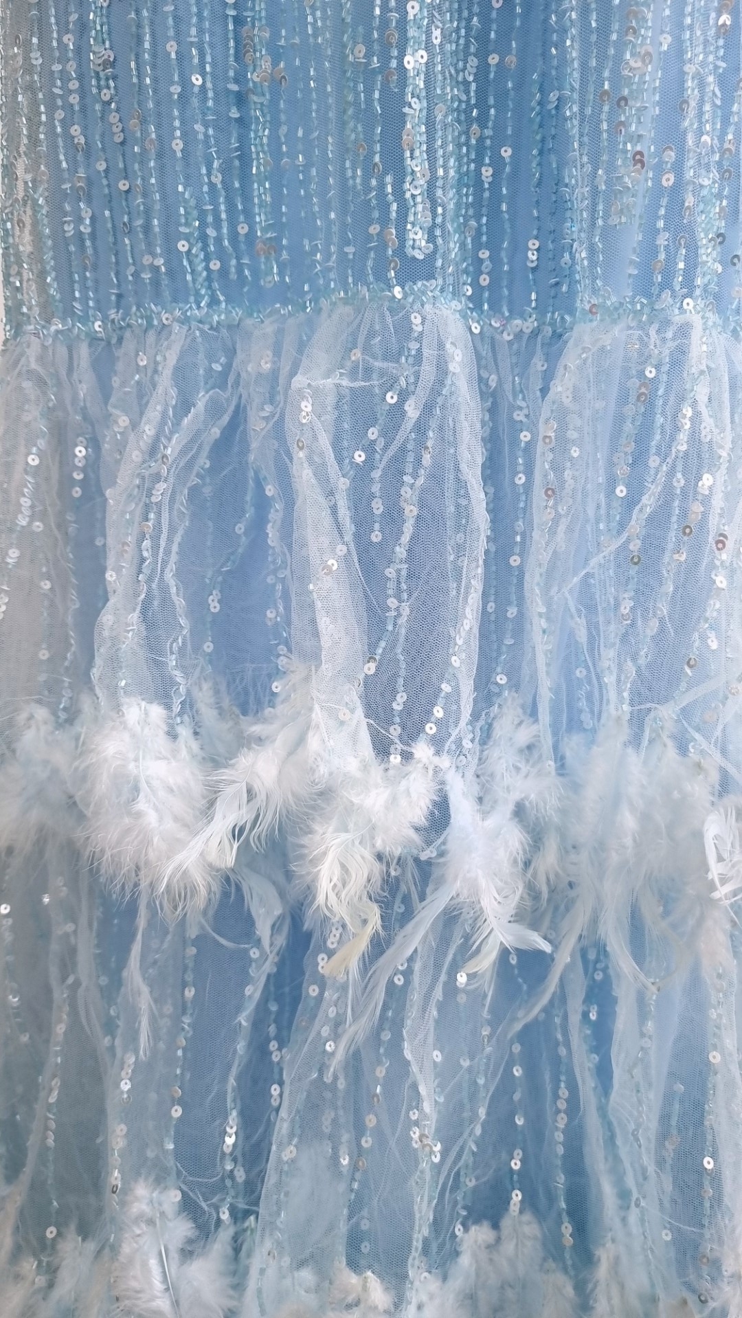 Accesorizarea este realizata din fulgi naturali, micropaiete si margele tubulare bleu, cusute manual pe intreaga suprafata a tulle-ului bleu, usor elastic.