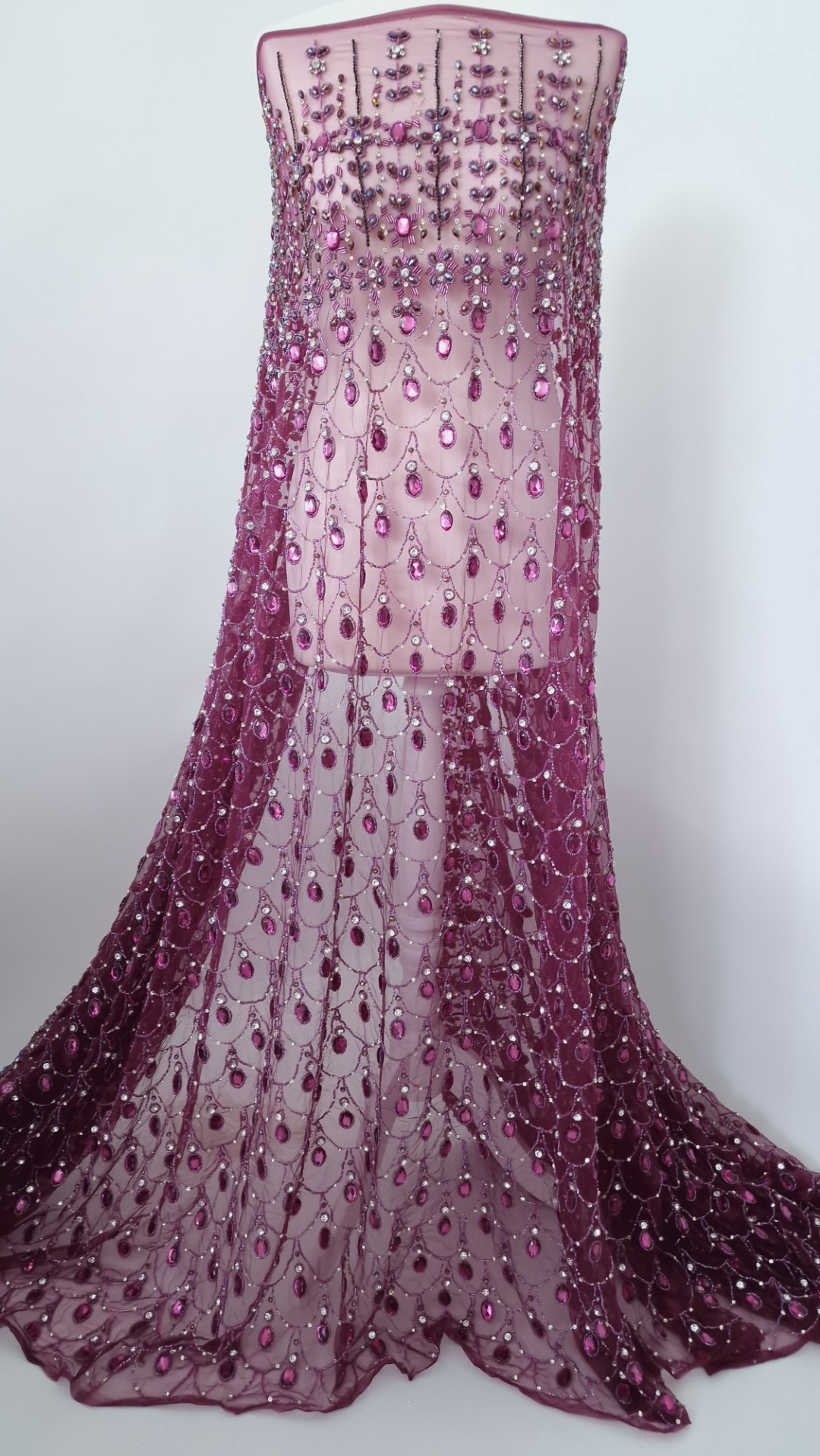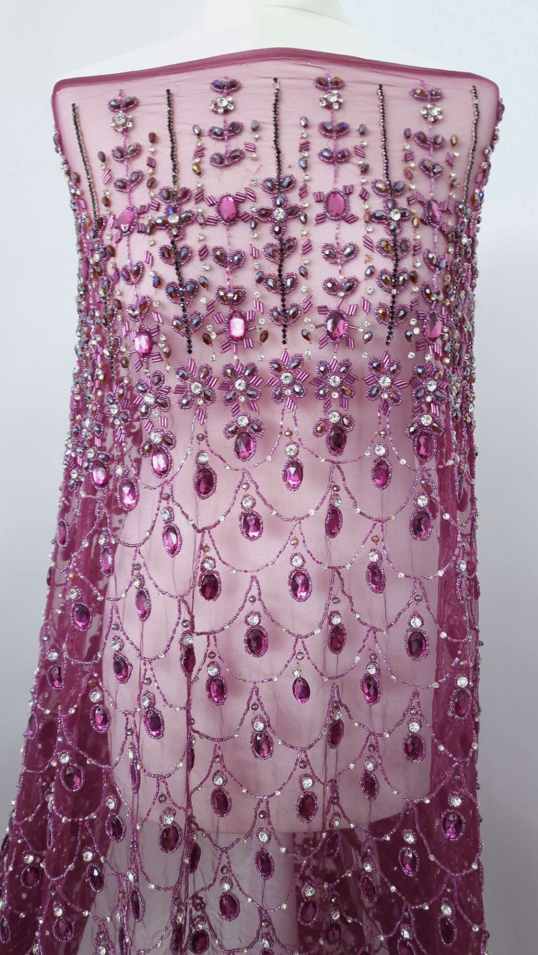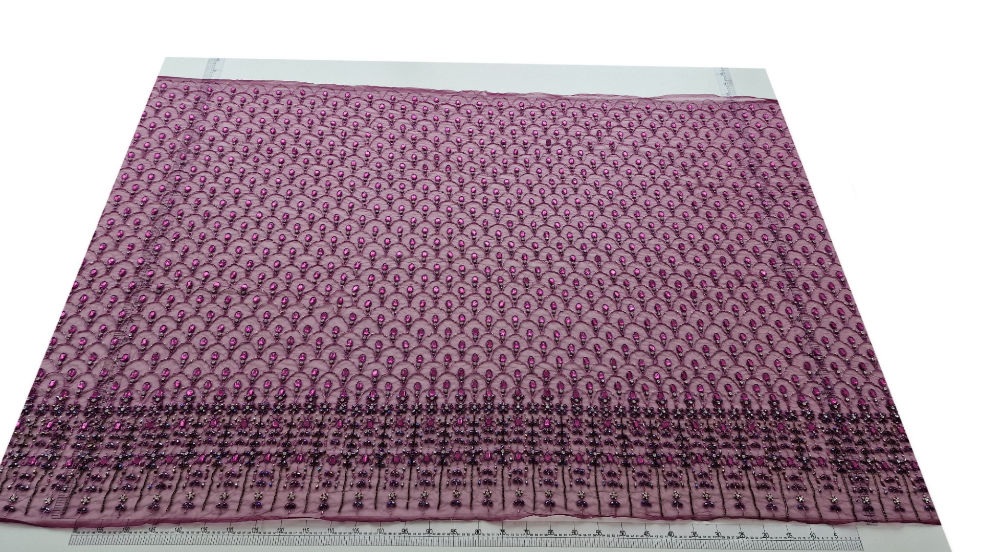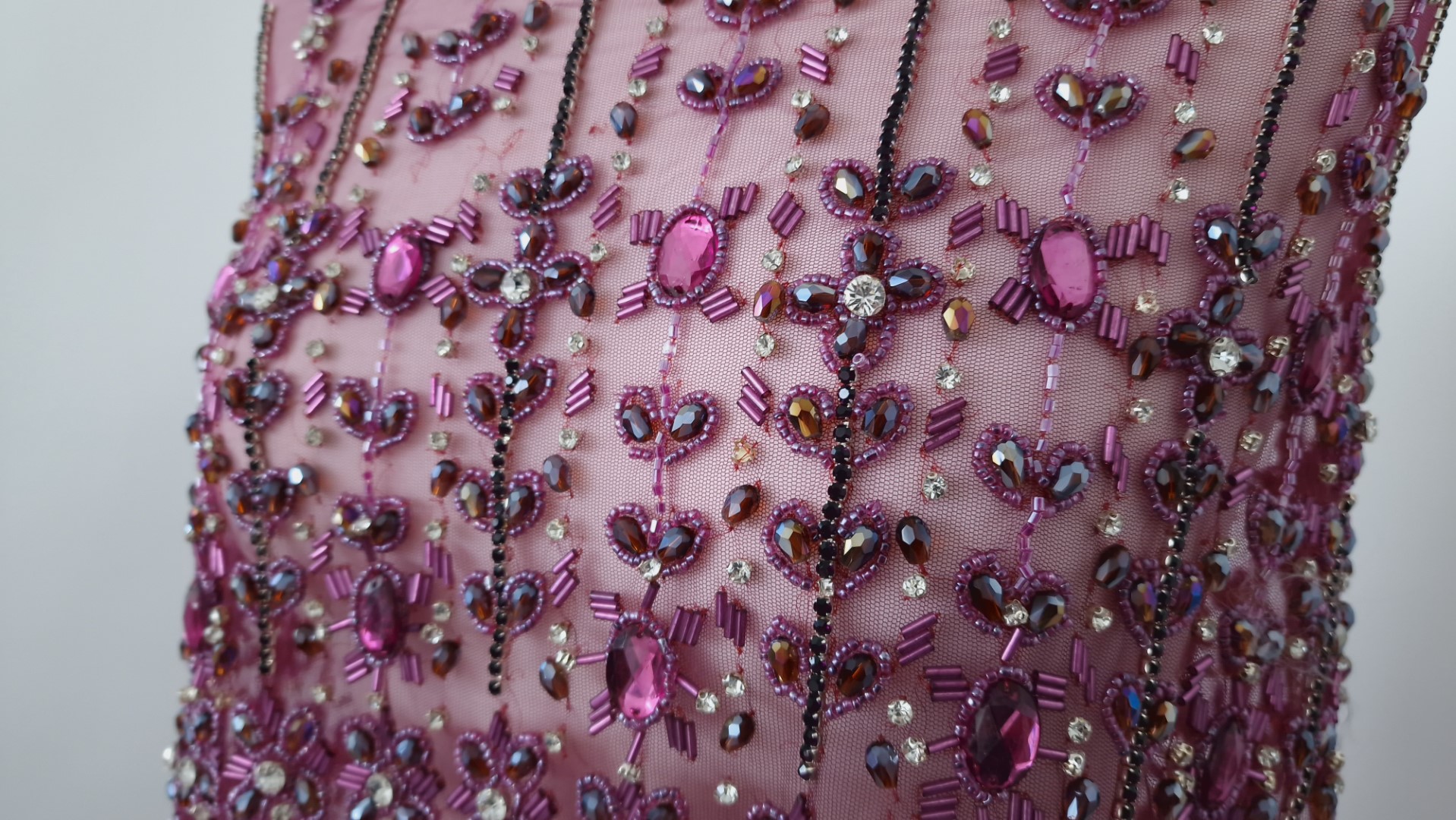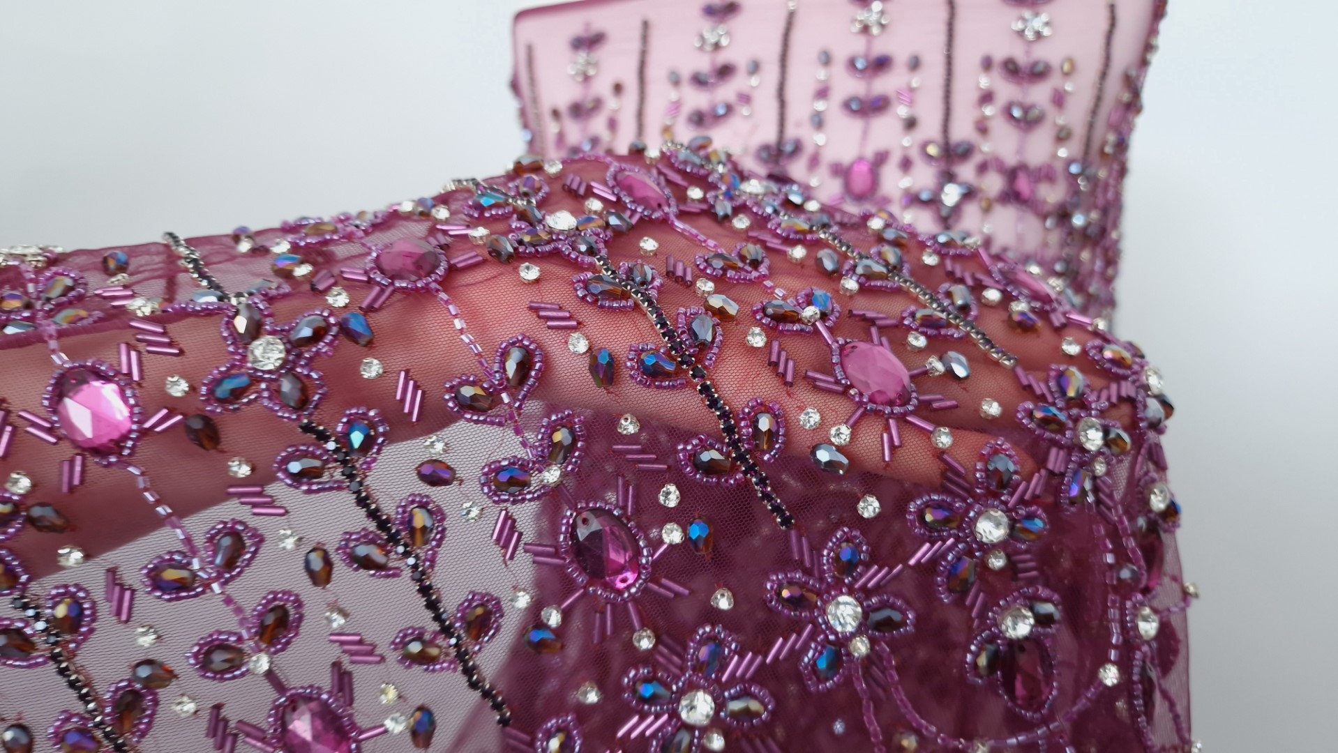 Broderia este accesorizata manual cu: margele, pietre, strasuri de diferite culori si dimensiuni, cusute manual pe tulle mov inchis, usor elastic.