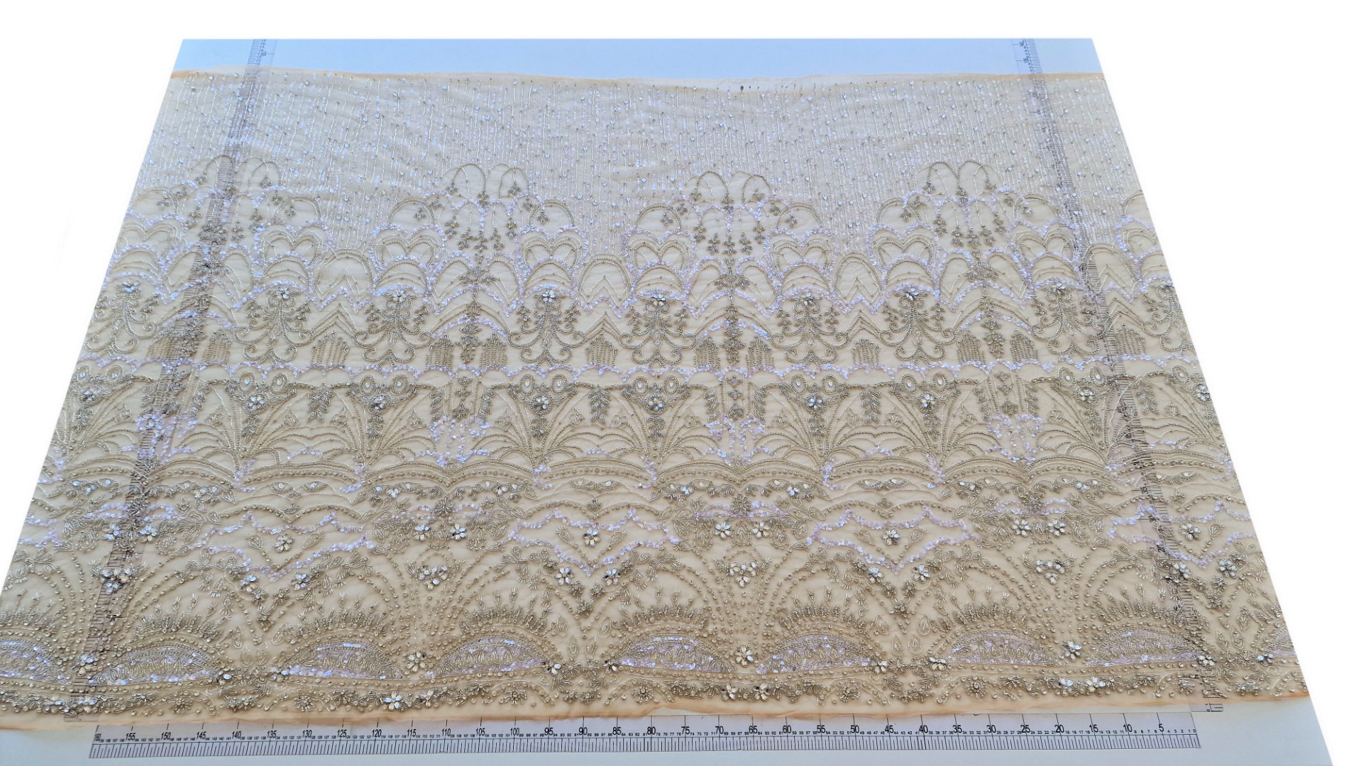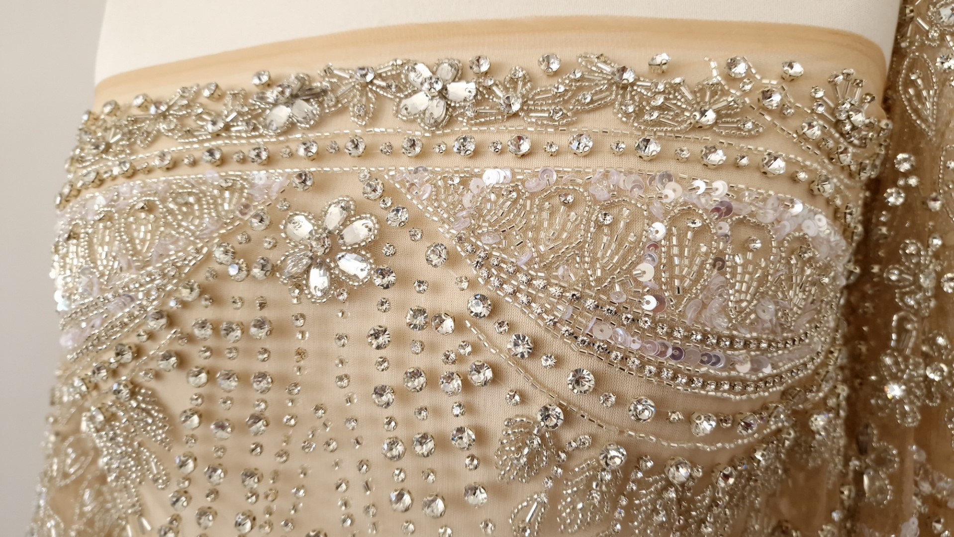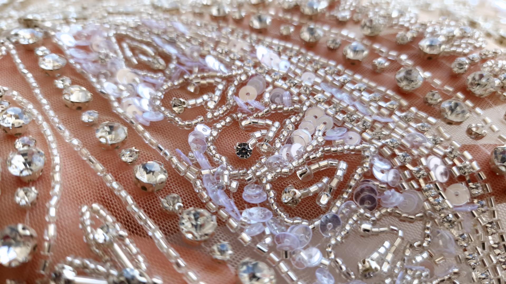 Broderia este accesorizata cu: pietre, margele, cristale, micropaiete de diferite dimensiuni, argintii, mov – lila deschis, cusute manual pe tulle nude, usor elastic.