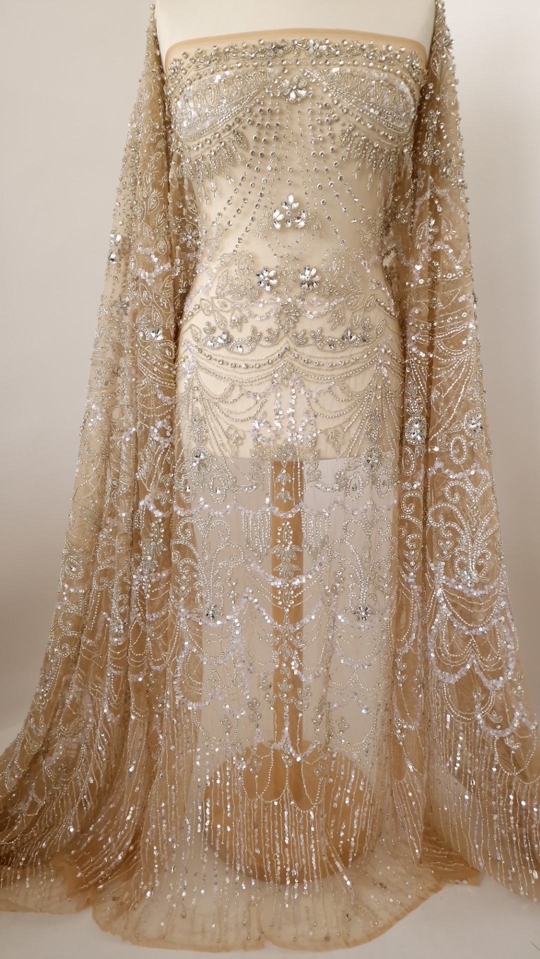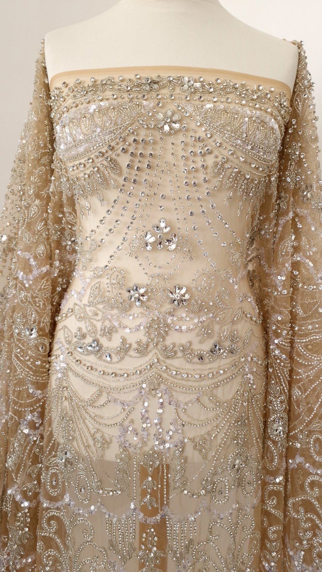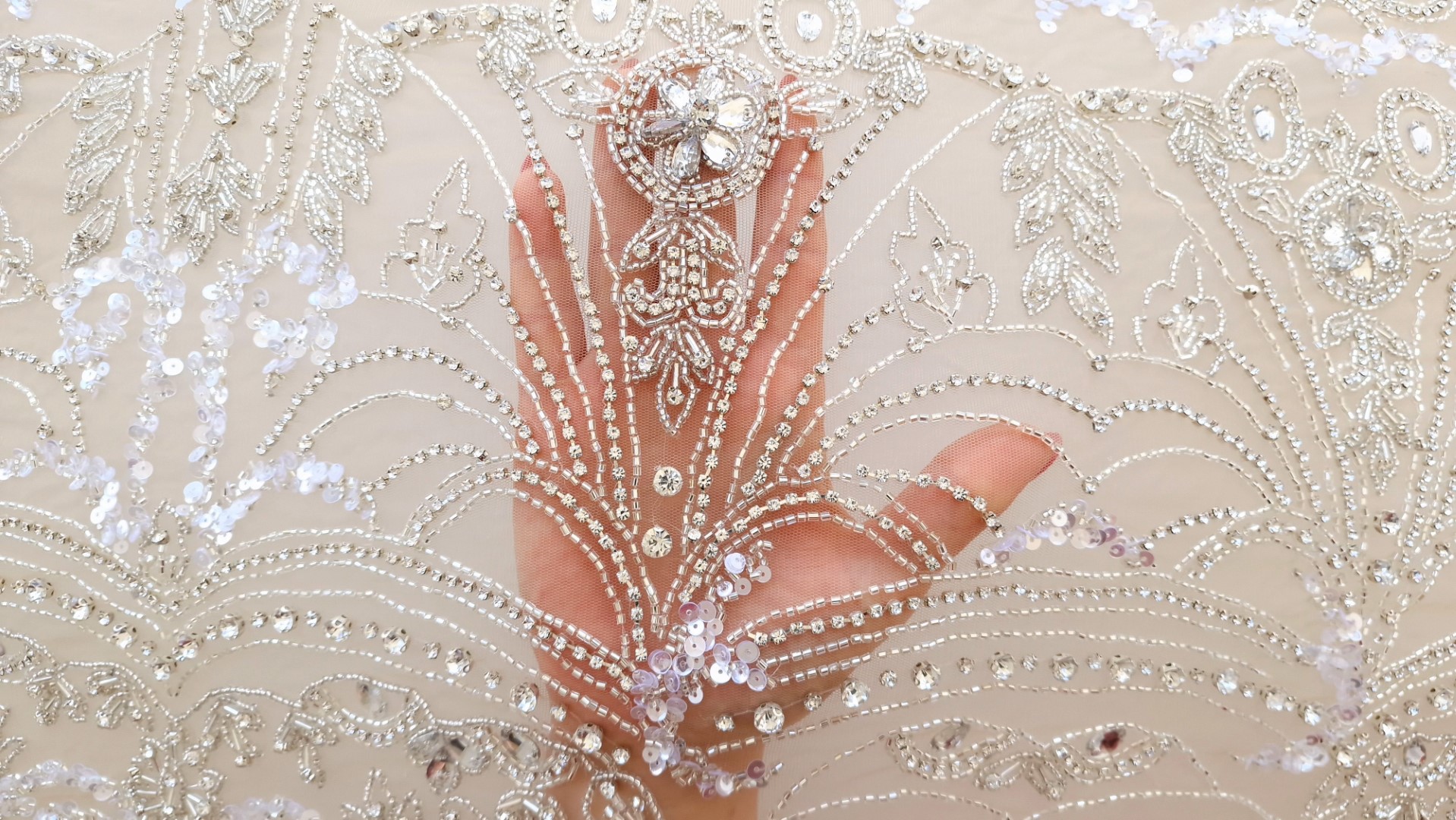 Broderia este accesorizata cu: pietre, margele, cristale, micropaiete de diferite dimensiuni, argintii, mov – lila deschis, cusute manual pe tulle nude, usor elastic.