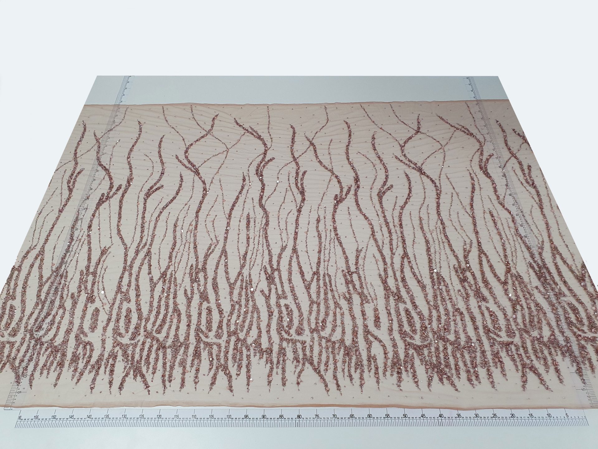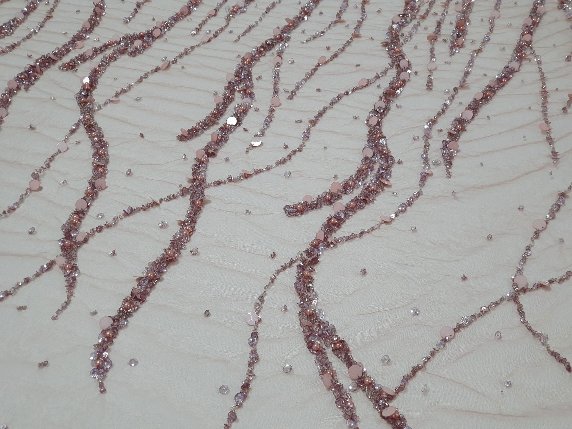 Broderia este formata din ramuri stilizate de perle, margelute si paiete de diferite dimensiuni, cusute individual pe tulle nude.