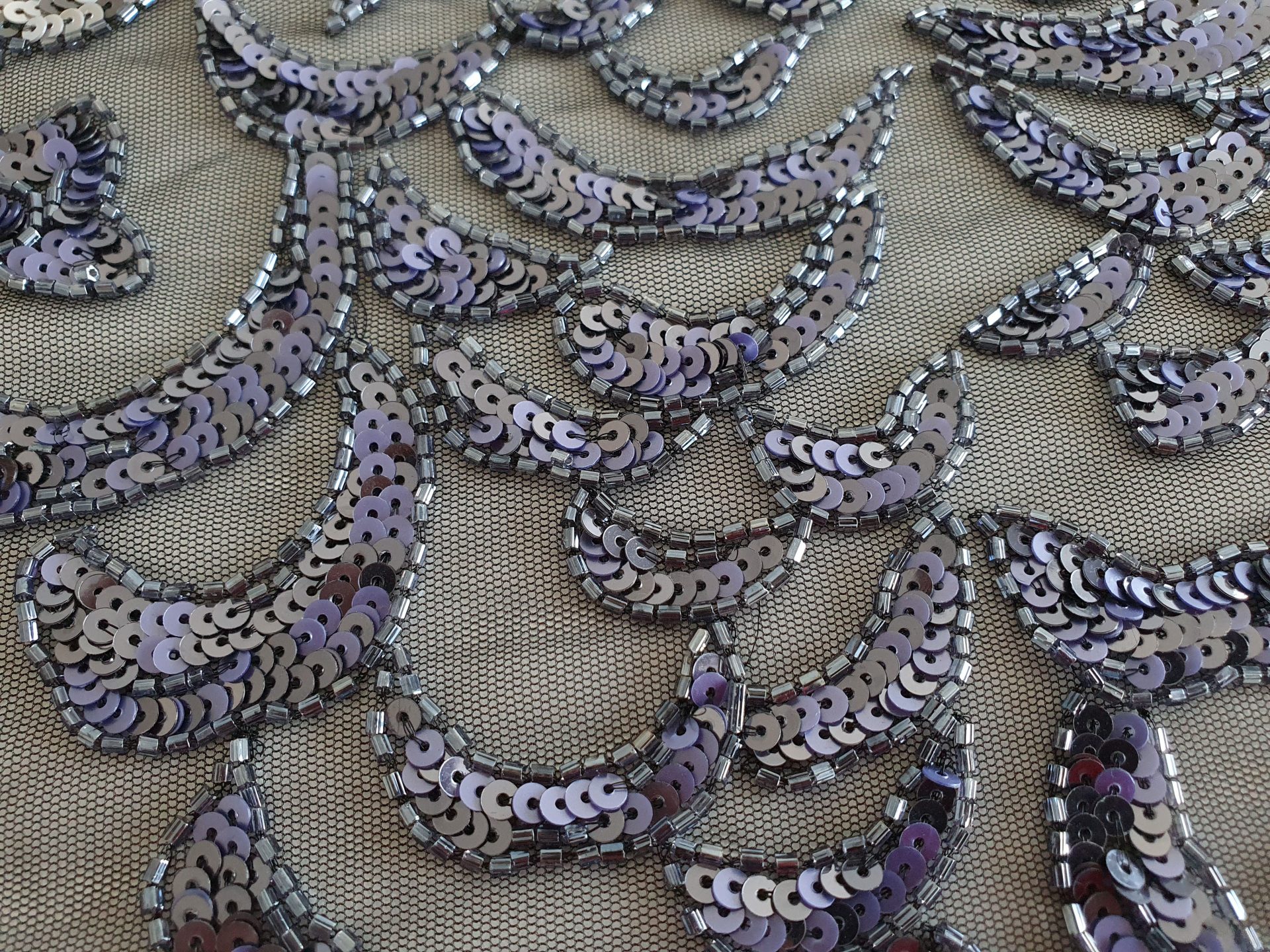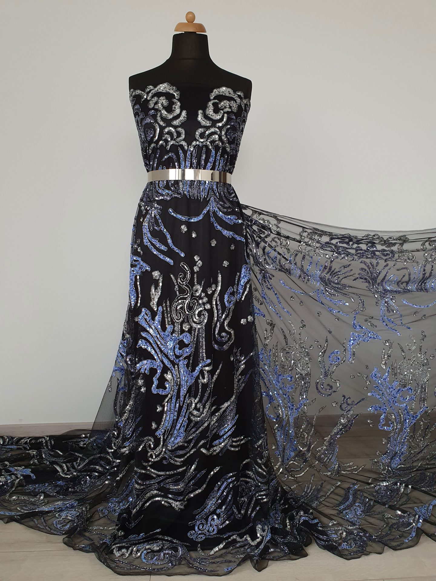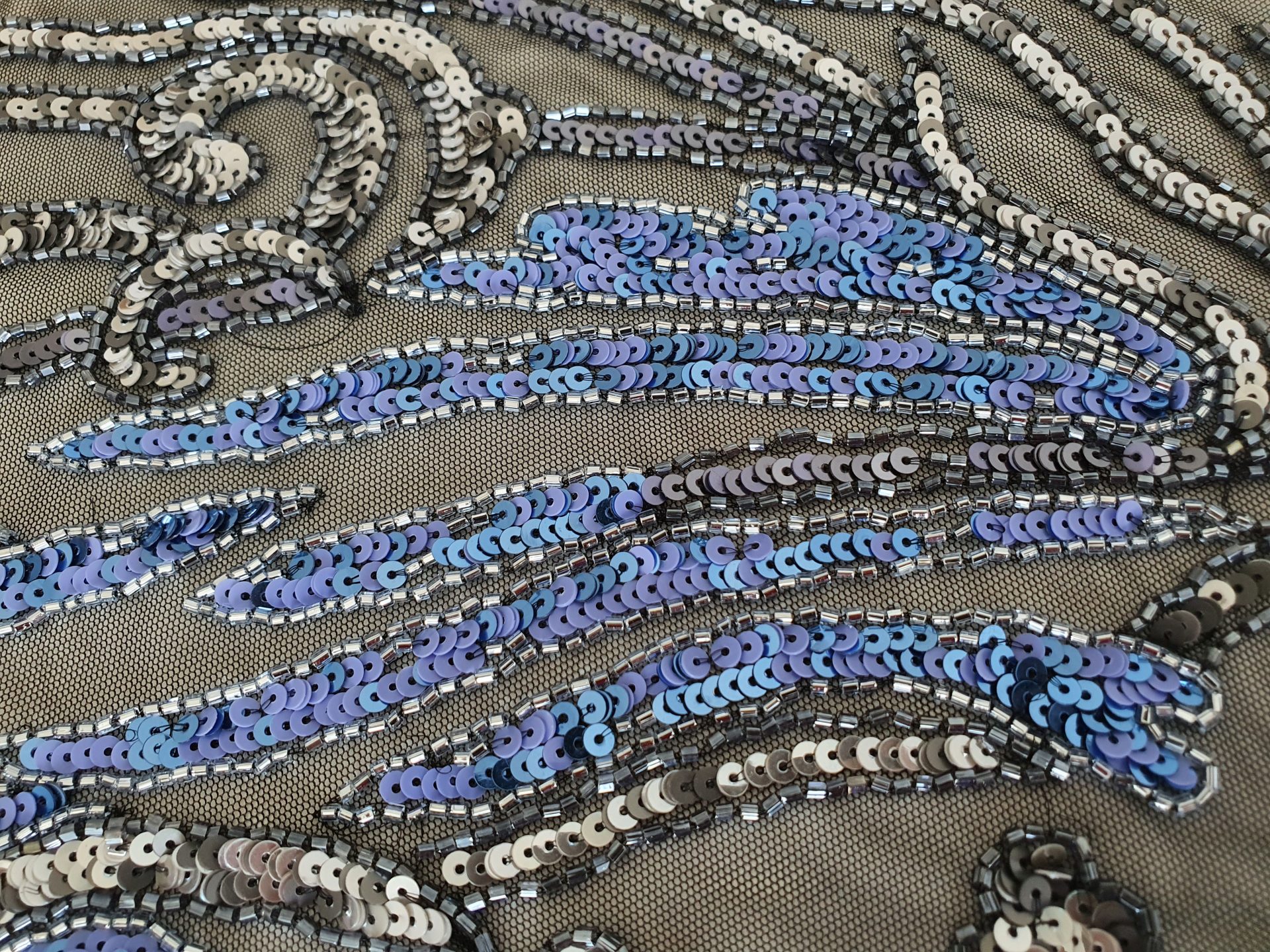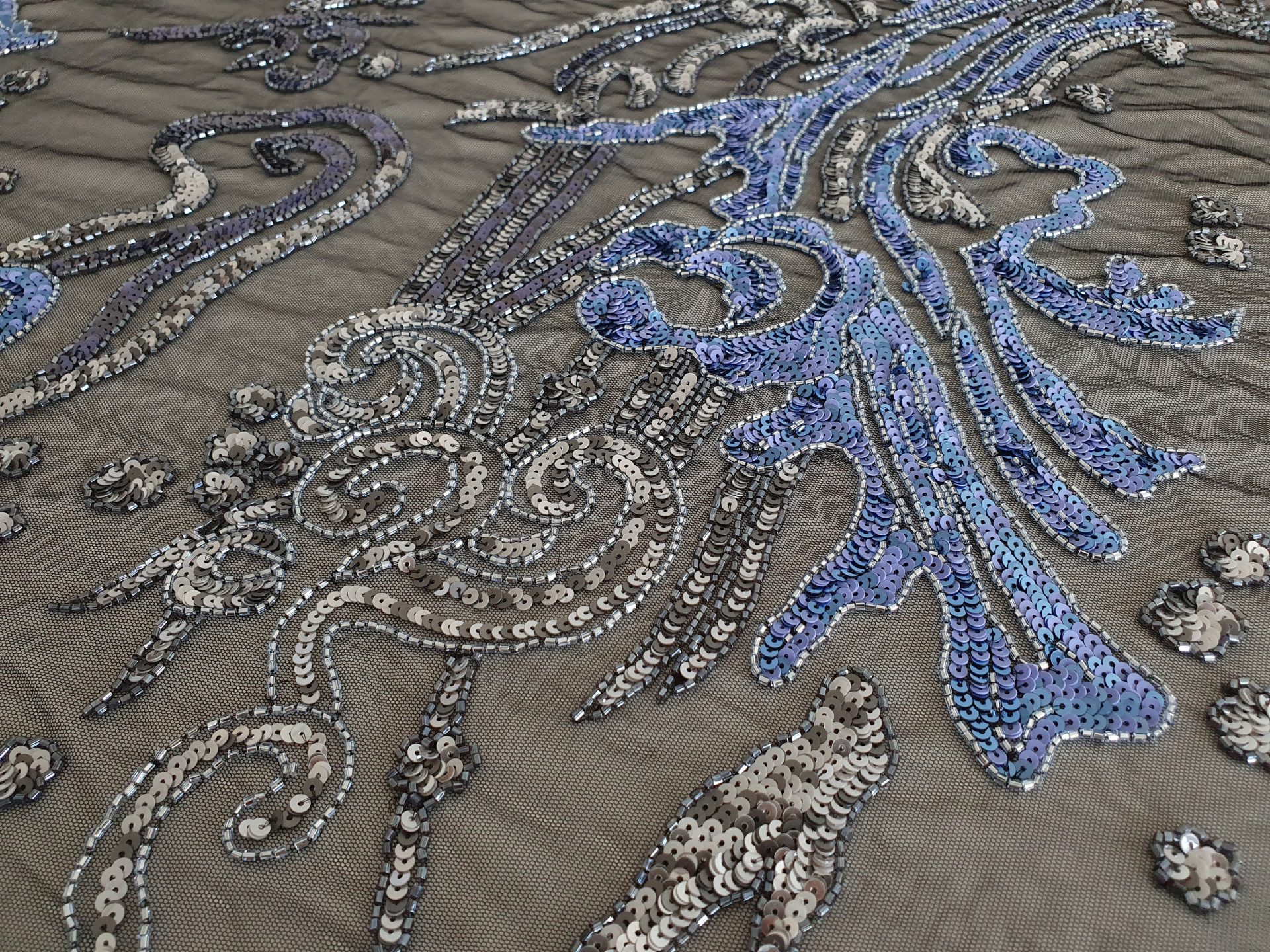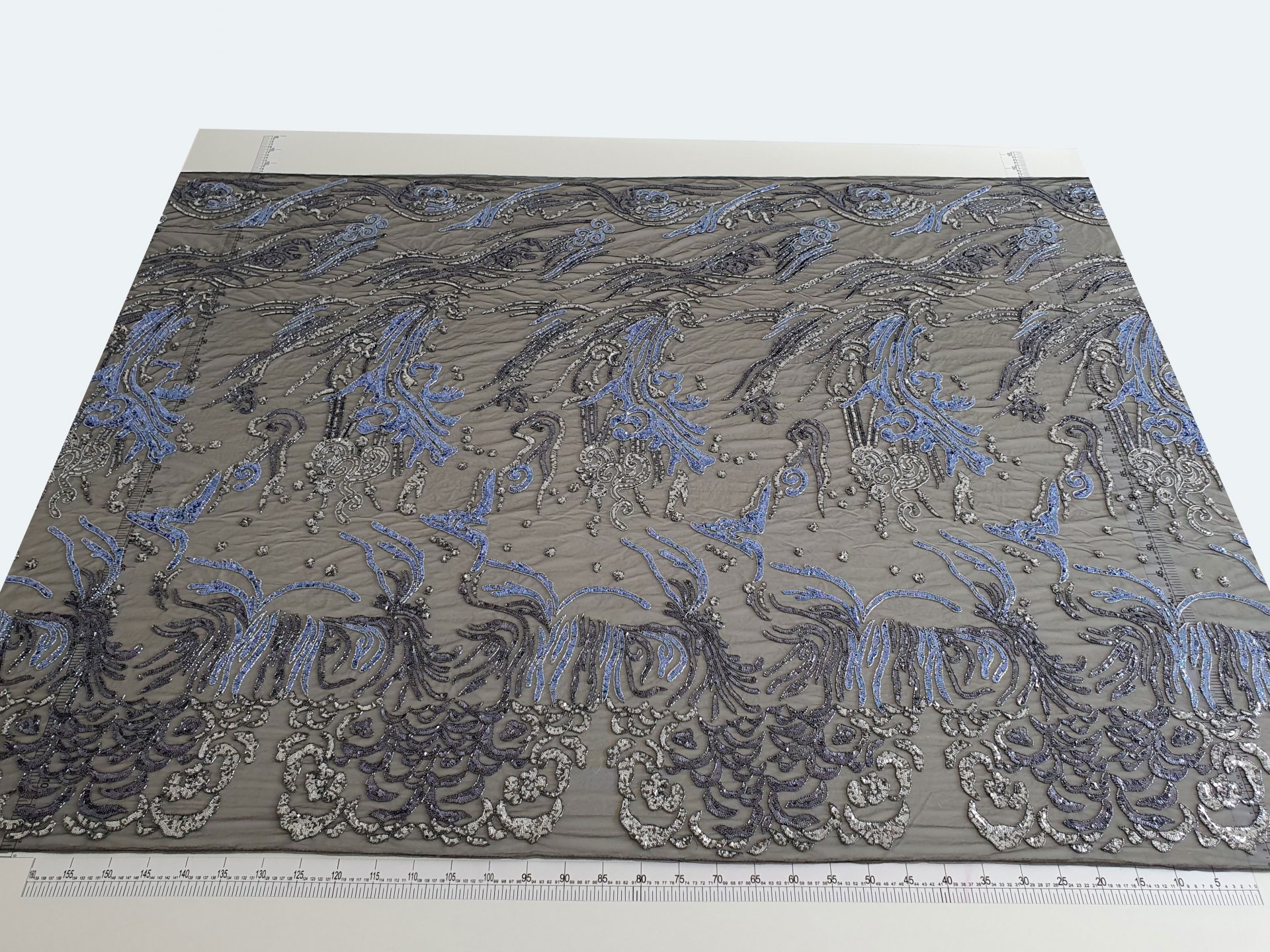 Broderie couture royal blue design Elie Saab, lucrata 100% manual din margele si paiete in tonuri de argintiu, albastru royal, albastru indigo si antracit.