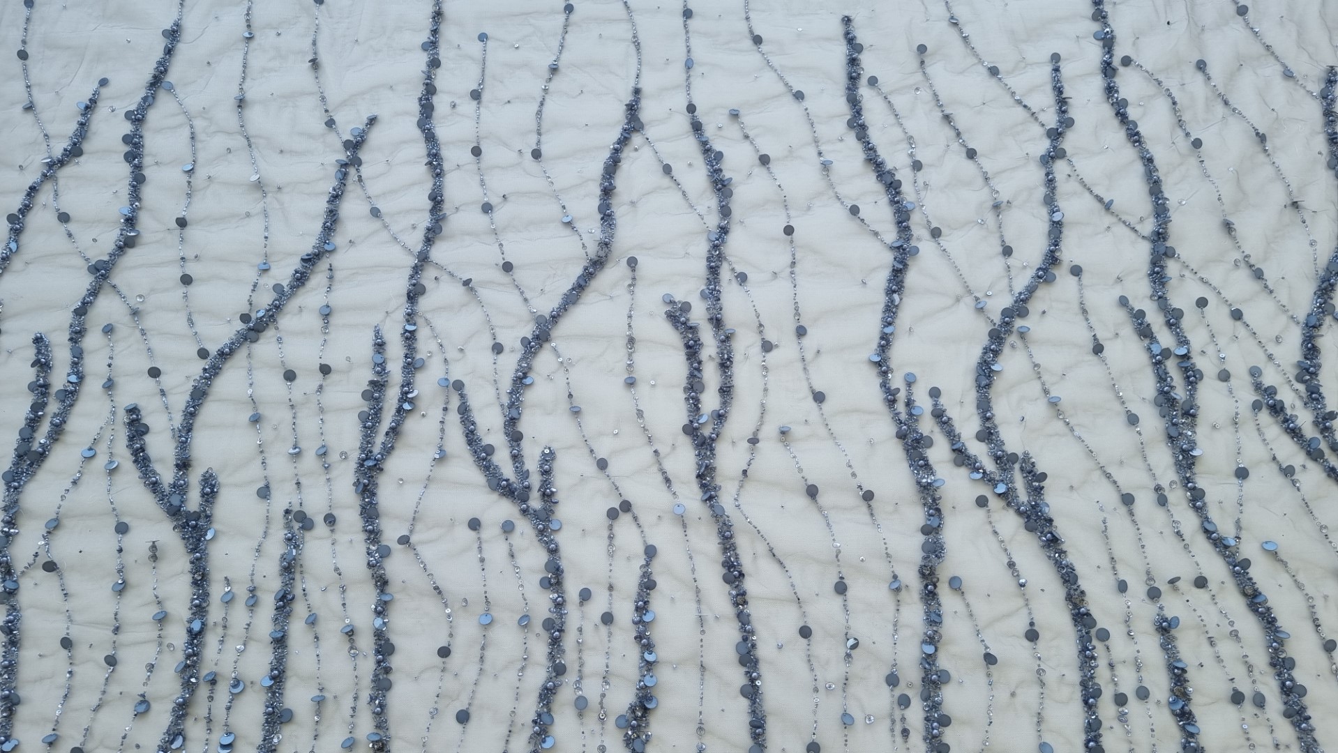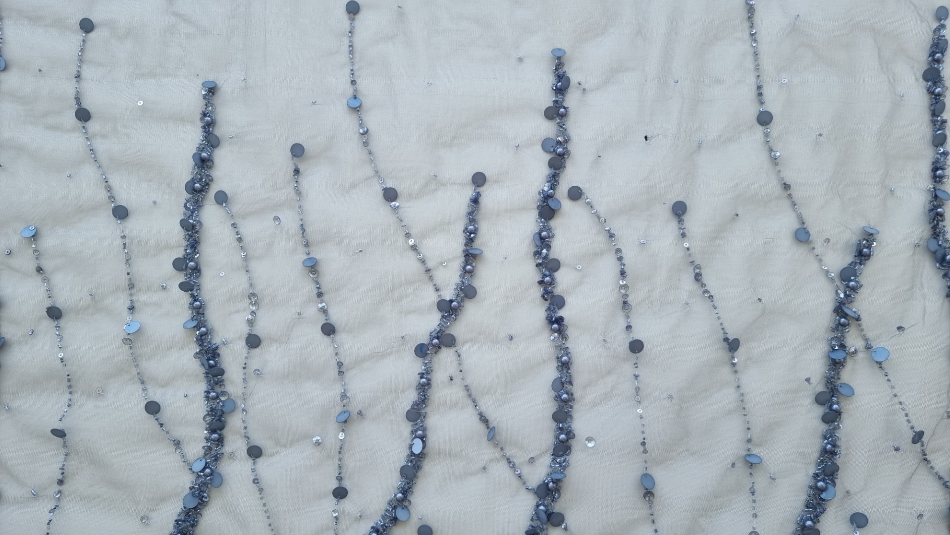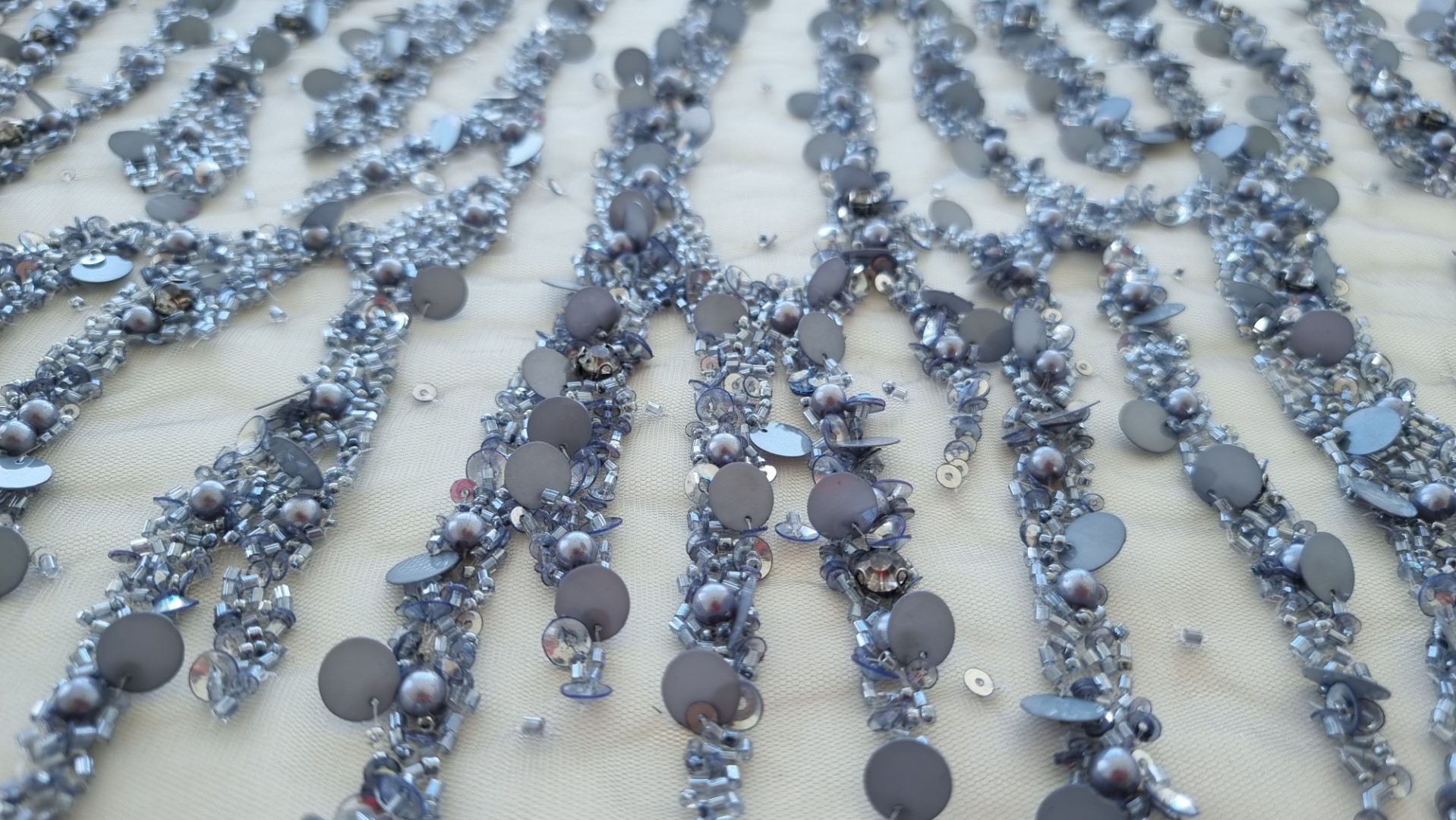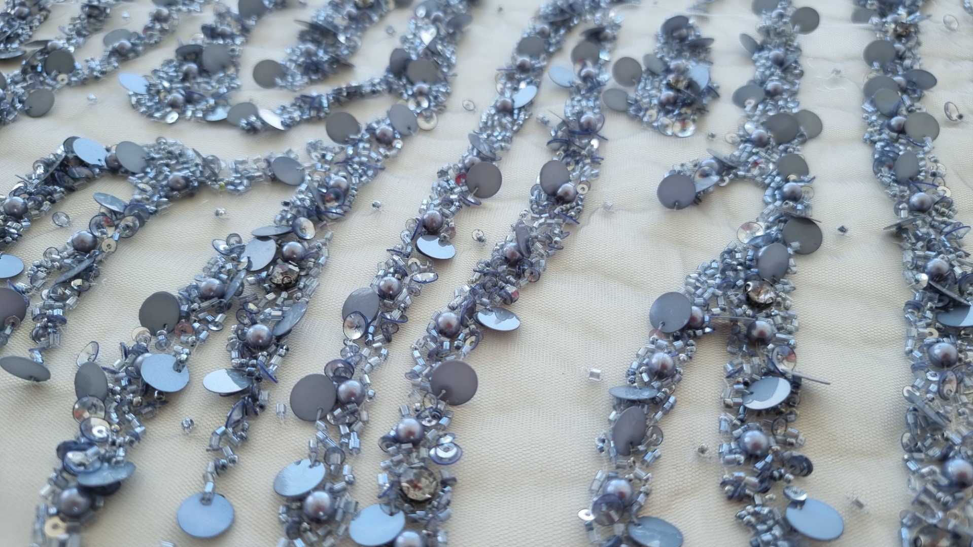 Broderie gri couture lucrata manual 100%, de inalta calitate a detaliilor si cu finisaje de exceptie. Broderia este formata din ramuri stilizate de perle gri, margelute si paiete de diferite dimensiuni, cusute individual pe tulle gri. Aceasta tesatura poate fi usor decupabila, fara ca modelul sa fie afectat, si reaplicata intr-o maniera personala pe tinuta dorita. Designul spectaculos este dat de modul in care sunt dispuse accesoriile reliefate pe intreaga suprafata a tesaturii.