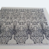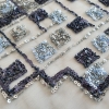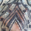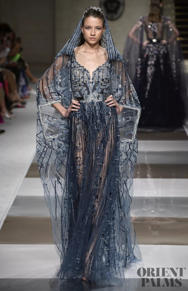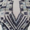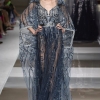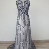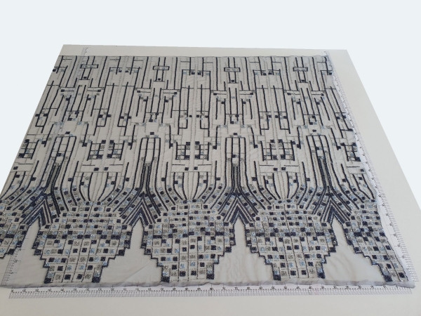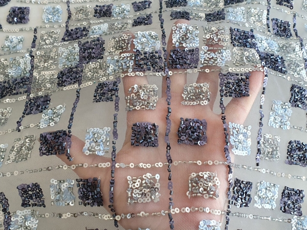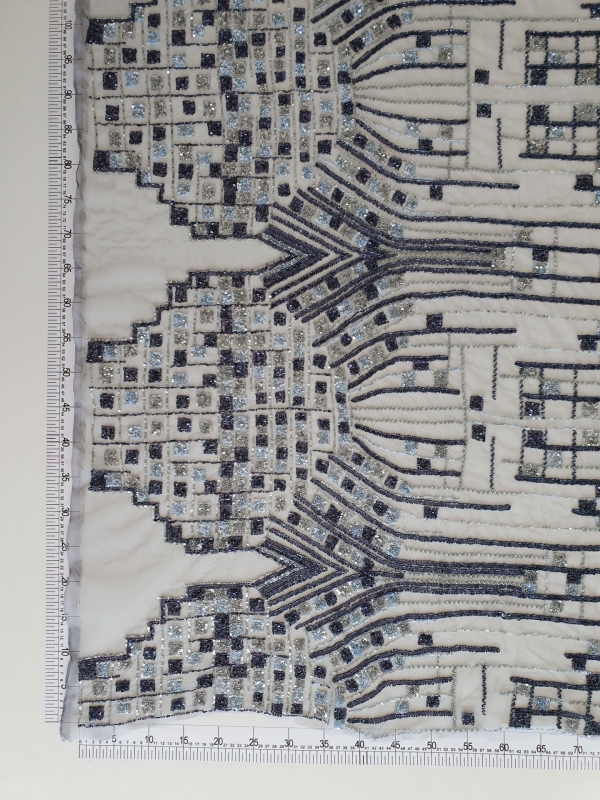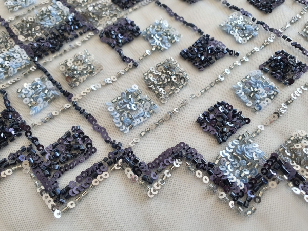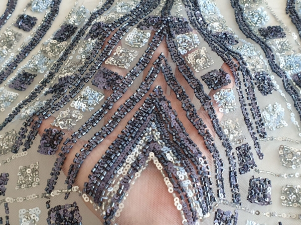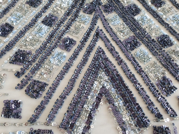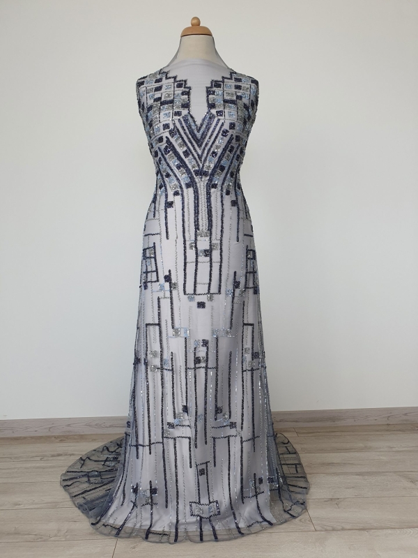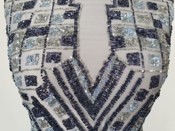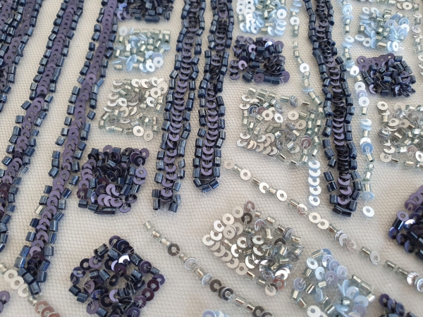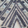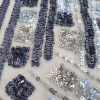 Broderie navy silver design Ziad Nakad, realizata in totalitate manual din margele si paiete in tonuri de argintiu, bleumarin si bleu, cusute pe tulle usor elastic, de culoare gri petrol.