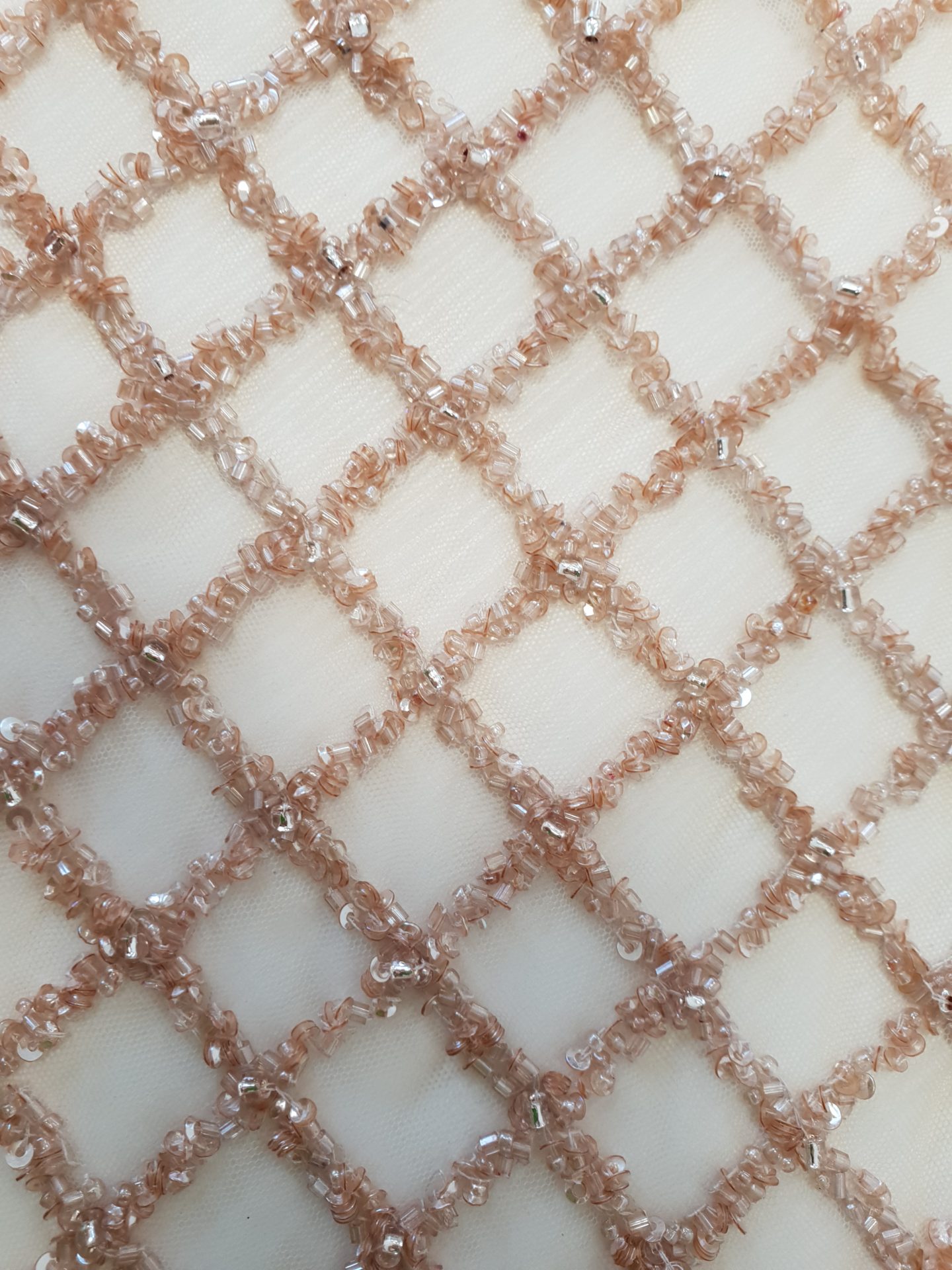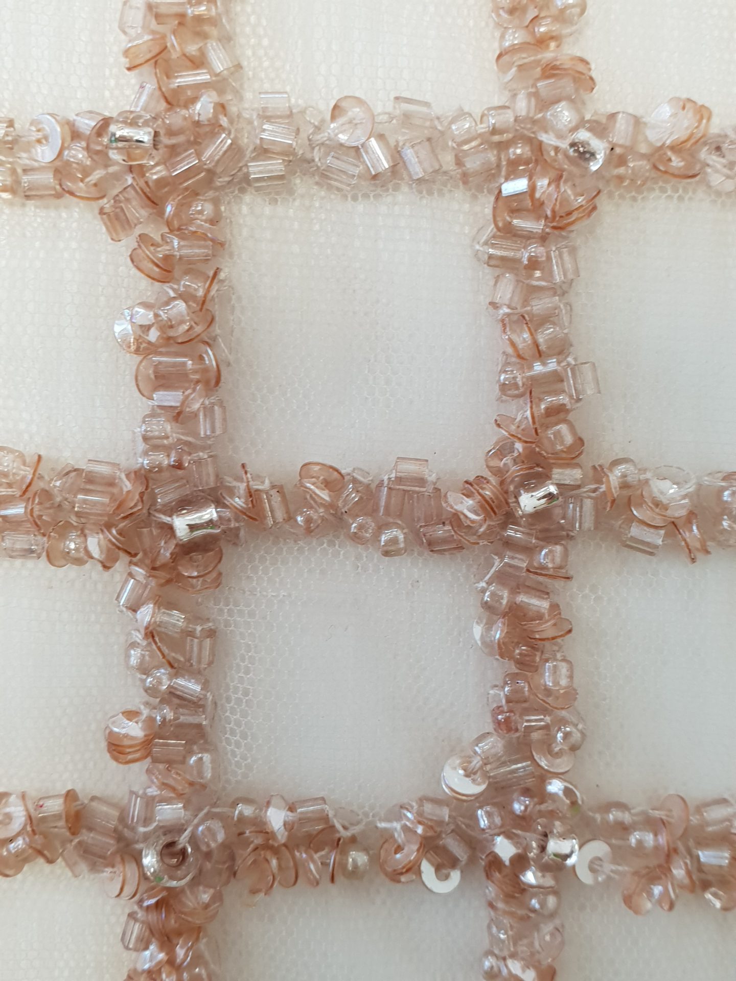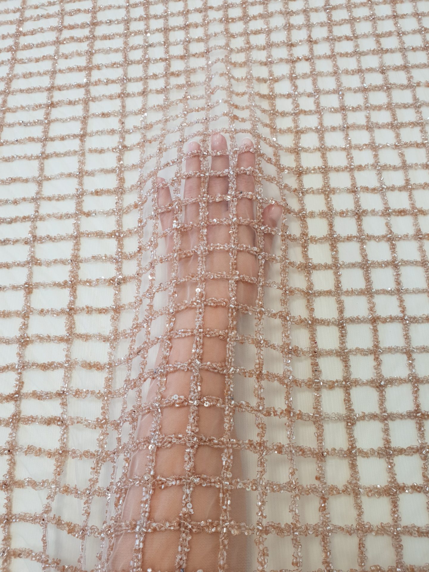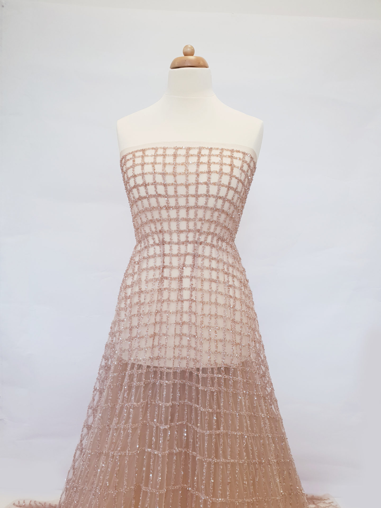 Broderie nude pudra cu motive geometrice, design Zuhair Murad, cusuta integral din margelute si paiete brodate manual pe tul nude deschis.