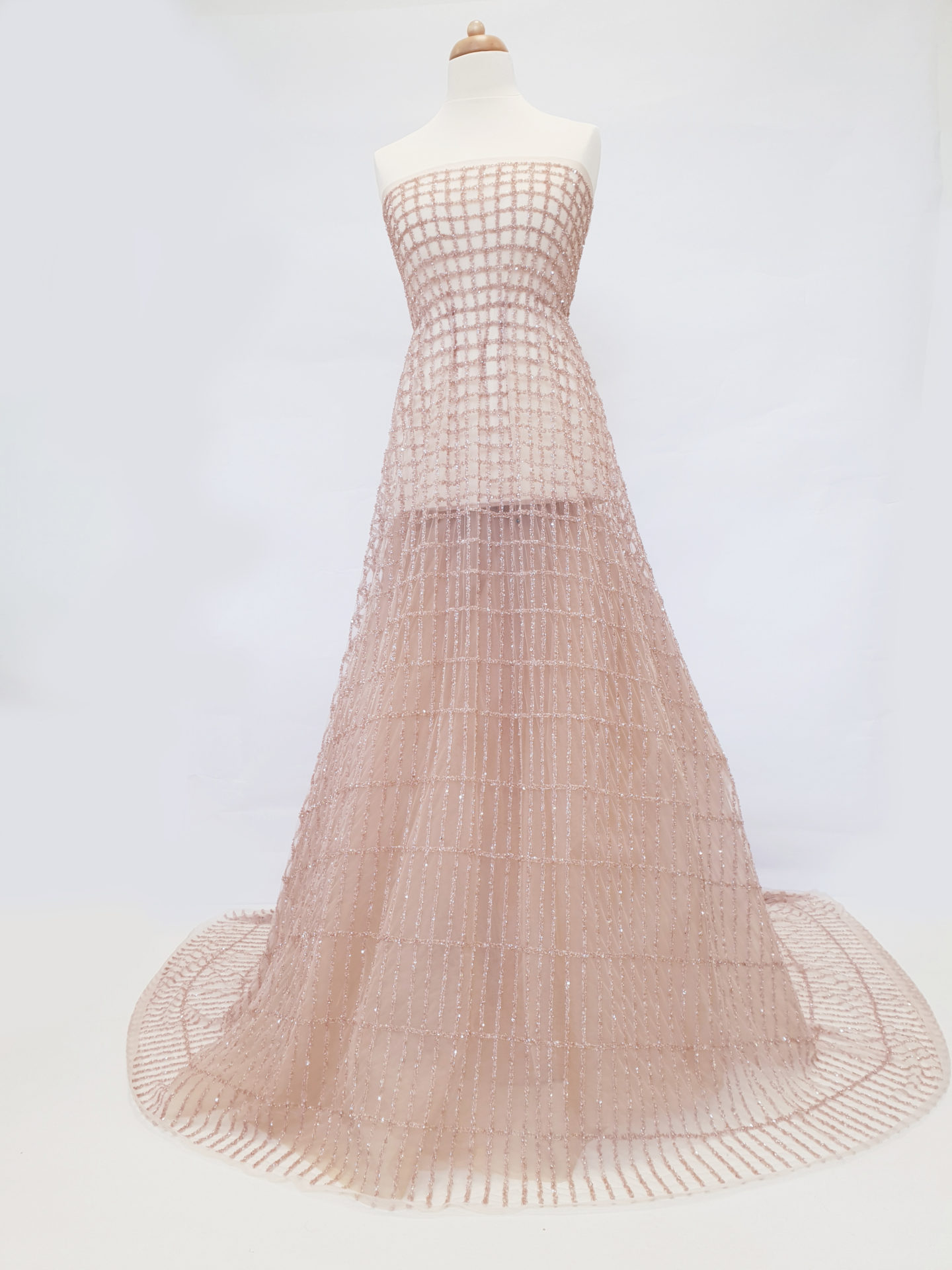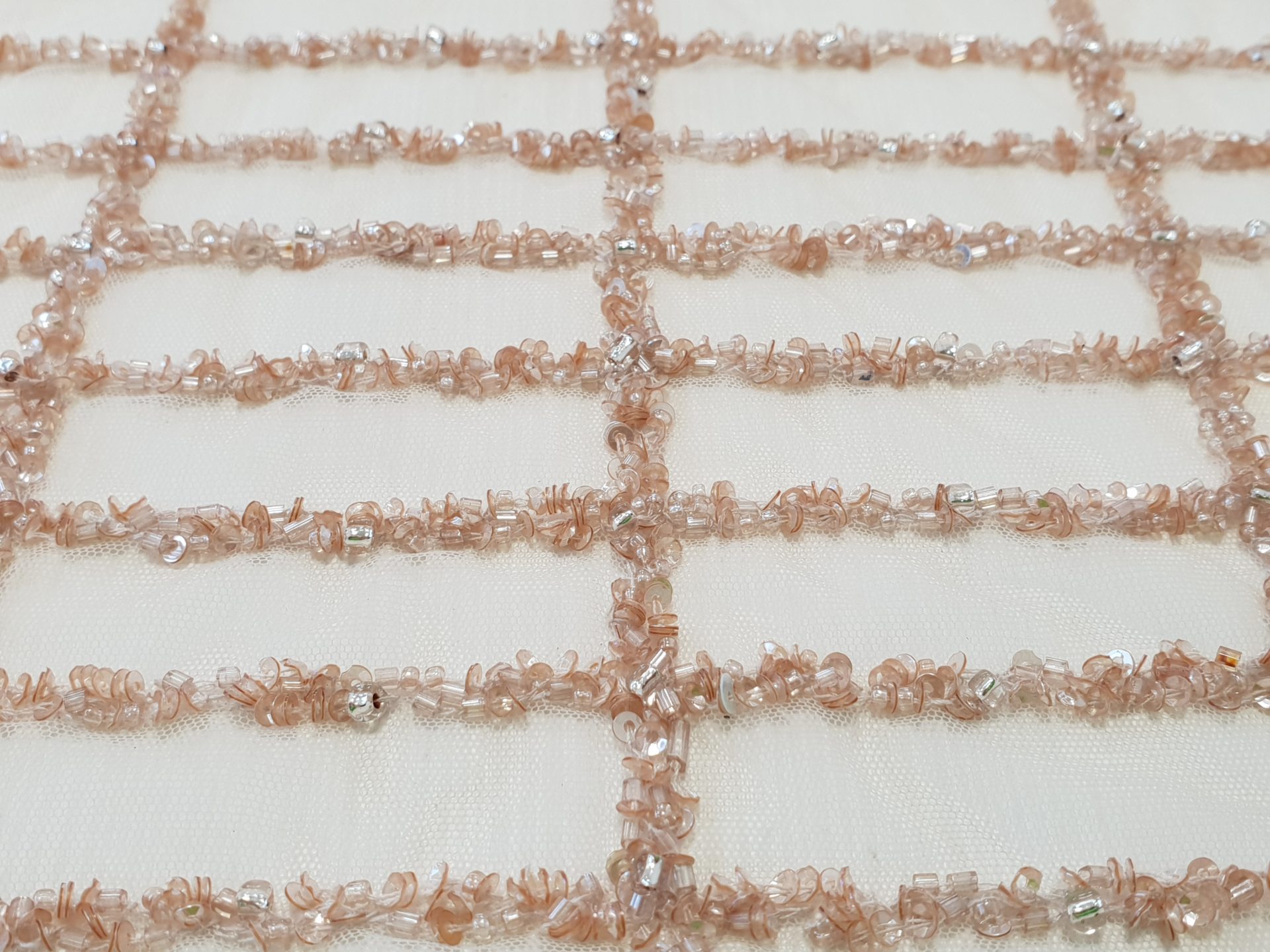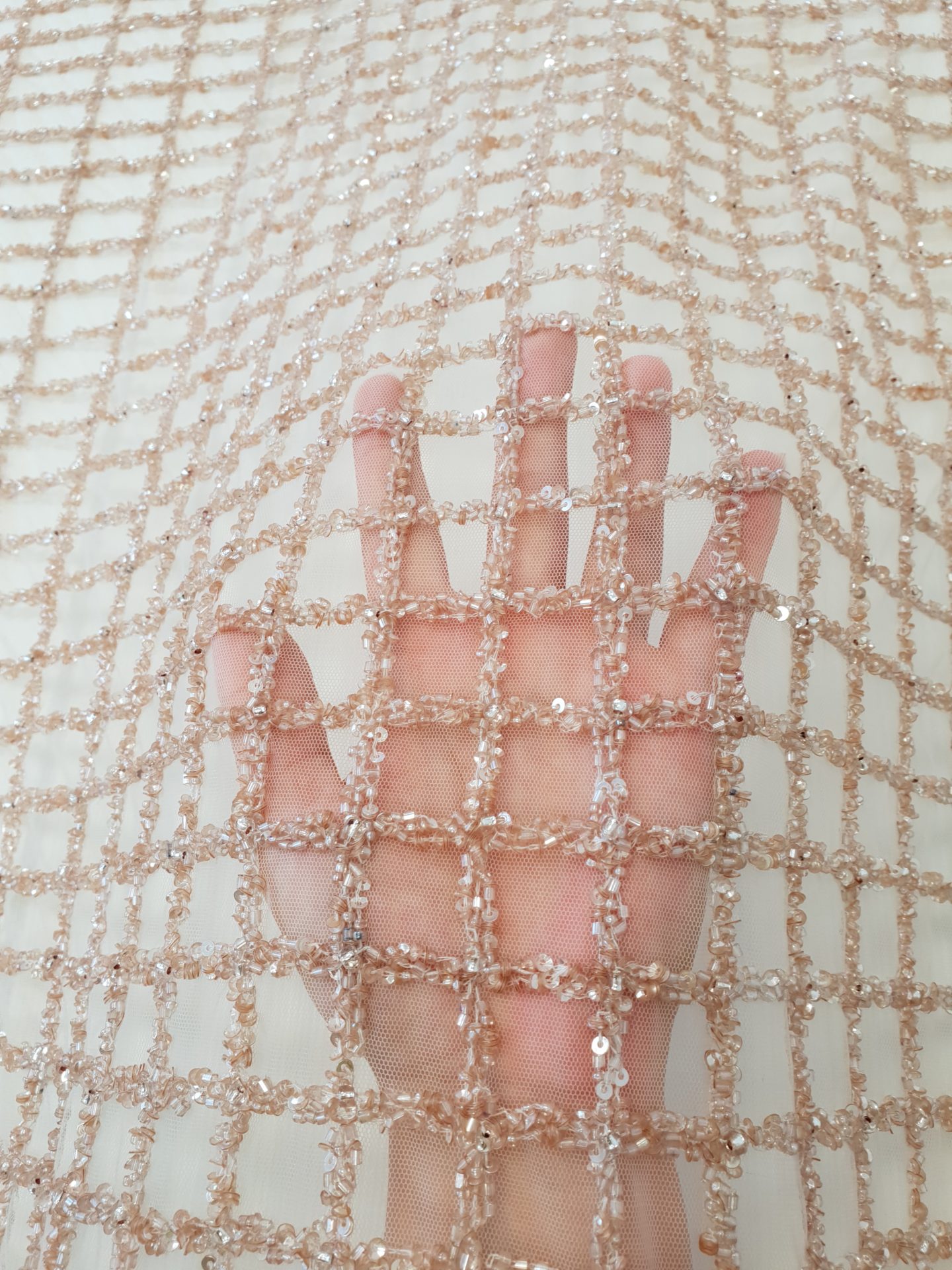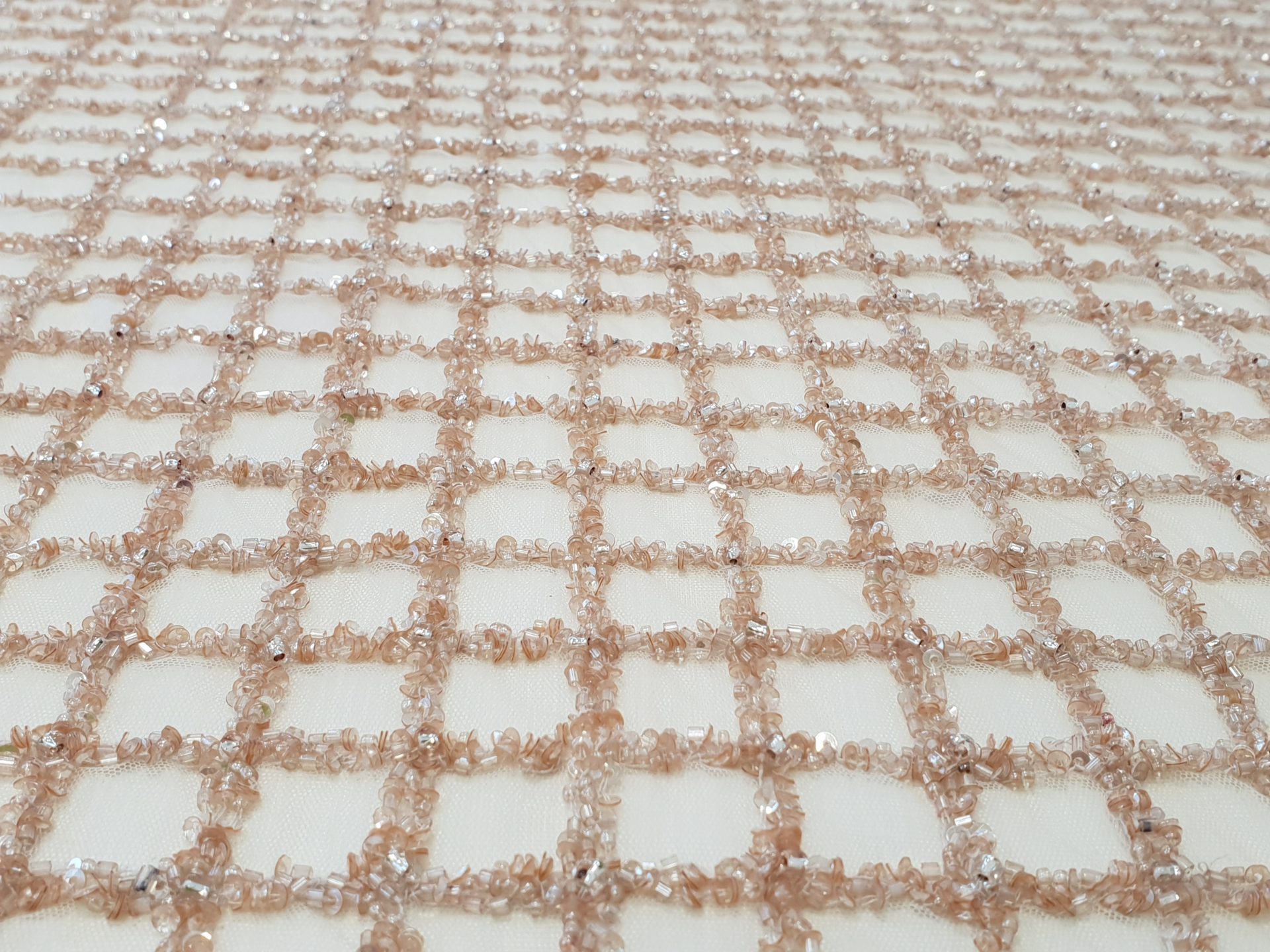 Broderie nude pudra cu motive geometrice, design Zuhair Murad, cusuta integral din margelute si paiete brodate manual pe tul nude deschis.