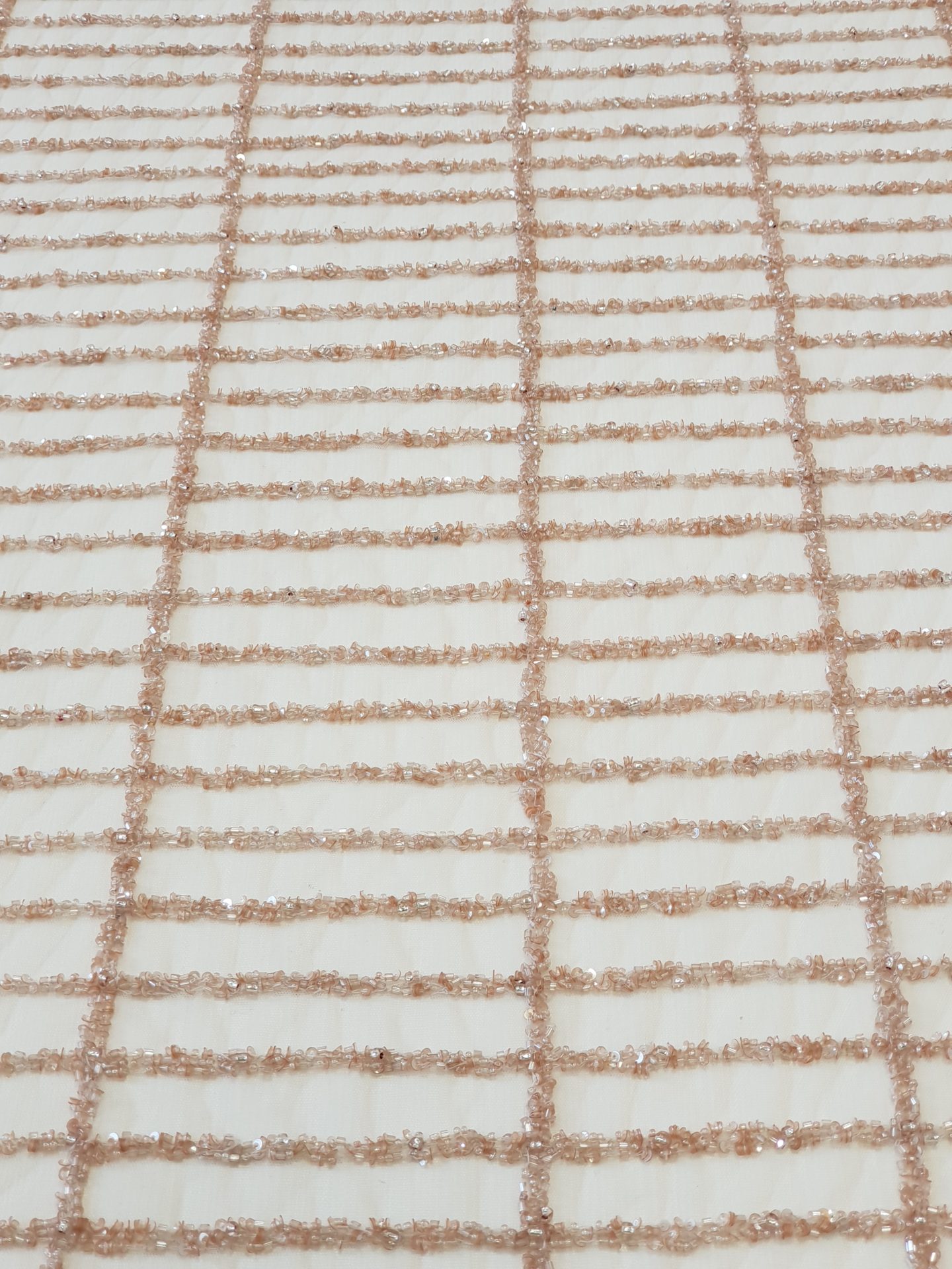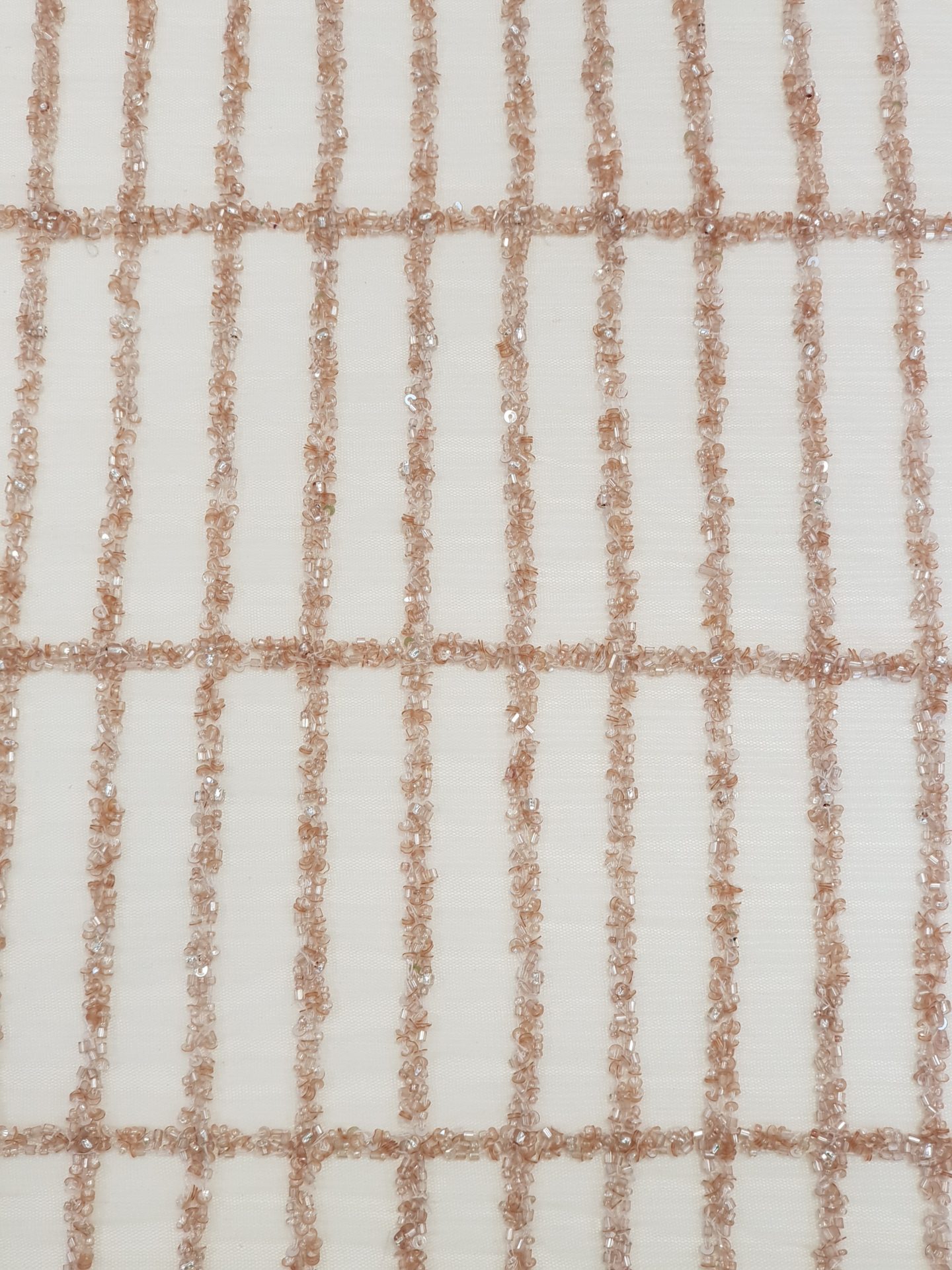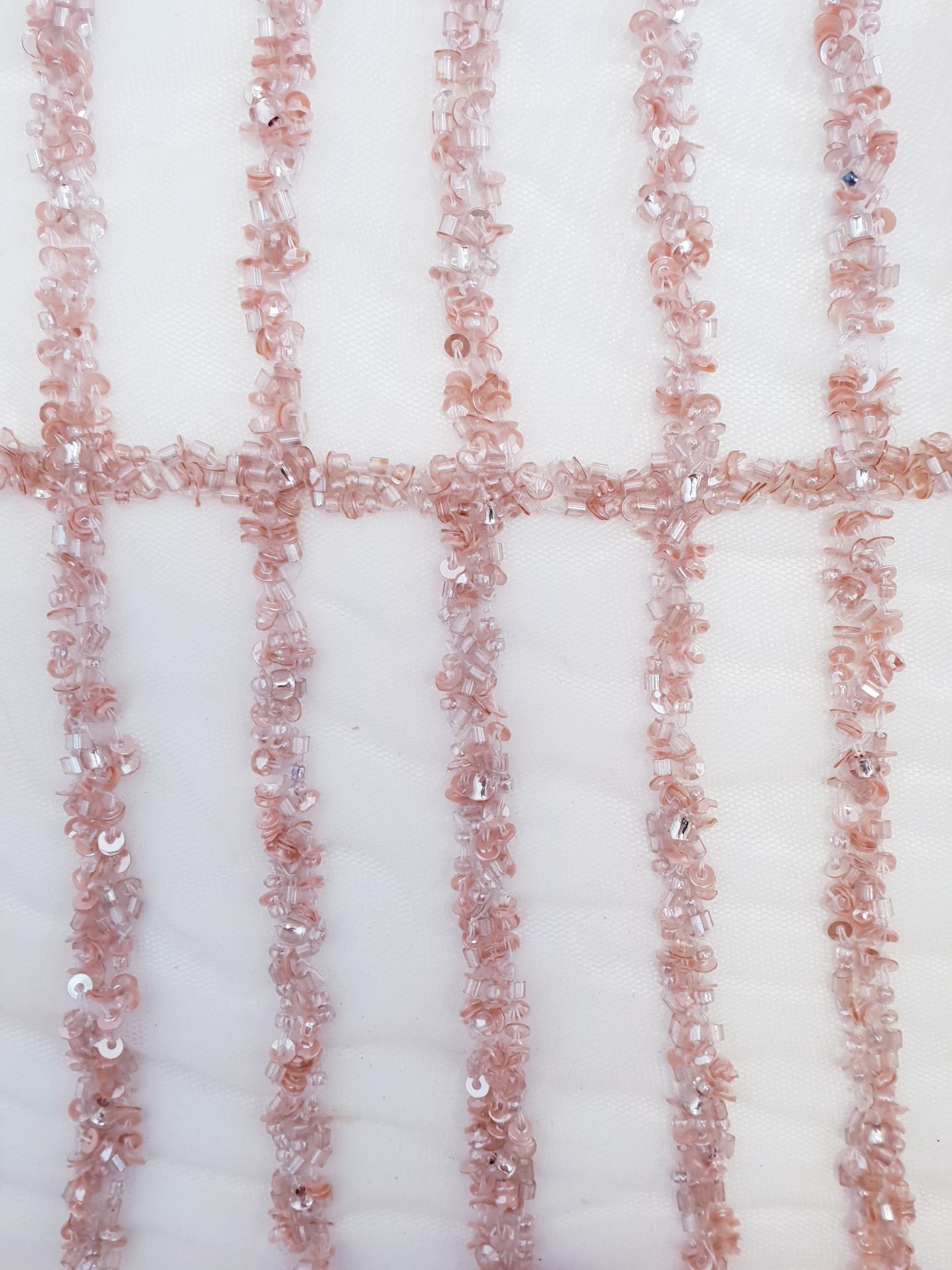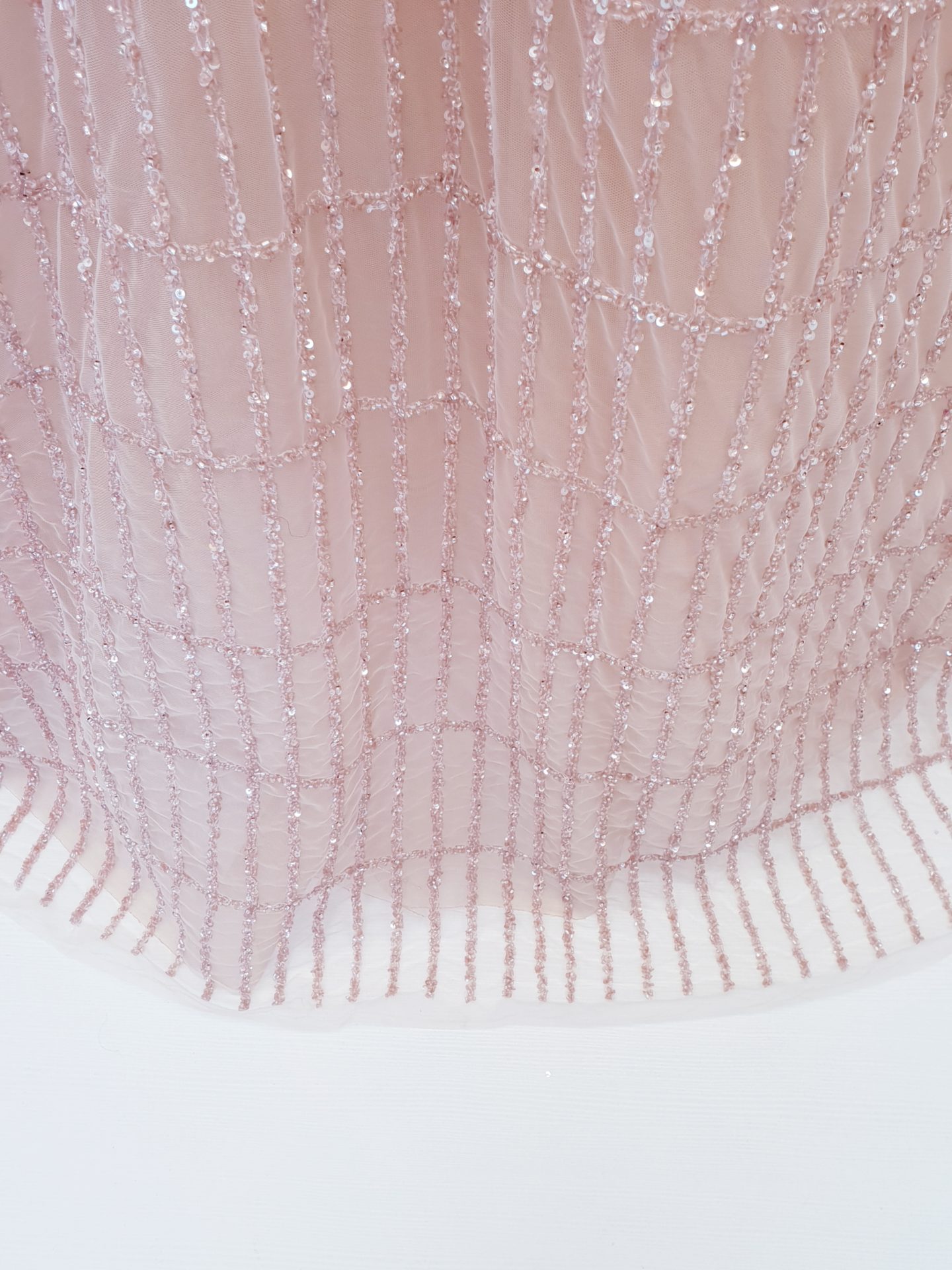 Broderie nude pudra cu motive geometrice, design Zuhair Murad, cusuta integral din margelute si paiete brodate manual pe tul nude deschis.