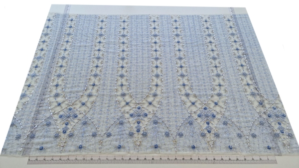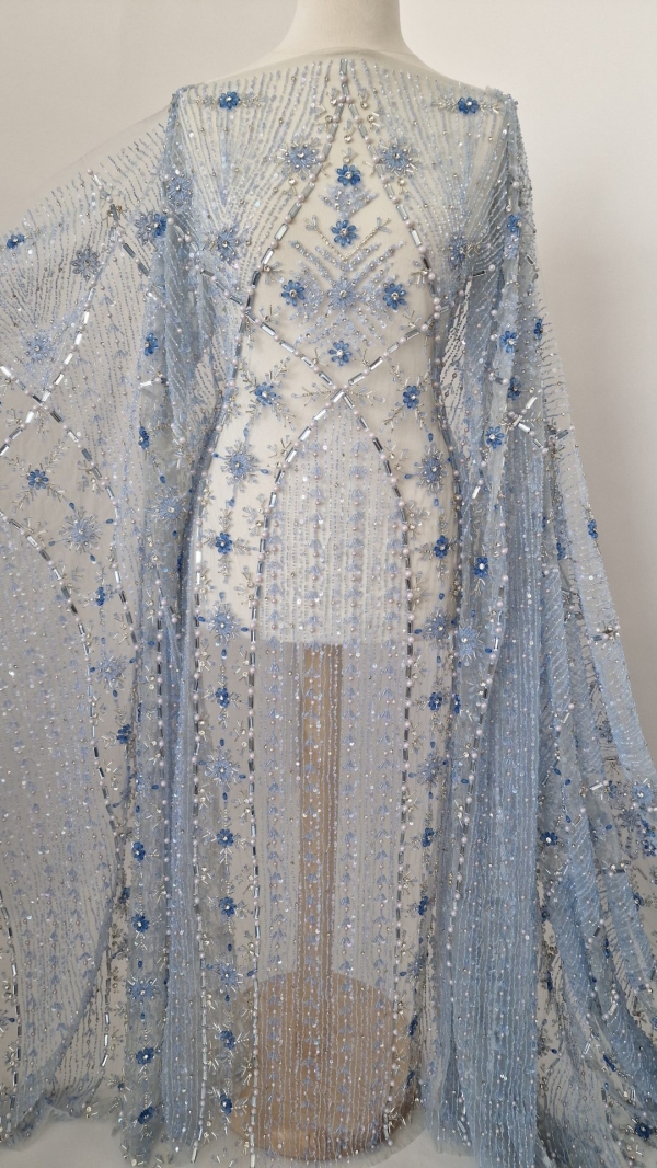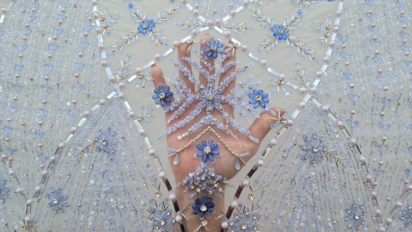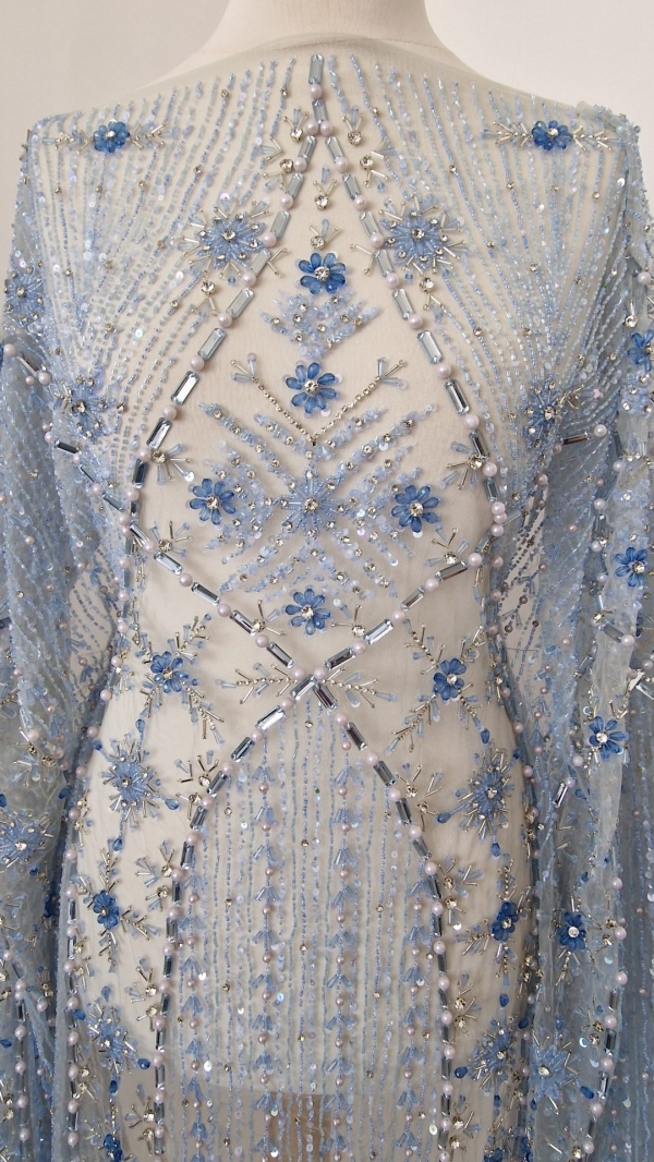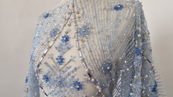 Prezent in majoritatea colectiilor de gala haute couture a celor mai renumiti designeri internationali, tulle-ul brodat manual cu accesorii de inalta calitate a devenit unul dintre cele mai ravnite materiale ce scoate din anonimat orice creatie vestimentara menita sa capteze toate privirile. Baza folosita este un tulle fin, dar rezistent si putin elastic. Aplicatiile sunt formate din margele si pietre de diferite marimi cusute manual cu fir transparent si rezistent termic. Atentia cu care au fost cusute individual face ca in momentul taierii materialului, perlele sa nu se desprinda de pe tulle chiar daca se afla la doar 1-2 mm de marginea taiata, conferind usurinta in procesul de lucru. Caracterul exclusivist este dat de faptul ca fiind lucrate manual, aceste creatii minunate sunt disponibile in cantitati mici.