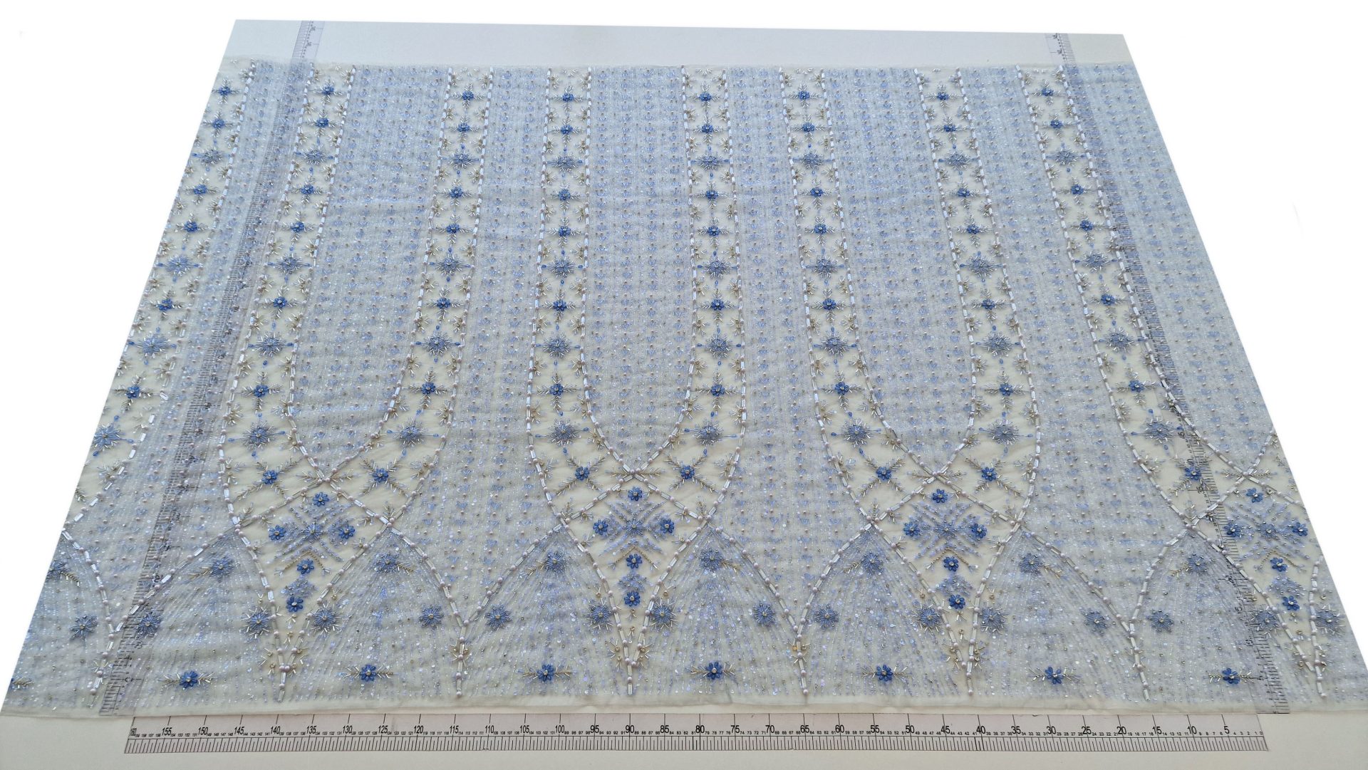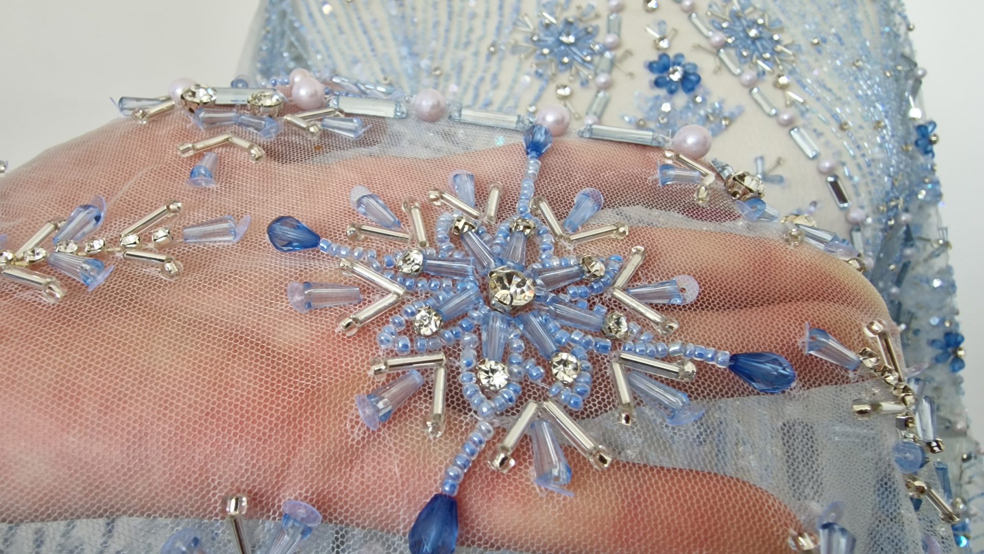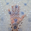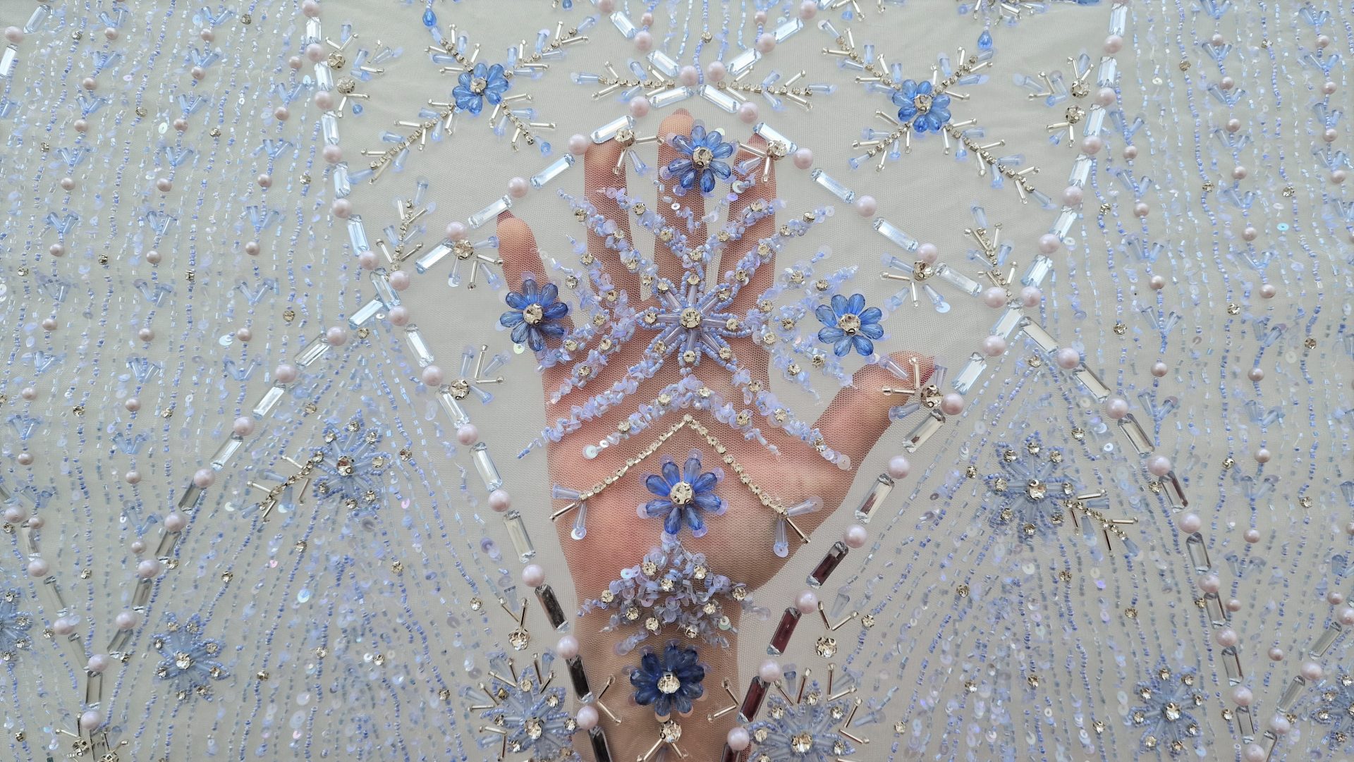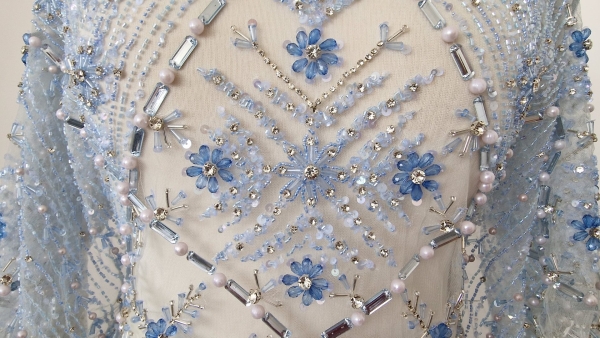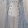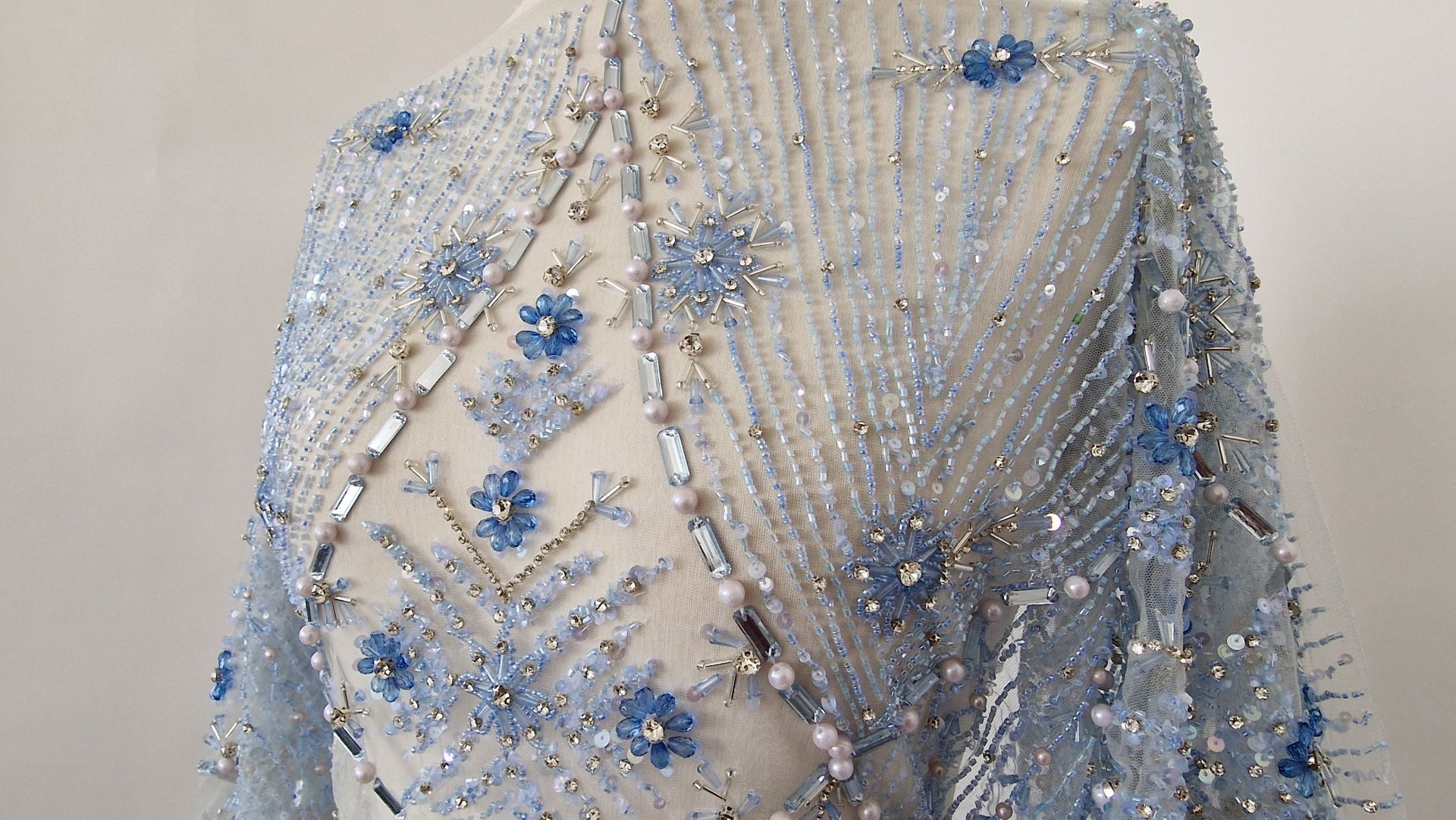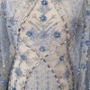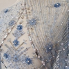 Broderie realizata manual cu accesorii ice blue Christina – margelute, micropaiete, cristale si pietre argintii, bleu deschis si bleu inchis, roz pal, de diferite dimensiuni cusute manual pe tulle gri-bleu deschis, usor elastic.