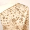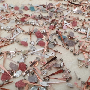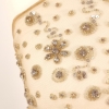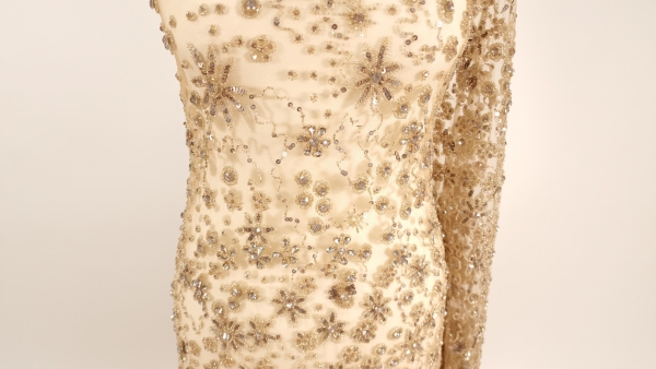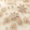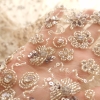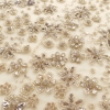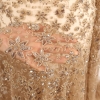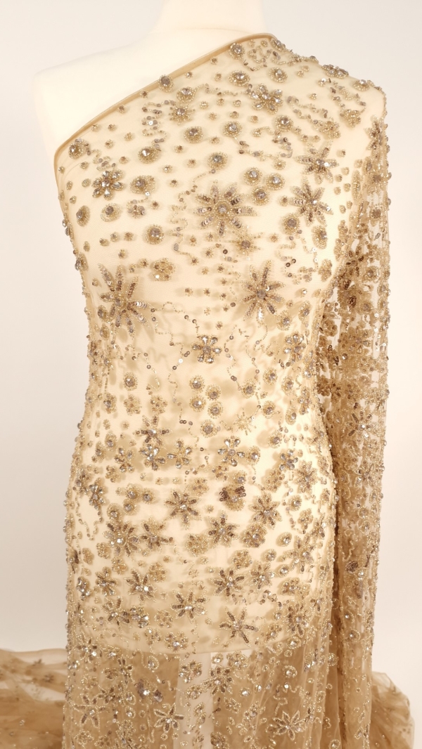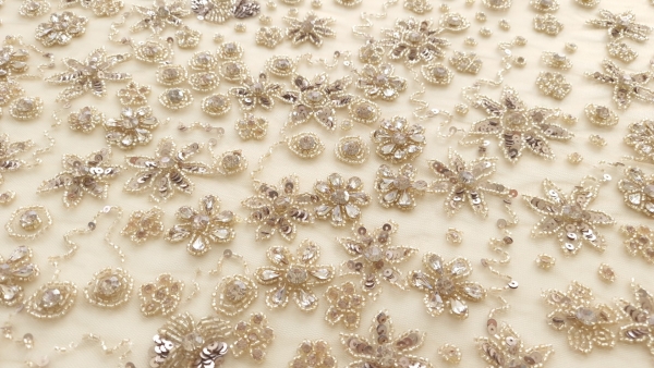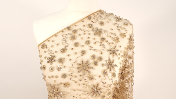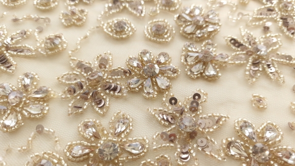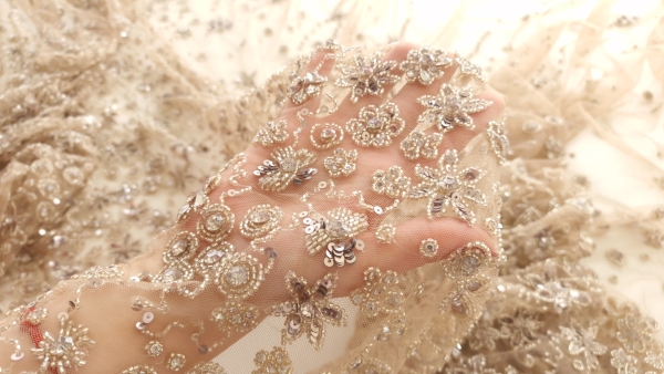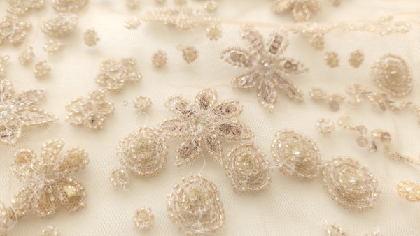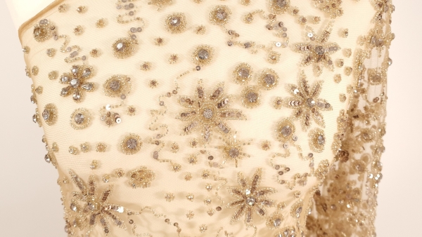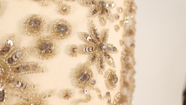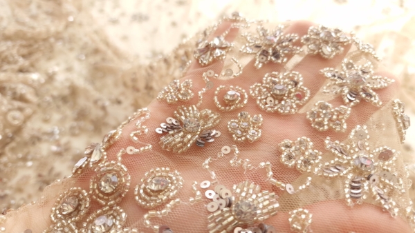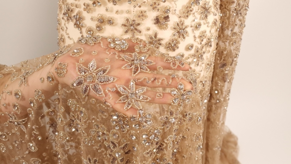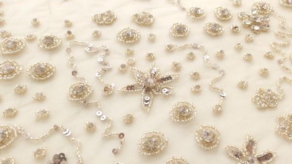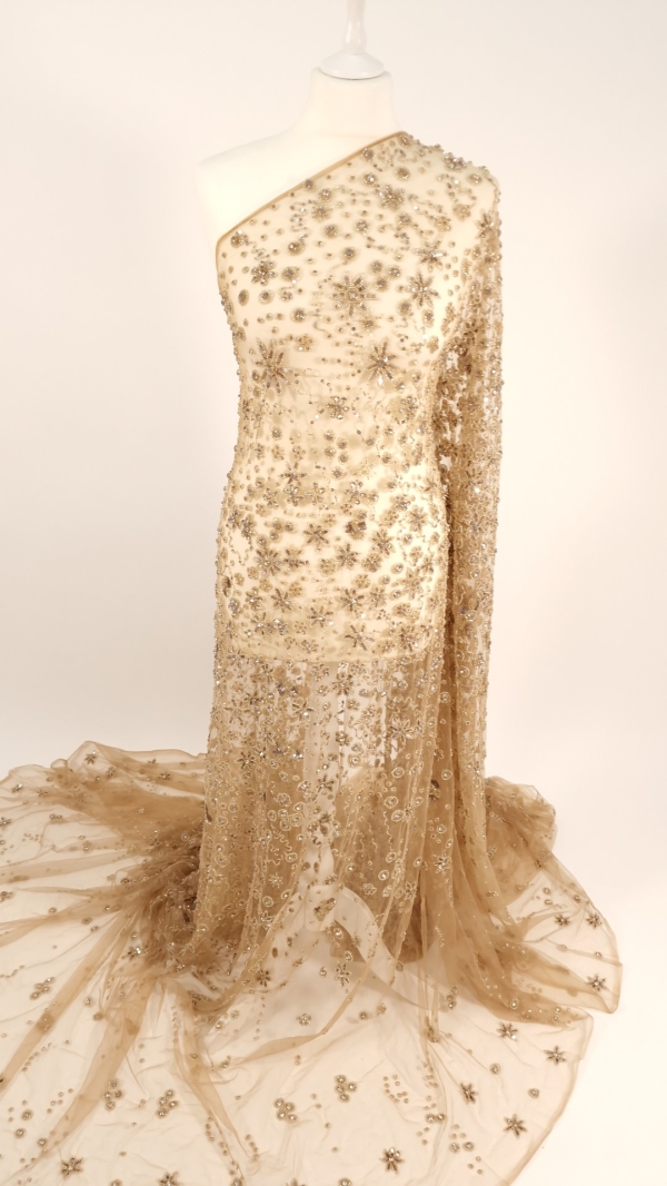 Broderia este accesorizata cu: micropaiete, pietre si margelute nude, maro deschis, de diferite dimensiuni, cusute manual pe tulle nude, usor elastic.