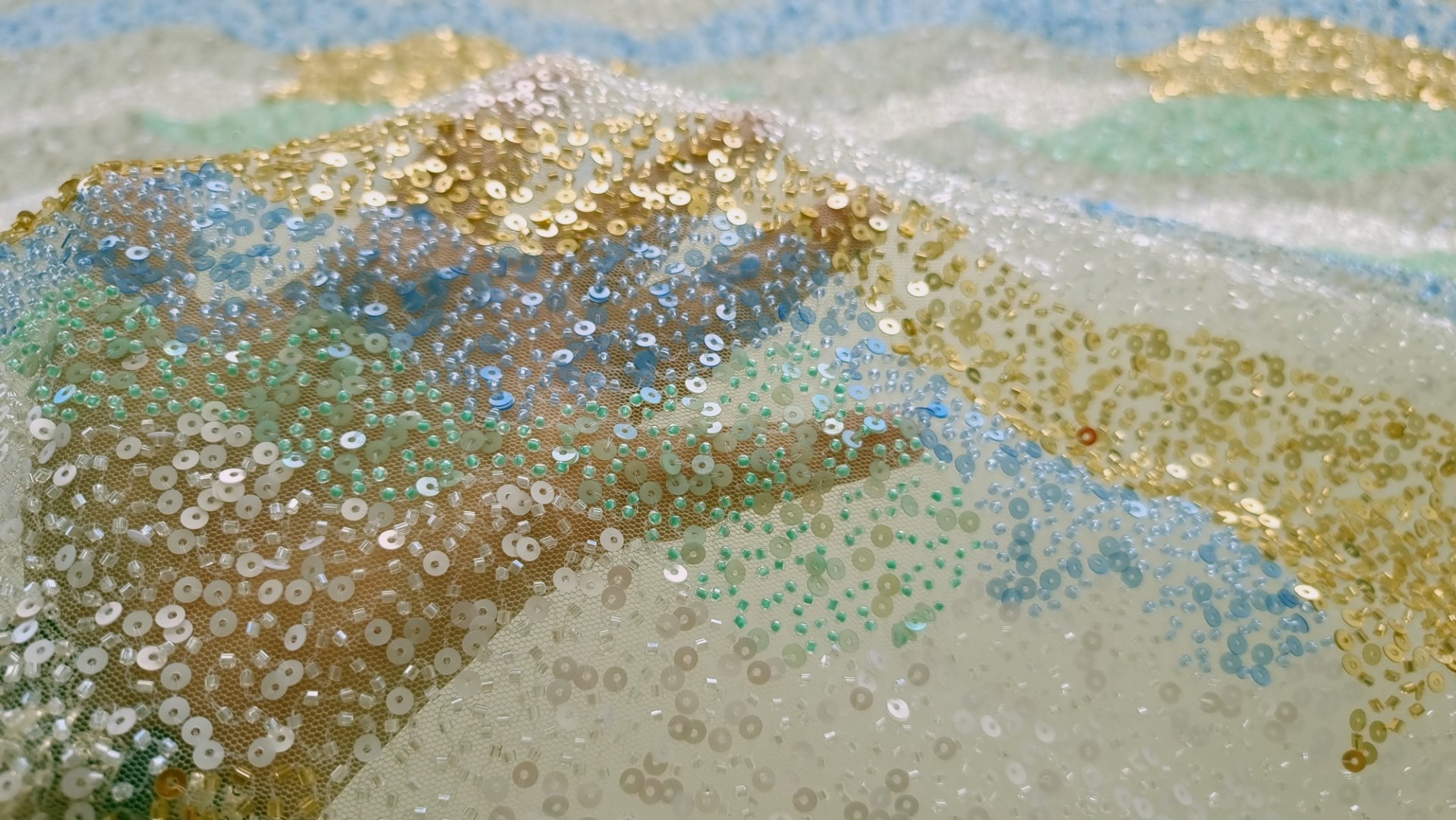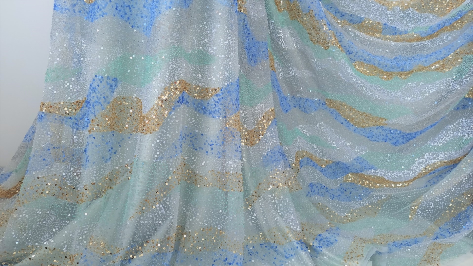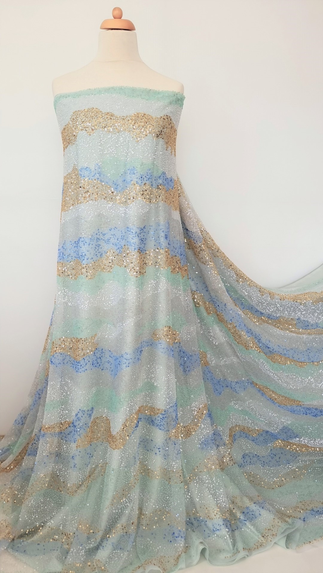 Accesoriile sunt: micropaiete si margele tubulare aurii, ivoire, verde pal si bleu, cusute manual pe tulle ivory, usor elastic.