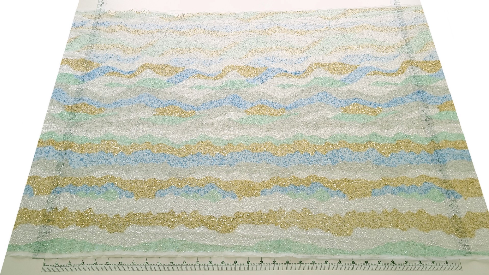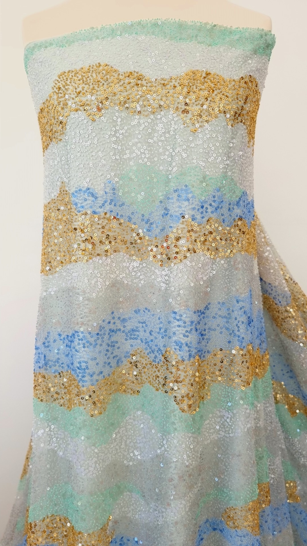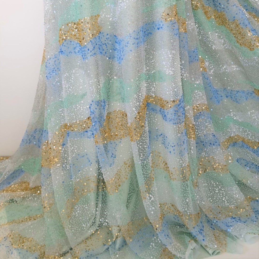 Accesoriile sunt: micropaiete si margele tubulare aurii, ivoire, verde pal si bleu, cusute manual pe tulle ivory, usor elastic.