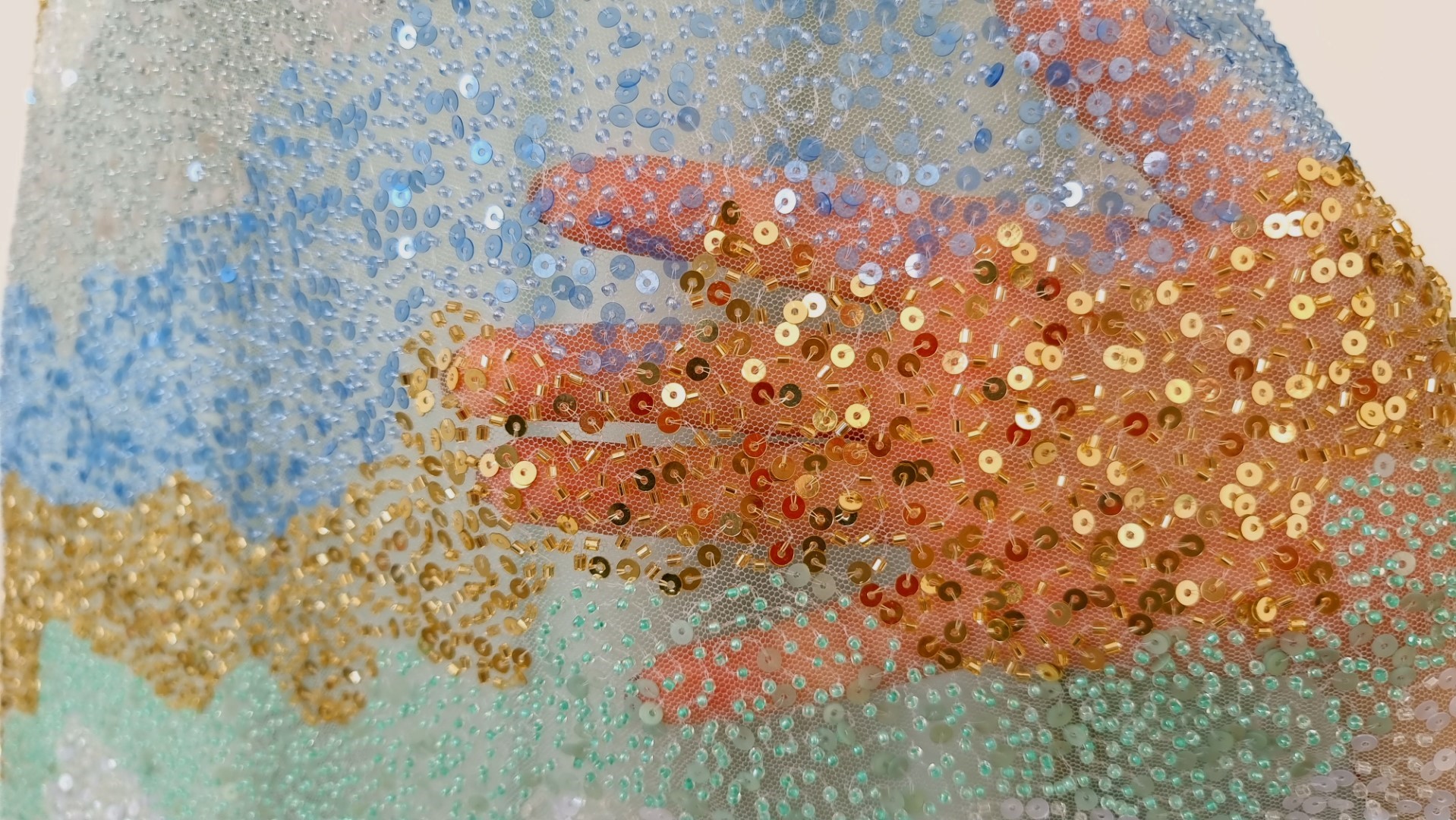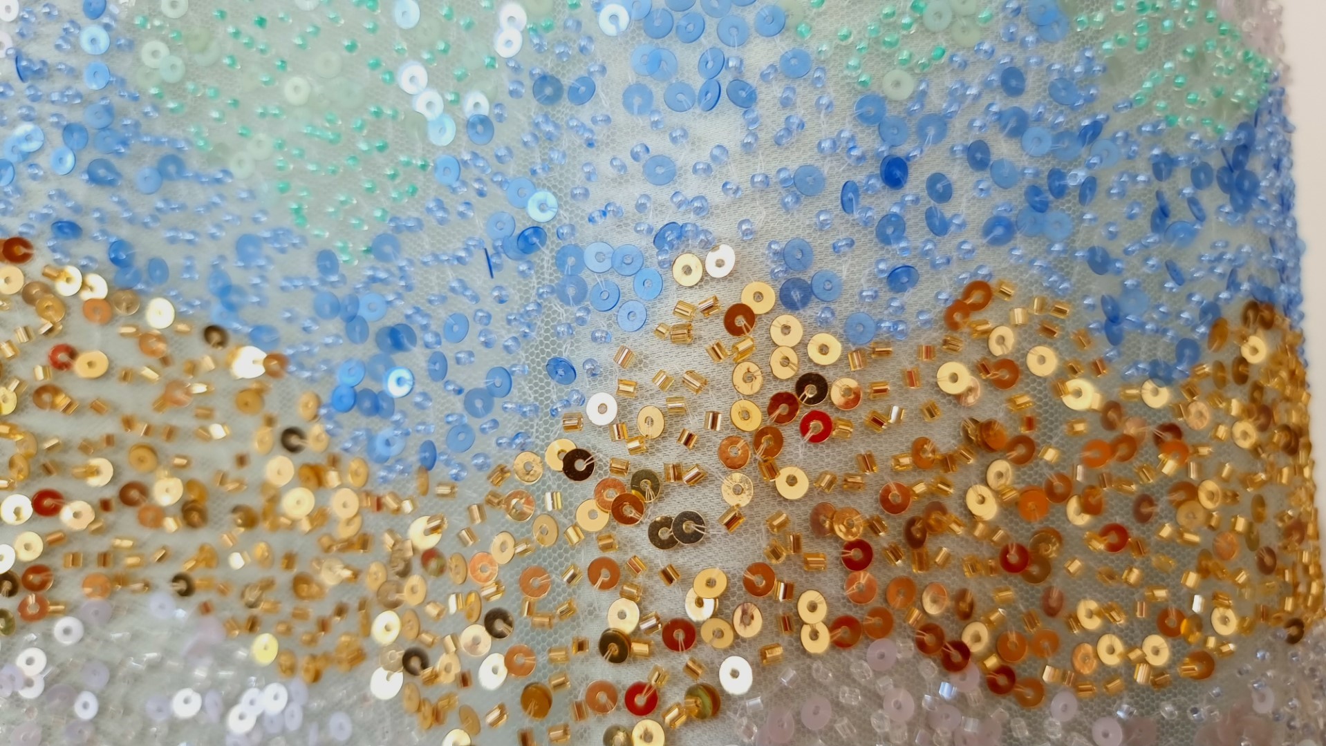 Broderie realizata manual Modern Goddess, accesorizata cu micropaiete si margele multicolore, distribuite pe intreaga suprafata.