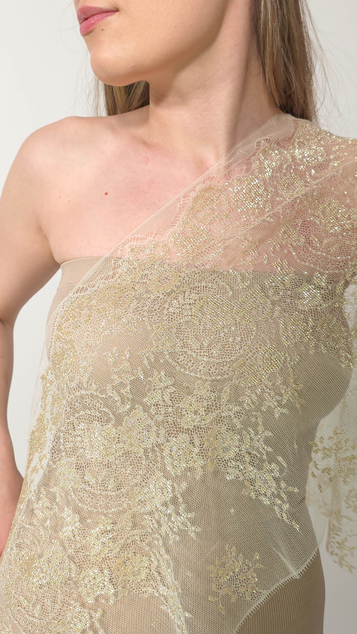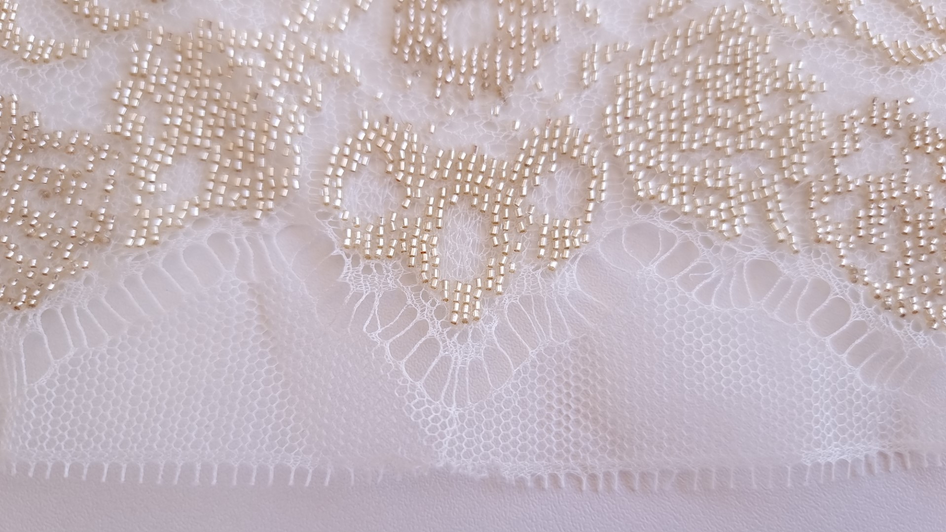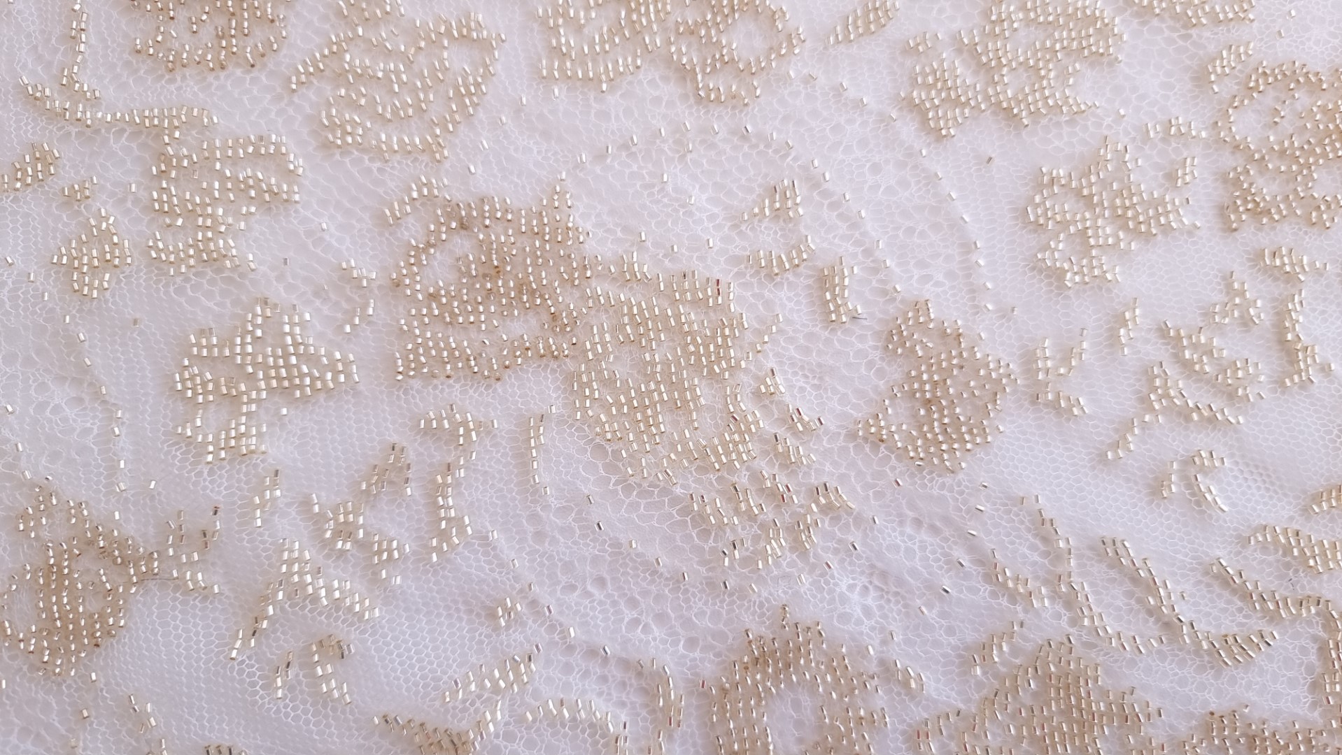 Broderie accesorizata cu margele tubulare , de culoare champagne, in ton cu tulle-ul, rezultand astfel un model deosebit, cu un design in tendinte.